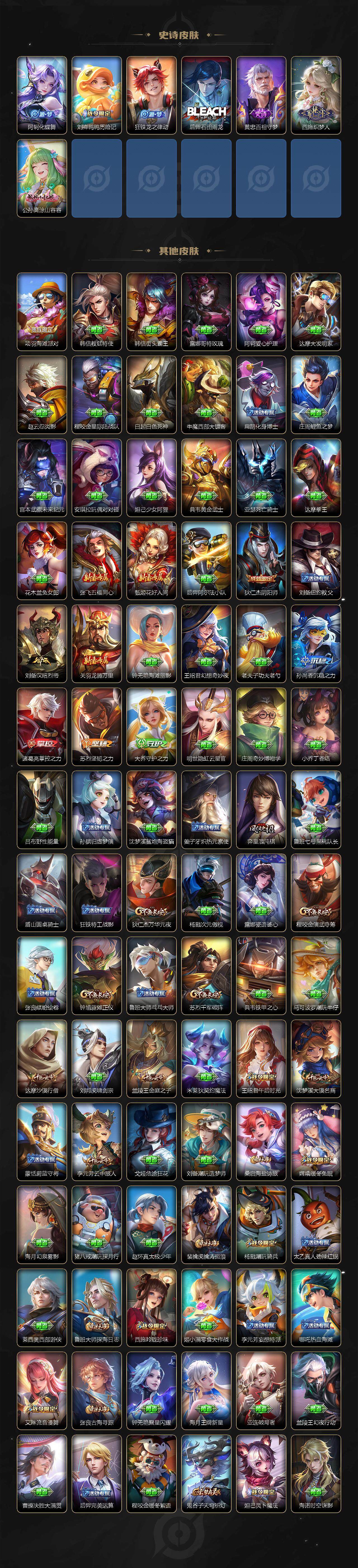 【史诗皮肤】:鲁班七号电玩小子,项羽苍穹之光,露娜紫霞仙子,赵云皇家上将,貂蝉圣诞恋歌,甄姬冰雪圆舞曲,狄仁杰魔术师,廉颇地狱岩魂,宫本武藏鬼剑武藏,孙尚香蔷薇恋人,孙尚香水果甜心,嬴政暗夜