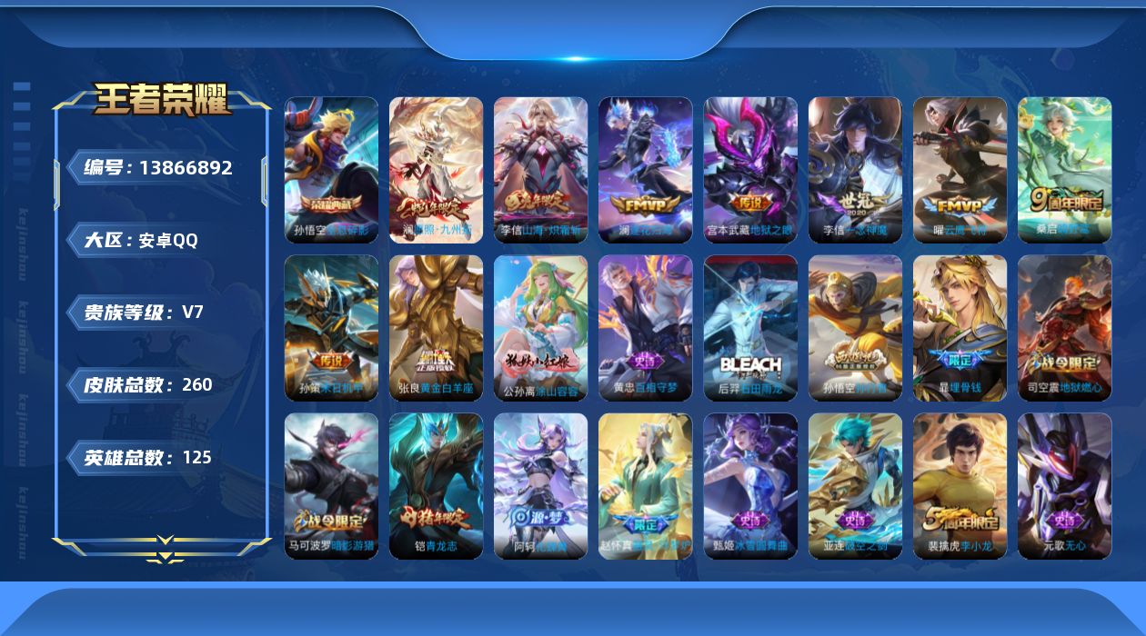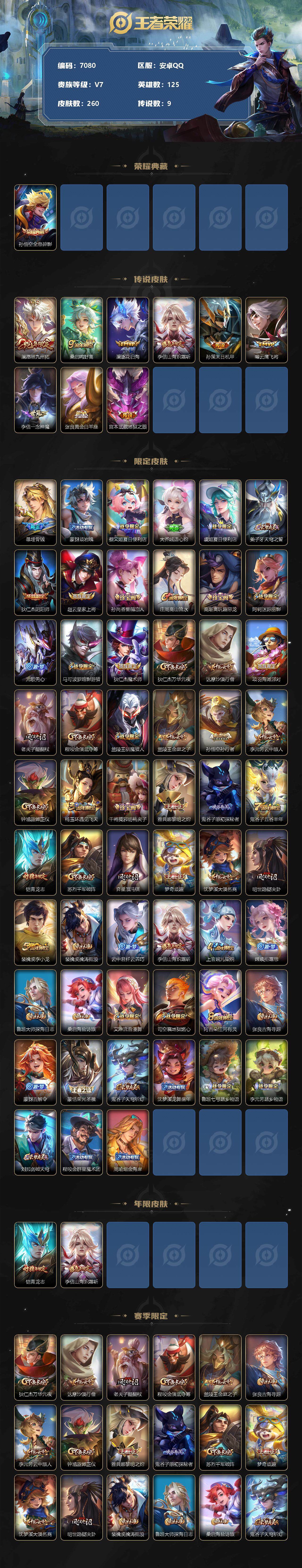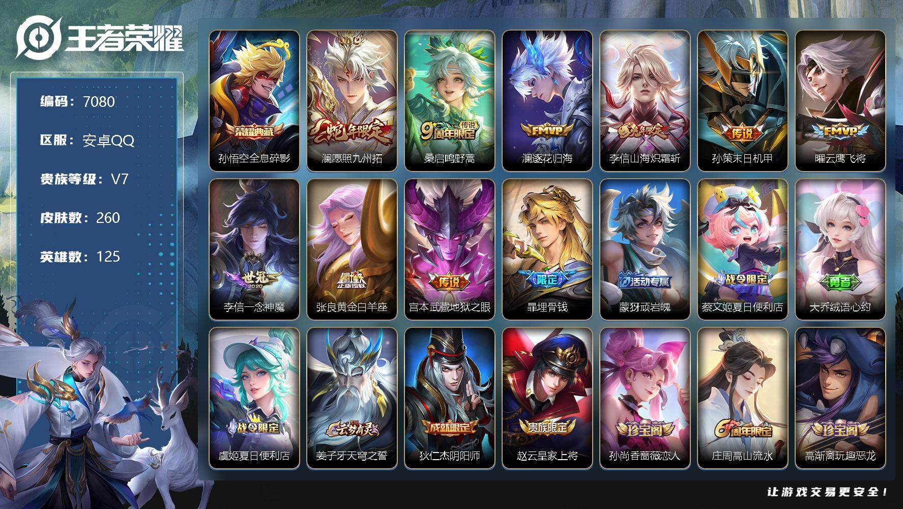 [13866892]安卓Q-V7-最强王者段位-125英雄-260皮肤-1典藏-0珍品无双-0无双-0珍品传说-9传说-69史诗