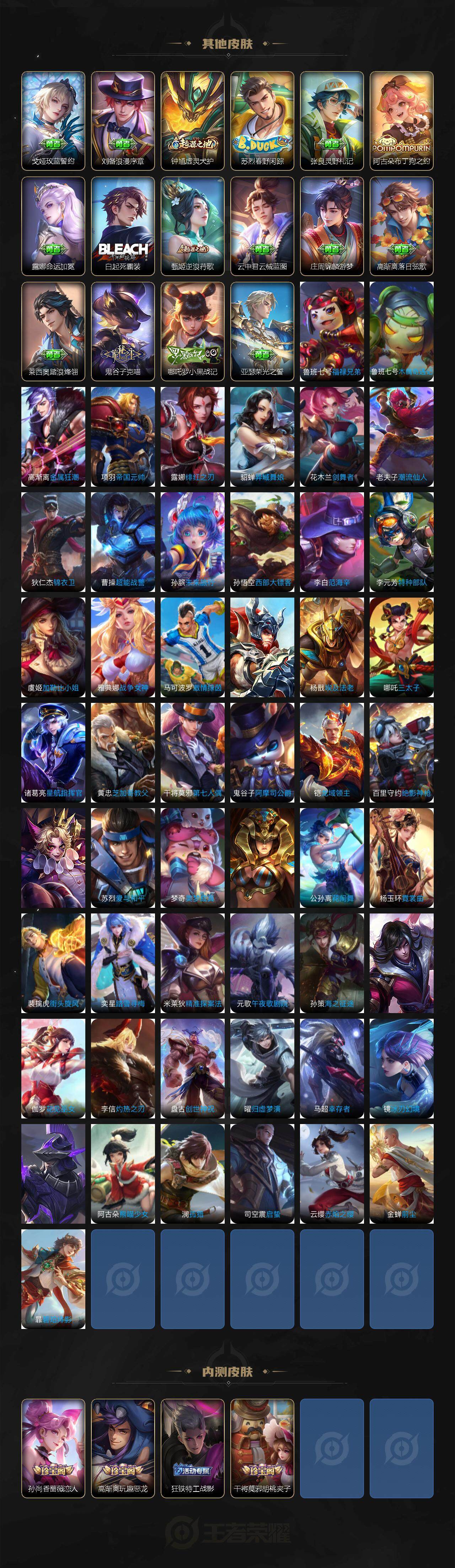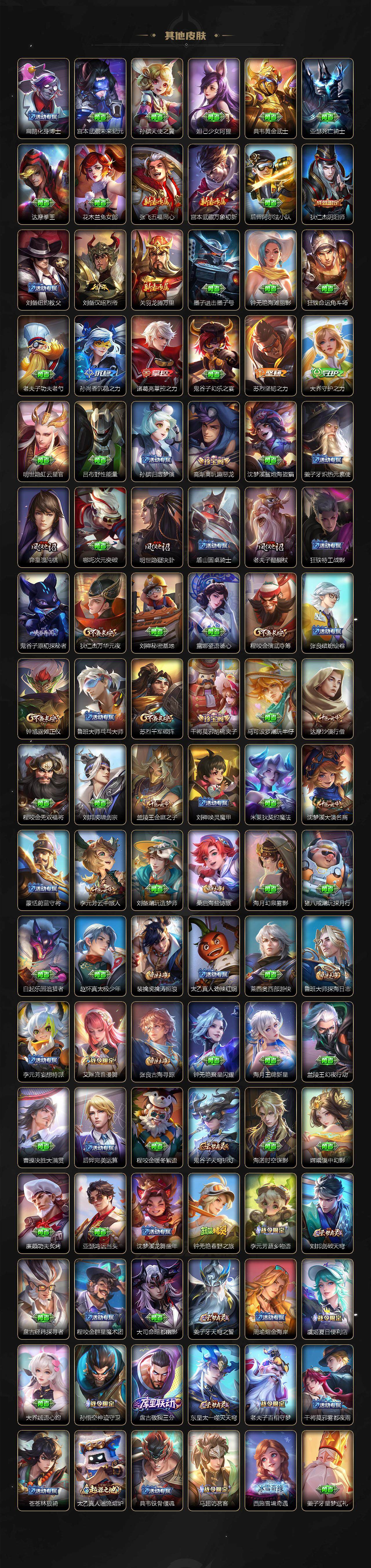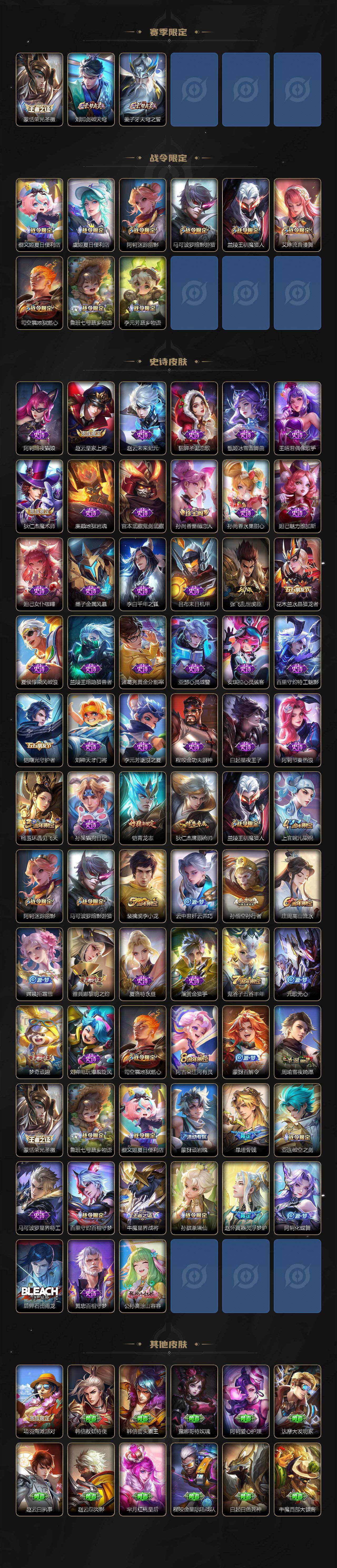 【限定皮肤】:暃埋骨钱,蒙犽顽岩魄,蔡文姬夏日便利店,大乔绒语心约,虞姬夏日便利店,姜子牙天穹之誓,狄仁杰阴阳师,赵云皇家上将,孙尚香蔷薇恋人,庄周高山流水,高渐离玩趣恶龙,阿轲迷踪丽影,元歌无心,马可波罗暗影游猎,狄仁杰魔术师,狄仁杰万华元夜,达摩沙漠行僧,项羽海滩派对,老夫子醍醐杖,程咬金演武夺筹,兰陵王驯魔猎人,兰陵王金庭之子,孙悟空孙行者,李元芳云中旅人,钟馗驱傩正仪,杨玉环遇见飞天,干将莫邪胡桃夹子,雅典娜黎明之约,鬼谷子原初探秘者,鬼谷子五谷丰年,铠青龙志,苏烈千军破阵,弈星混沌棋,梦奇顽趣,沈梦溪大漠名商,明世隐疑决卦,裴擒虎李小龙,裴擒虎擒涛扼浪,云中君纤云弄巧,李信山海炽霜斩,上官婉儿梁祝,嫦娥拒霜思,鲁班大师探海日志,桑启海盐诗旅,艾琳流音漫舞,司空震地狱燃心,阿古朵江河有灵,张良古海寻踪,蒙犽百解令,蒙恬荣光圣徽,鬼谷子天穹祈灯,沈梦溪龙舞盛年,鲁班七号蔬乡物语,李元芳蔬乡物语,刘邦剑破天穹,程咬金群星魔术团,周瑜熔金海岸
