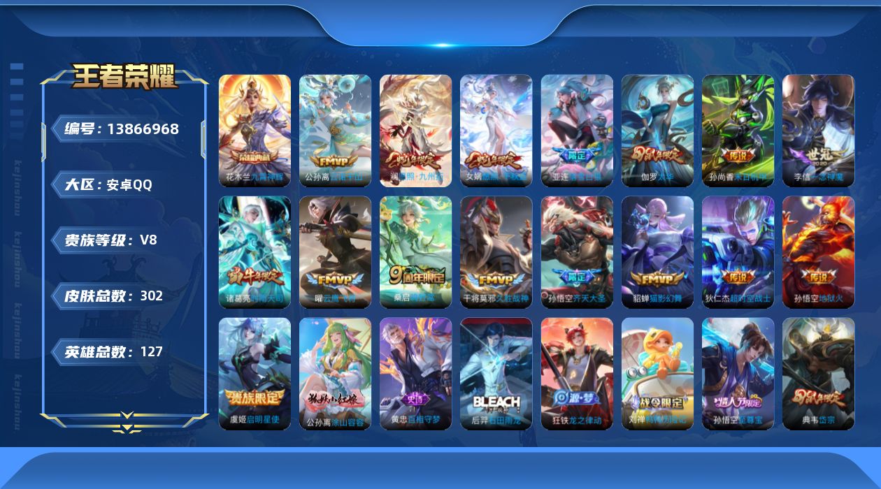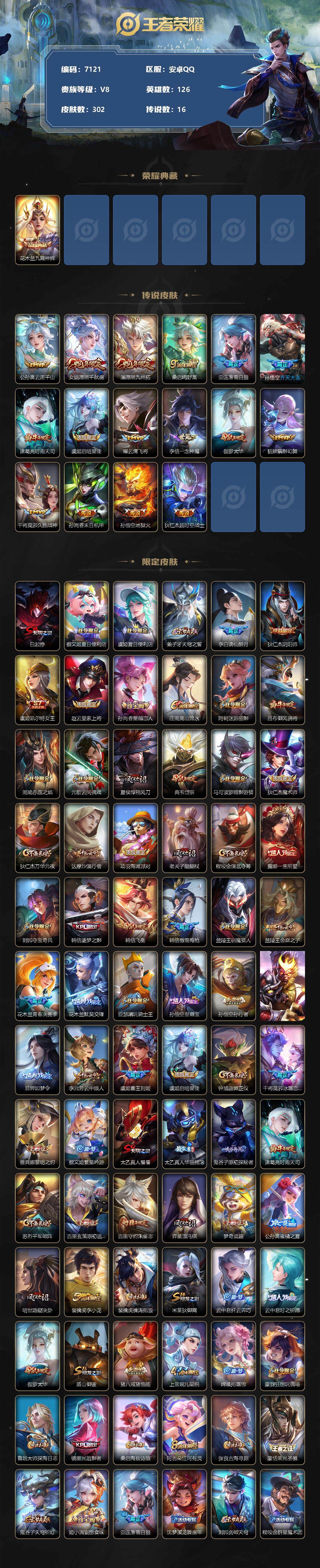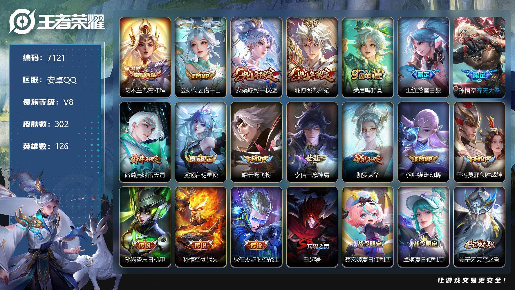 [13866968]安卓Q-V8-最强王者段位-126英雄-302皮肤-1典藏-0珍品无双-0无双-0珍品传说-16传说-91史诗