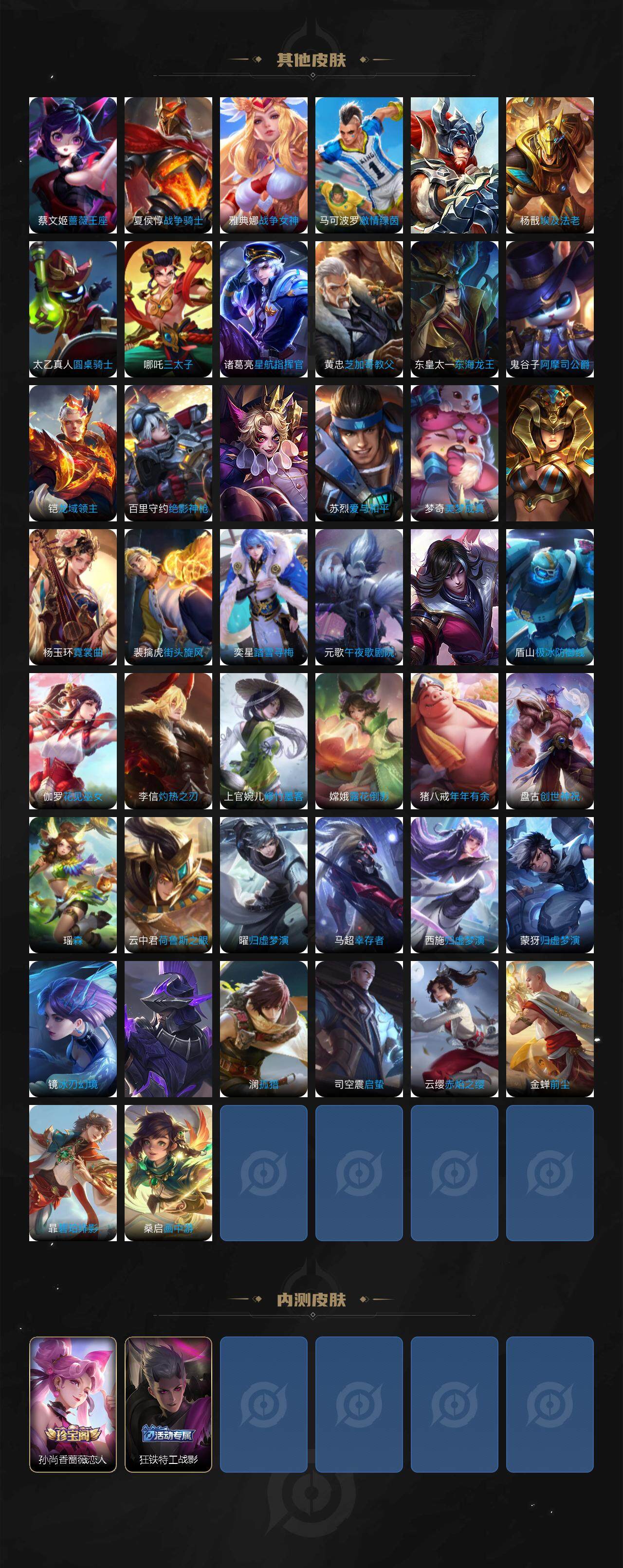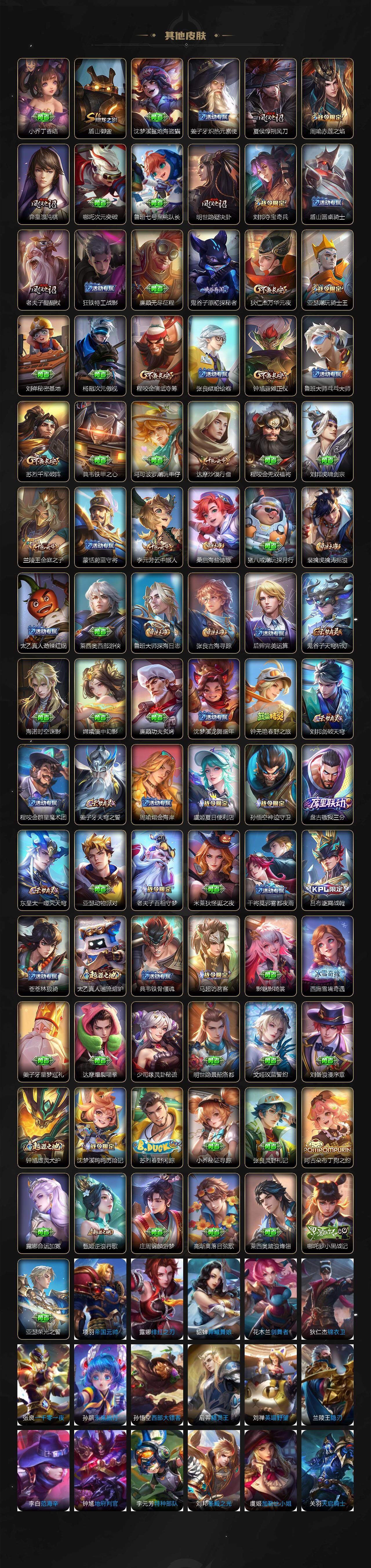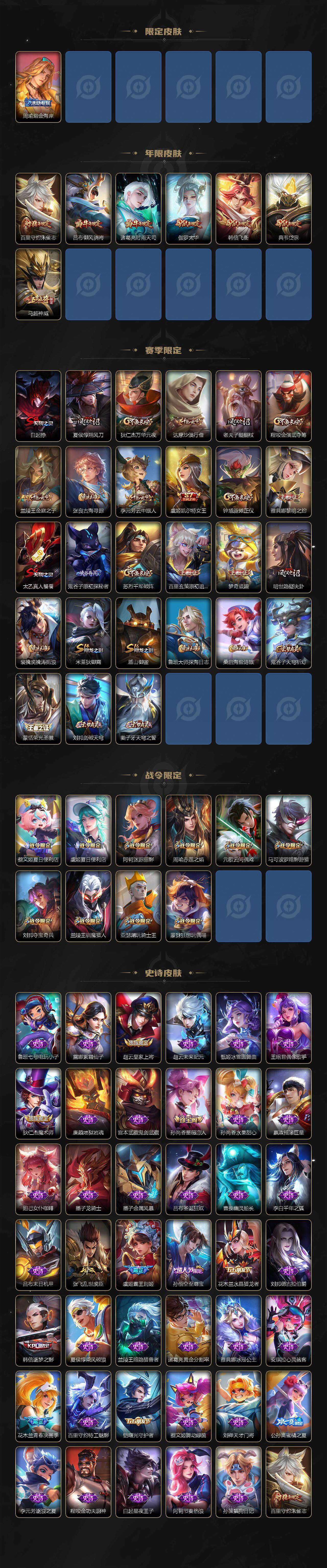 【限定皮肤】:白起狰,蔡文姬夏日便利店,虞姬夏日便利店,姜子牙天穹之誓,李白谪仙醉月,狄仁杰阴阳师,虞姬凯尔特女王,赵云皇家上将,孙尚香蔷薇恋人,庄周高山流水,阿轲迷踪丽影,吕布御风骁将,周瑜赤莲之焰,元歌云间偶戏,夏侯惇朔风刀,典韦岱宗,马可波罗暗影游猎,狄仁杰魔术师,狄仁杰万华元夜,达摩沙漠行僧,项羽海滩派对,老夫子醍醐杖,程咬金演武夺筹,露娜一生所爱,刘邦夺宝奇兵,韩信逐梦之影,韩信飞衡,韩信傲雪梅枪,兰陵王驯魔猎人,兰陵王金庭之子,花木兰青春决赛季,花木兰默契交锋,亚瑟潮玩骑士王,孙悟空至尊宝,孙悟空孙行者,孙悟空齐天大圣,后羿如梦令,李元芳云中旅人,虞姬霸王别姬,虞姬启明星使,钟馗驱傩正仪,干将莫邪冰霜恋舞曲,雅典娜黎明之约,蔡文姬繁星吟游,太乙真人饕餮,太乙真人华丽摇滚,鬼谷子原初探秘者,诸葛亮时雨天司,苏烈千军破阵,百里玄策原初追逐者,百里守约朱雀志,弈星混沌棋,梦奇顽趣,公孙离蜜橘之夏,明世隐疑决卦,裴擒虎李小龙,裴擒虎擒涛扼浪,米莱狄御霄,云中君纤云弄巧,云中君时之祈愿,伽罗太华,盾山御銮,猪八戒猪悟能,上官婉儿梁祝,嫦娥拒霜思,蒙犽狂想玩偶喵,鲁班大师探海日志,镜匿光追影者,桑启海盐诗旅,阿古朵江河有灵,张良古海寻踪,蒙恬荣光圣徽,鬼谷子天穹祈灯,姬小满妄想食味,亚连落雪白狼,沈梦溪龙舞盛年,刘邦剑破天穹,程咬金群星魔术团,周瑜熔金海岸