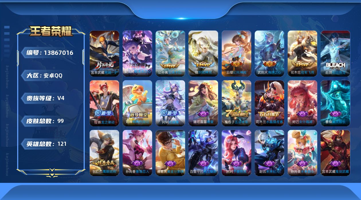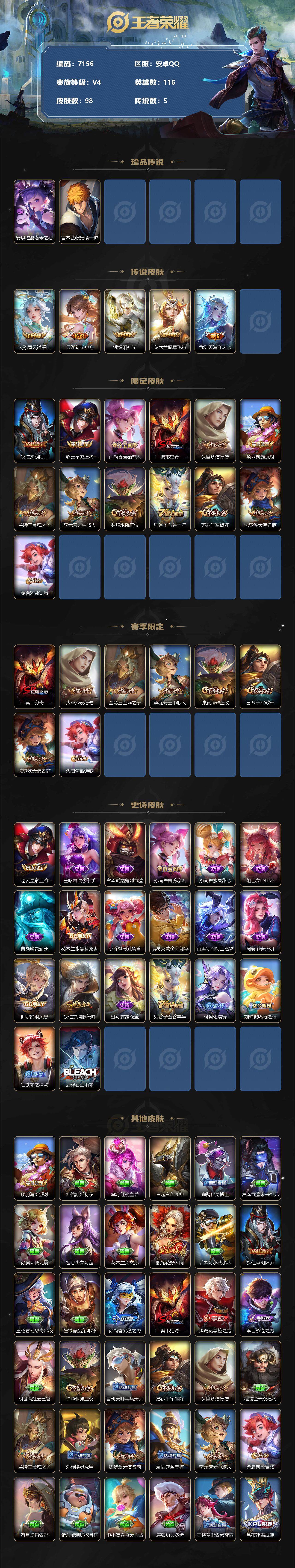 [13867016]安卓Q-V4-永恒钻石II段位-116英雄-98皮肤-0典藏-0珍品无双-0无双-2珍品传说-5传说-20史诗 【珍品传说】:安琪拉酷洛米之心,宫本武藏黑崎一护 【传说皮肤】:公孙离云诺千山,云缨幻光神枪,镜炽阳神光,花木兰冠军飞将,武则天海洋之心 【限定皮肤】:狄仁杰阴阳师,赵云皇家上将,孙尚香蔷薇恋人,典韦穷奇,达摩沙漠行僧,项羽海滩派对,兰陵王金庭之子,李元芳云中旅人,钟馗驱傩正仪,鬼谷子五谷丰年,苏烈千军破阵,沈梦溪大漠名商,桑启海盐诗旅 【赛季限定】:典韦穷奇,达摩沙漠行僧,兰陵王金庭之子,李元芳云中旅人,钟馗驱傩正仪,苏烈千军破阵,沈梦溪大漠名商,桑启海盐诗旅 【史诗皮肤】:赵云皇家上将,王昭君偶像歌手,宫本武藏鬼剑武藏,孙尚香蔷薇恋人,孙尚香水果甜心,妲己女仆咖啡,曹操幽灵船长,花木兰水晶猎龙者,小乔缤纷独角兽,诸葛亮黄金分割率,百里守约特工魅影,阿轲节奏热浪,伽罗箭羽风息,狄仁杰鹰眼统帅,娜可露露晚萤,鬼谷子五谷丰年,阿轲化蝶舞,刘禅鸭鸭历险记,狂铁龙之律动,后羿石田雨龙 【其他皮肤】:项羽海滩派对,韩信教廷特使,芈月红桃皇后,白起白色死神,扁鹊化身博士,宫本武藏未来纪元,孙膑天使之翼,妲己少女阿狸,花木兰兔女郎,甄姬花好人间,后羿阿尔法小队,狄仁杰阴阳师,王昭君幻想奇妙夜,狂铁命运角斗场,孙尚香沉稳之力,典韦穷奇,诸葛亮掌控之力,李白敏锐之力,明世隐虹云星官,钟馗驱傩正仪,鲁班大师乓乓大师,苏烈千军破阵,达摩沙漠行僧,程咬金无双福将,兰陵王金庭之子,刘禅唤灵魔甲,沈梦溪大漠名商,蒙恬蔚蓝守将,李元芳云中旅人,桑启海盐诗旅,海月幻泉雾影,猪八戒潮玩探月行,姬小满零食大作战,廉颇功夫炙烤,干将莫邪雾都夜雨,吕布逐霄战戟,苍苍林狼骑,太乙真人谧流熔炉,西施雪境奇遇,姜子牙星梦巡礼,明世隐景韶洛都,戈娅玫蓝誓约,刘备浪漫序章,钟馗虚灵犬护,沈梦溪鸭鸭历险记,苏烈春野闲踪,张良灵野札记,阿古朵布丁狗之约,露娜命运加冕,姬小满小满鸭,白起死霸装,甄姬逆浪荇歌,莱西奥踏浪烽翎,鬼谷子克喵,鲁班七号木偶奇遇记,高渐离金属狂潮,貂蝉异域舞娘,狄仁杰锦衣卫,小乔万圣前夜,孙悟空西部大镖客,后羿精灵王,兰陵王隐刃,虞姬加勒比小姐,马可波罗激情绿茵,百里守约绝影神枪,苏烈爱与和平,裴擒虎街头旋风,孙策海之征途,曜归虚梦演,蒙恬秩序猎龙将,澜孤猎 【内测皮肤】:孙尚香蔷薇