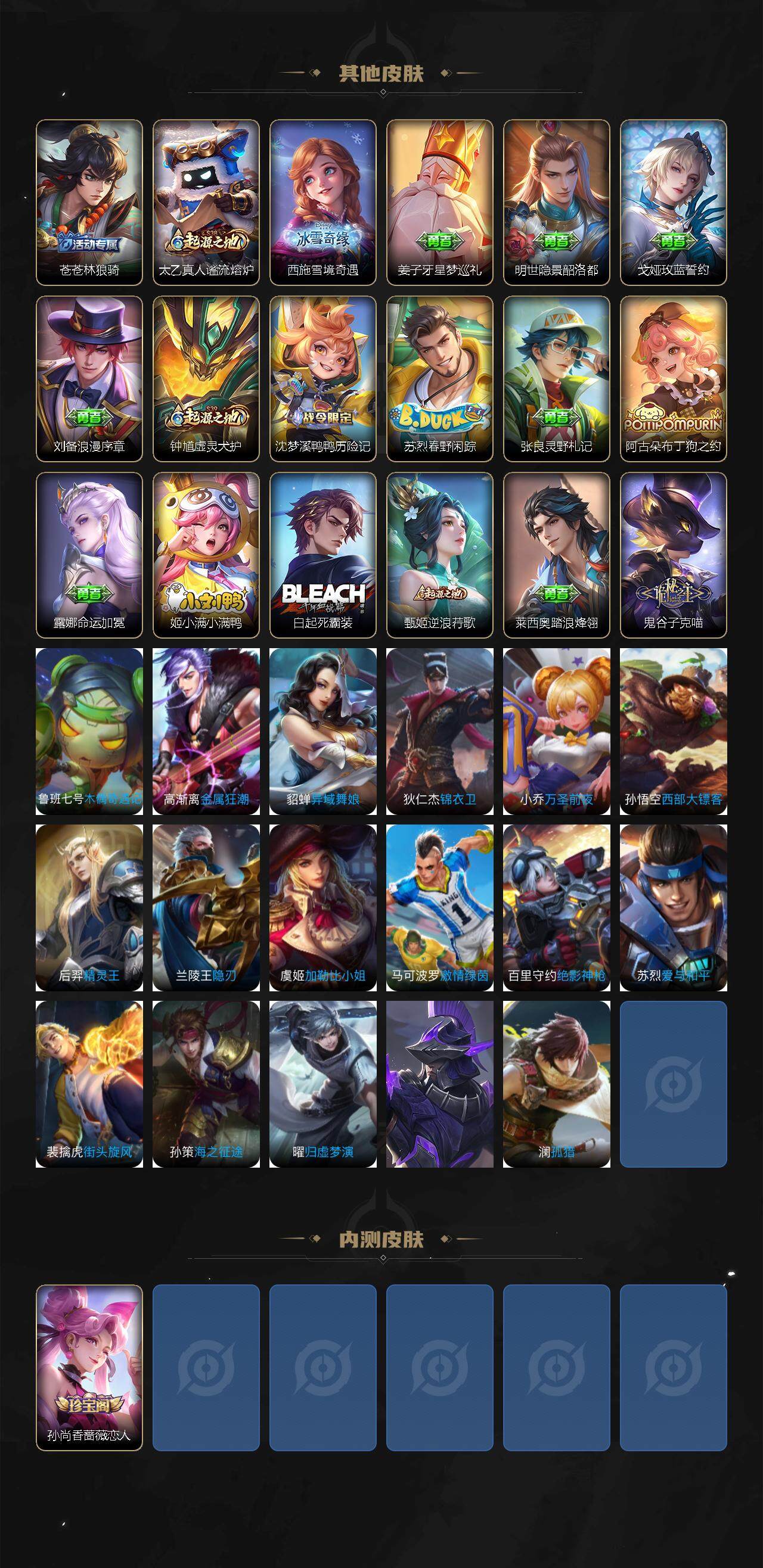 【其他皮肤】:项羽海滩派对,韩信教廷特使,芈月红桃皇后,白起白色死神,扁鹊化身博士,宫本武藏未来纪元,孙膑天使之翼,妲己少女阿狸,花木兰兔女郎,甄姬花好人间,后羿阿尔法小队,狄仁杰阴阳师,王昭君幻想奇妙夜,狂铁命运角斗场,孙尚香沉稳之力,典韦穷奇,诸葛亮掌控之力,李白敏锐之力,明世隐虹云星官,钟馗驱傩正仪,鲁班大师乓乓大师,苏烈千军破阵,达摩沙漠行僧,程咬金无双福将,兰陵王金庭之子,刘禅唤灵魔甲,沈梦溪大漠名商,蒙恬蔚蓝守将,李元芳云中旅人,桑启海盐诗旅,海月幻泉雾影,猪八戒潮玩探月行,姬小满零食大作战,廉颇功夫炙烤,干将莫邪雾都夜雨,吕布逐霄战戟,苍苍林狼骑,太乙真人谧流熔炉,西施雪境奇遇,姜子牙星梦巡礼,明世隐景韶洛都,戈娅玫蓝誓约,刘备浪漫序章,钟馗虚灵犬护,沈梦溪鸭鸭历险记,苏烈春野闲踪,张良灵野札记,阿古朵布丁狗之约,露娜命运加冕,姬小满小满鸭,白起死霸装,甄姬逆浪荇歌,莱西奥踏浪烽翎,鬼谷子克喵,鲁班七号木偶奇遇记,高渐离金属狂潮,貂蝉异域舞娘,狄仁杰锦衣卫,小乔万圣前夜,孙悟空西部大镖客,后羿精灵王,兰陵王隐刃,虞姬加勒比小姐,马可波罗激情绿茵,百里守约绝影神枪,苏烈爱与和平,裴擒虎街头旋风,孙策海之征途,曜归虚梦演,蒙恬秩序猎龙将,澜孤猎