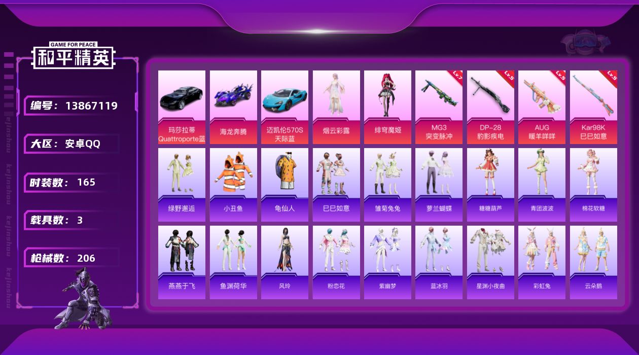 [13867119]安卓 手Q-3粉装-5特效枪-3载具-2粉色飞行器-59695热力值-12王牌印记-165套装-206枪皮