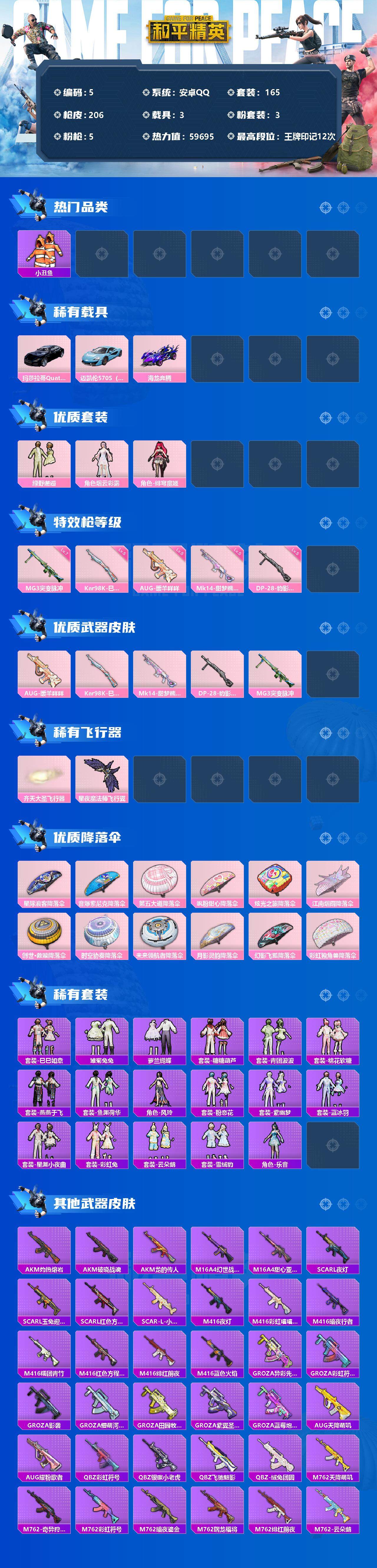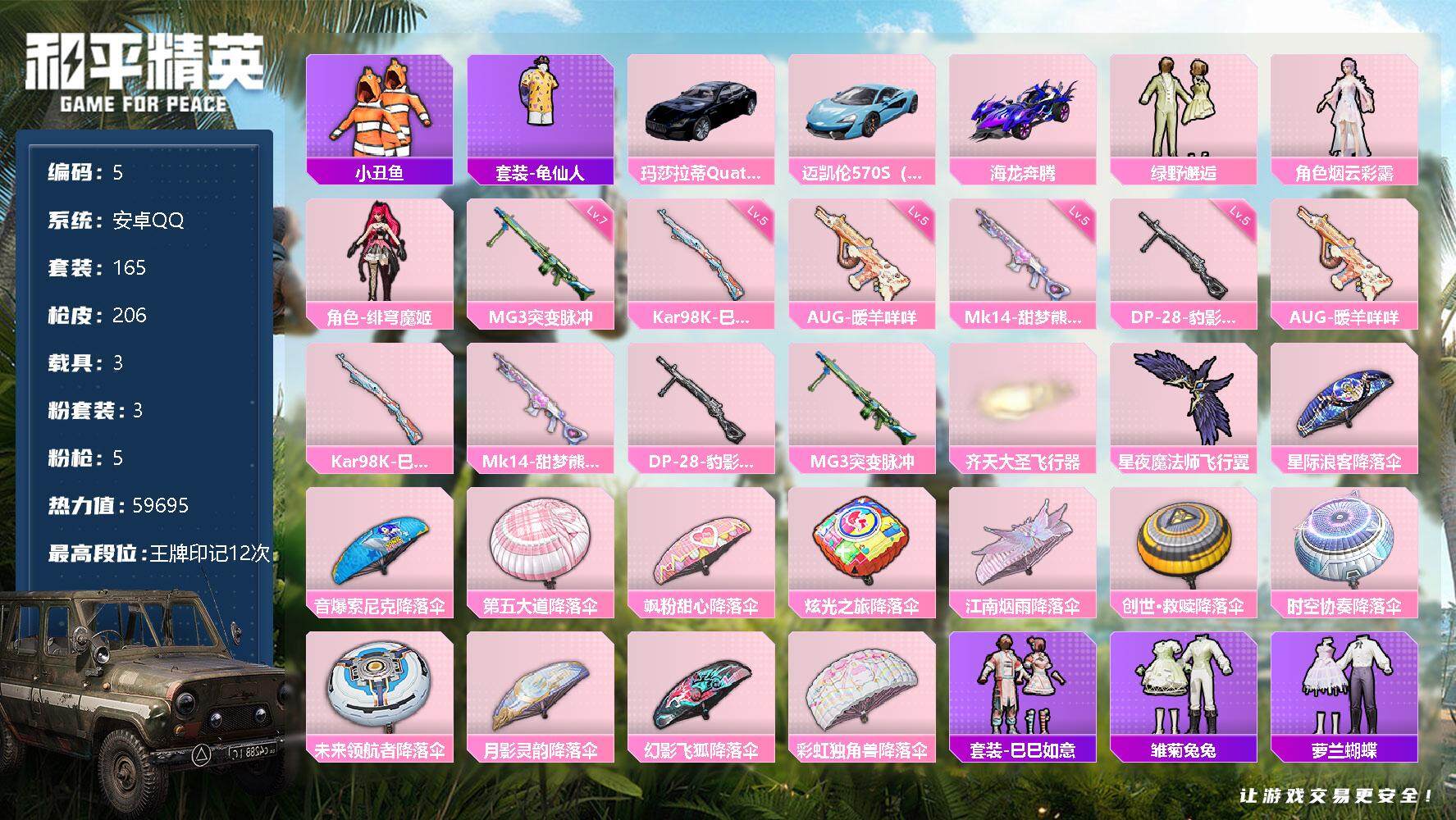 [13867119]安卓 手Q-3粉装-5特效枪-3载具-2粉色飞行器-59695热力值-12王牌印记-165套装-206枪皮 【热门品类】:套装-小丑鱼,套装-龟仙人 【粉色载具】:玛莎拉蒂Quattroporte(夜幕蓝),迈凯伦570S(天际蓝),海龙奔腾 【粉色套装】:粉装-绿野邂逅,角色-烟云彩露,角色-绯穹魔姬 【粉色枪皮等级】:AUG-暖羊咩咩(五级),Kar98K-巳巳如意(五级),Mk14-甜梦熊击(五级),DP-28-豹影疾电(五级),MG3-突变脉冲(七级) 【粉色枪皮】:AUG-暖羊咩咩,Kar98K-巳巳如意,Mk14-甜梦熊击,DP-28-豹影疾电,MG3-突变脉冲 【粉色飞行器】:齐天大圣飞行器,星夜魔法师飞行翼 【粉色降落伞】:星际浪客降落伞,音爆索尼克降落伞,第五大道降落伞,飒粉甜心降落伞,炫光之旅降落伞,江南烟雨降落伞,创世·救赎降落伞,时空协奏降落伞,未来领航者降落伞,月影灵韵降落伞,幻影飞狐降落伞,彩虹独角兽降落伞 【稀有套装】:套装-龟仙人,套装-巳巳如意,套装-雏菊兔兔,套装-萝兰蝴蝶,套装-糖糖葫芦,套装-青团波波,套装-棉花软糖,套装-燕燕于飞,套装-鱼渊荷华,角色-风玲,套装-粉恋花,套装-紫幽梦,套装-蓝冰羽,套装-星渊小夜曲,套装-彩虹兔,套装-云朵鹅,套装-雪绒豹,角色-乐音 【稀有枪皮】:AKM-灼热熔岩,AKM-破晓战魂,AKM-龙的传人,M16A4-幻世战舞者,M16A4-甜心亚梦,SCAR-L-夜灯,SCAR-L-玉兔迎春,SCAR-L-红色方程式,SCAR-L-小狗蛇点点,M416-夜灯,M416-彩虹嘻嘻猴,M416-暗夜行者,M416-糯团青竹,M416-红色方程式,M416-绯红前夜,M416-蓝色火焰,GROZA-异彩先驱,GROZA-彩虹符号,GROZA-影袭,GROZA-懵萌河马,GROZA-田园牧歌,GROZA-紫翼圣骑,GROZA-蓝莓炮弹,AUG-天降萌叽,AUG-耀粉歌者,QBZ-彩虹符号,QBZ-银碳小老虎,QBZ-飞驰魅影,QBZ-绒兔团圆,M762-天降萌叽,M762-奇异狩猎者,M762-彩虹符号,M762-暗夜鎏金,M762-瑞龙福将,M762-绯红前夜,M762-云朵鹅,Mk47-妙红点点,G36C-懵萌河马,AC-VAL-天降萌叽,AC-VAL-甜心亚梦,蜜獾-天降萌叽,蜜獾-娇憨猪猪