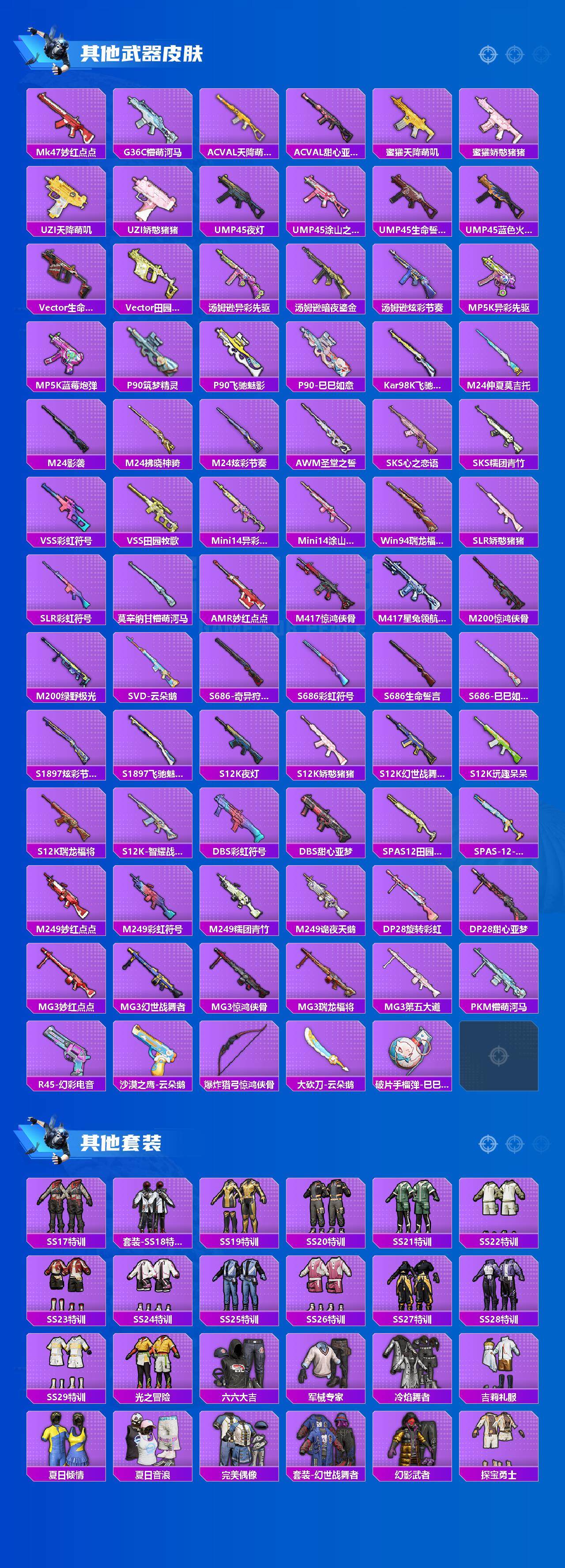 【稀有枪皮】:AKM-灼热熔岩,AKM-破晓战魂,AKM-龙的传人,M16A4-幻世战舞者,M16A4-甜心亚梦,SCAR-L-夜灯,SCAR-L-玉兔迎春,SCAR-L-红色方程式,SCAR-L-小狗蛇点点,M416-夜灯,M416-彩虹嘻嘻猴,M416-暗夜行者,M416-糯团青竹,M416-红色方程式,M416-绯红前夜,M416-蓝色火焰,GROZA-异彩先驱,GROZA-彩虹符号,GROZA-影袭,GROZA-懵萌河马,GROZA-田园牧歌,GROZA-紫翼圣骑,GROZA-蓝莓炮弹,AUG-天降萌叽,AUG-耀粉歌者,QBZ-彩虹符号,QBZ-银碳小老虎,QBZ-飞驰魅影,QBZ-绒兔团圆,M762-天降萌叽,M762-奇异狩猎者,M762-彩虹符号,M762-暗夜鎏金,M762-瑞龙福将,M762-绯红前夜,M762-云朵鹅,Mk47-妙红点点,G36C-懵萌河马,AC-VAL-天降萌叽,AC-VAL-甜心亚梦,蜜獾-天降萌叽,蜜獾-娇憨猪猪