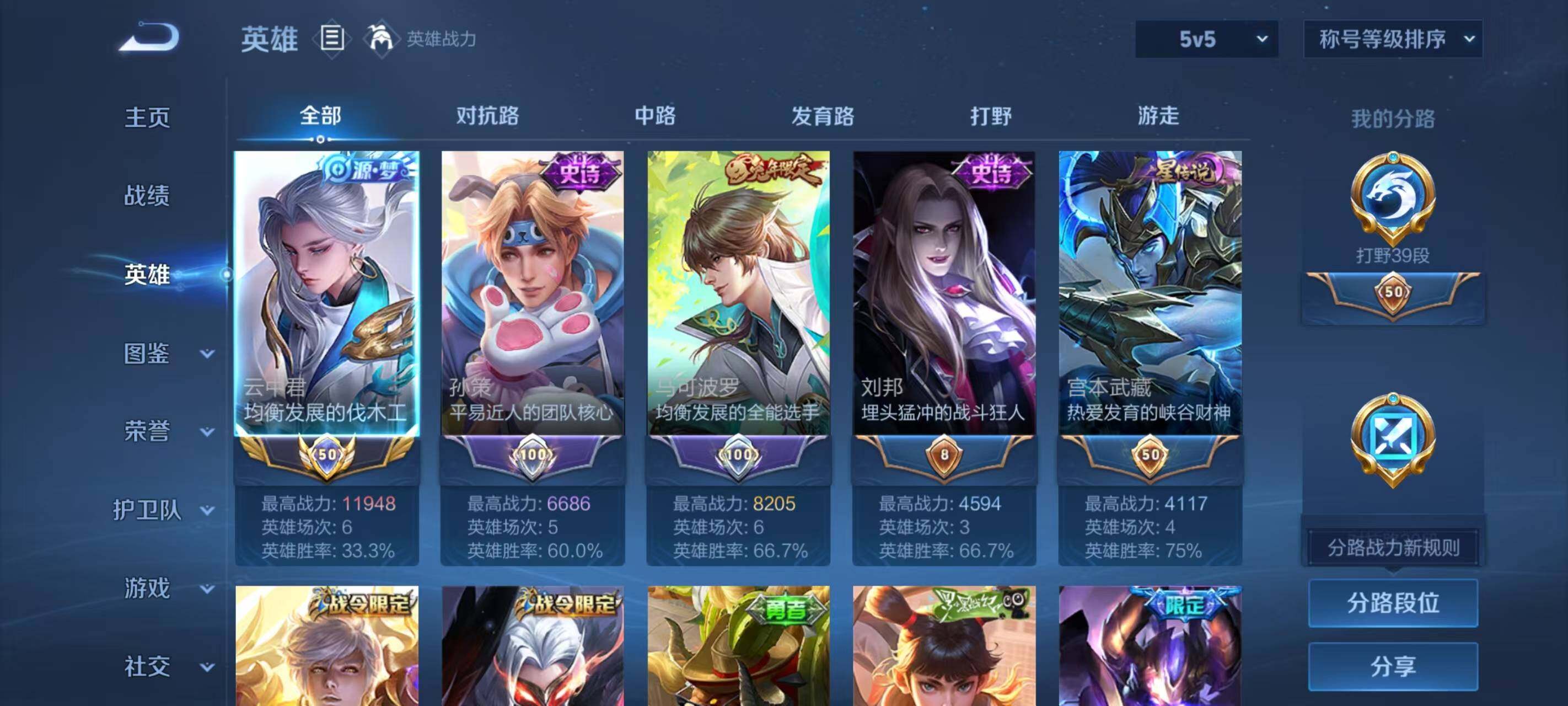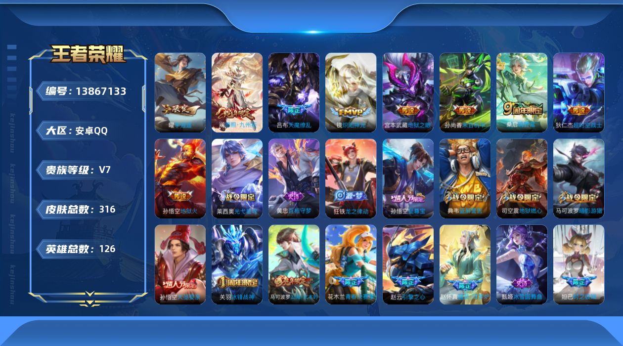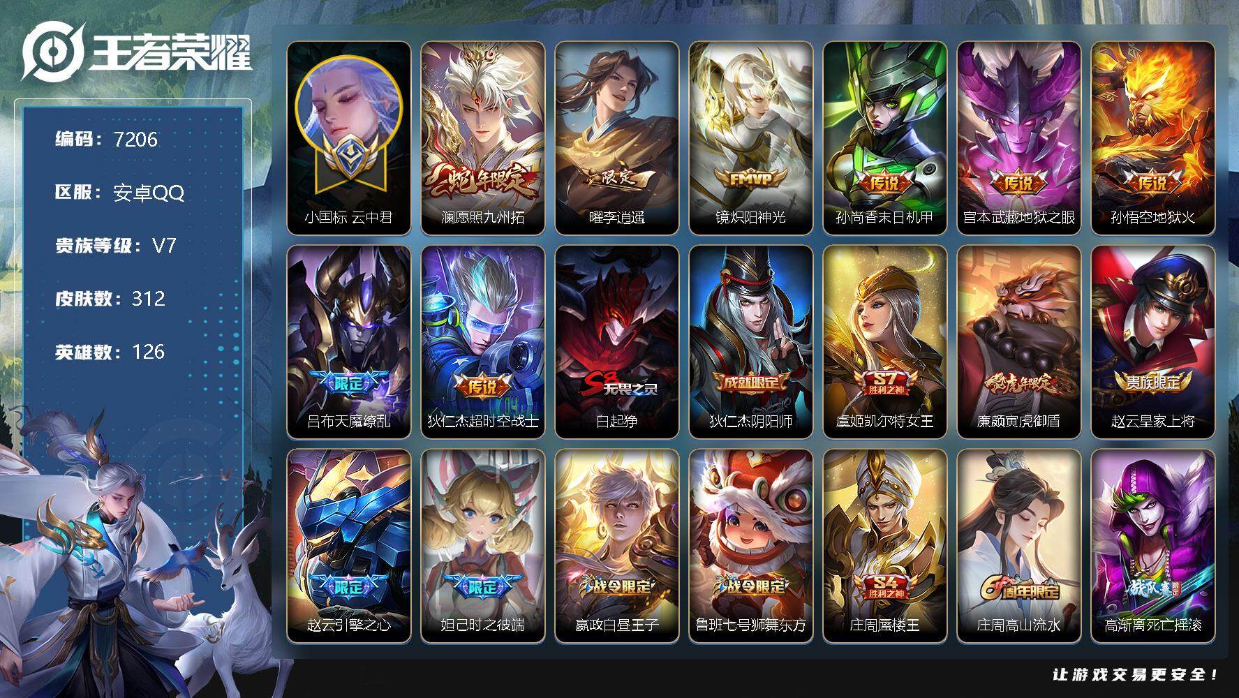 [13867133]小国标云中君安卓Q-V7-最强王者段位-126英雄-312皮肤-0典藏-0珍品无双-0无双-0珍品传说-8传说-73史诗