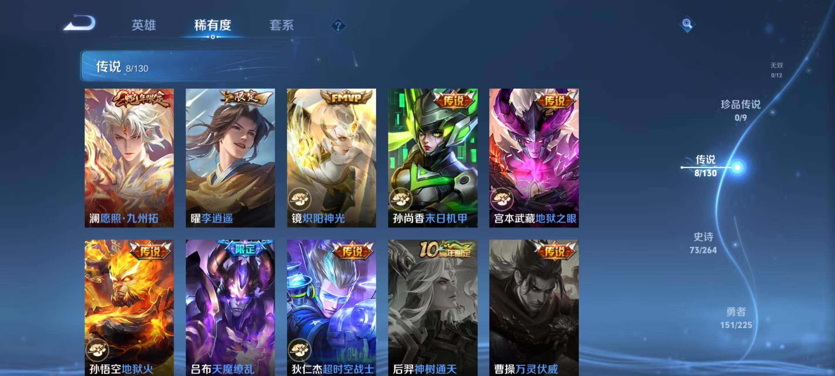 【传说皮肤】:澜愿照九州拓,曜李逍遥 ,镜炽阳神光,孙尚香末日机甲,宫本武藏地狱之眼,孙悟空地狱火,吕布天魔缭乱,狄仁杰超时空战士