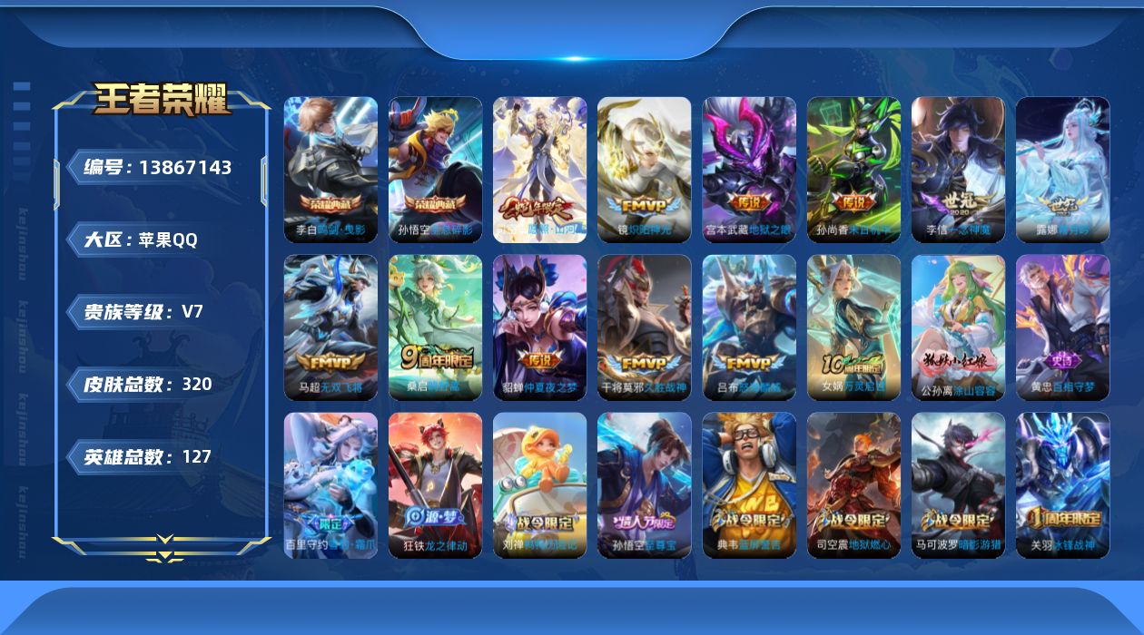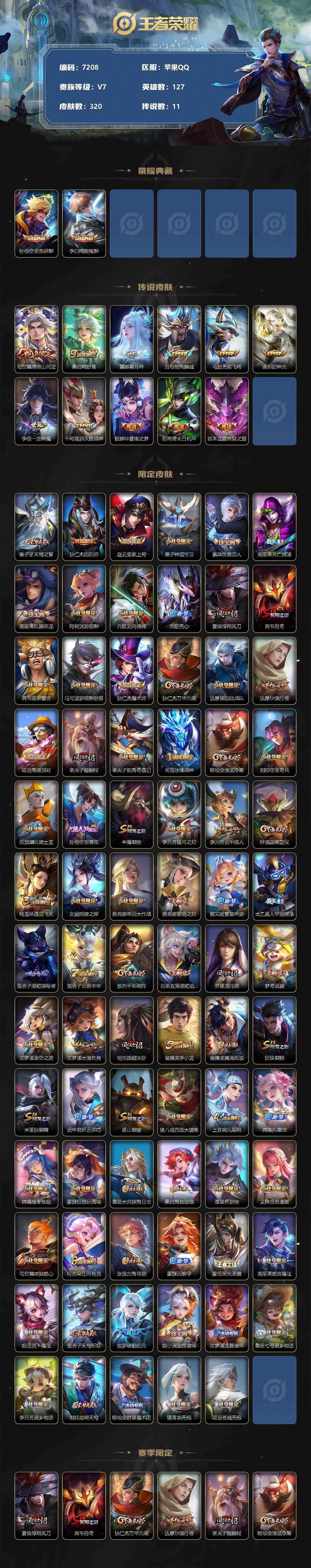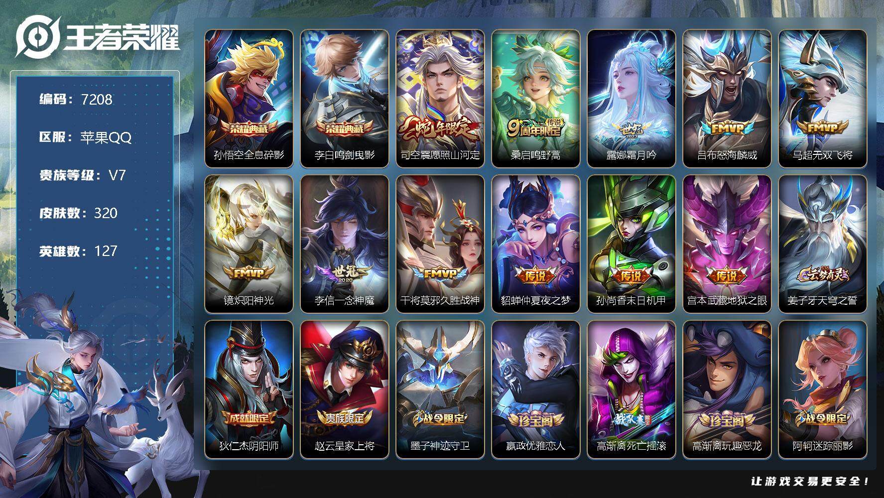 [13867143]苹果Q-V7-最强王者段位-127英雄-320皮肤-2典藏-0珍品无双-0无双-0珍品传说-11传说-93史诗