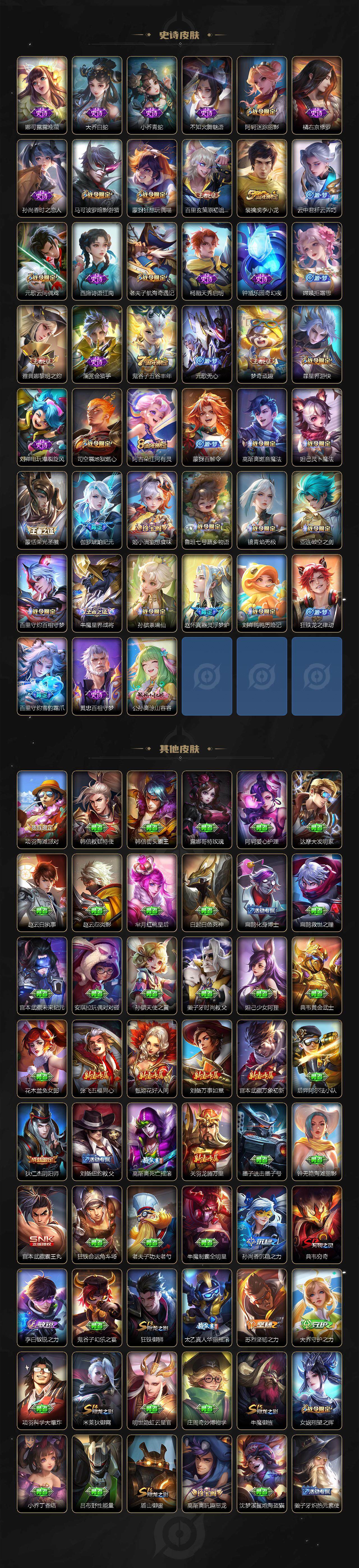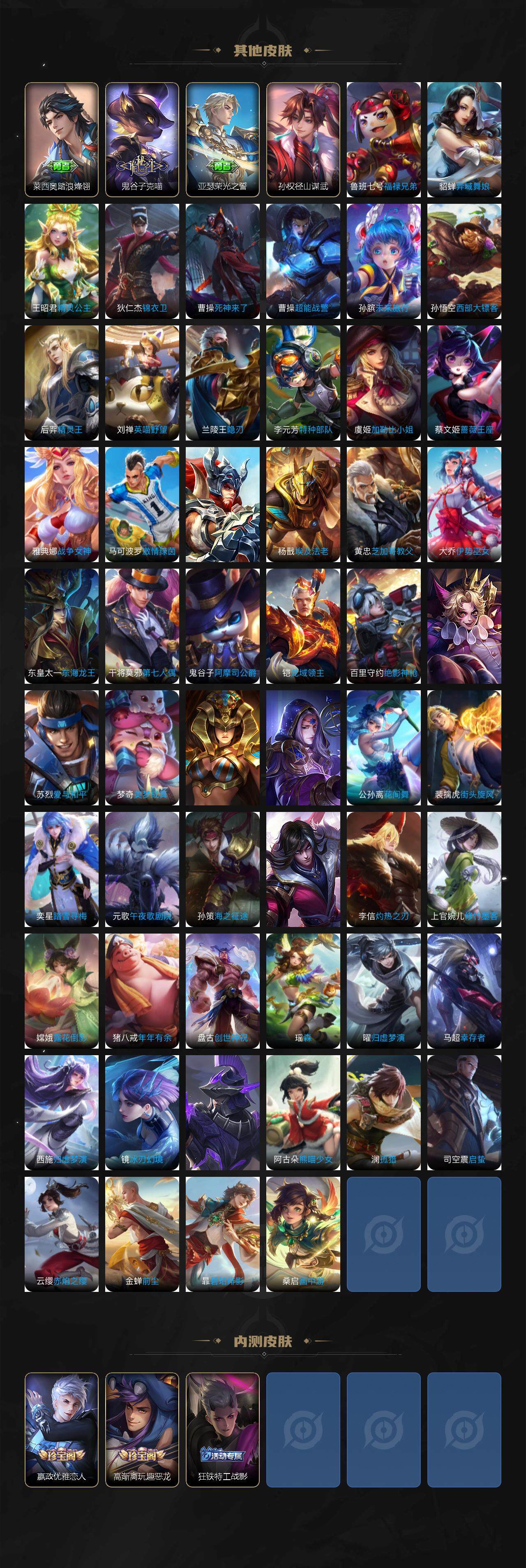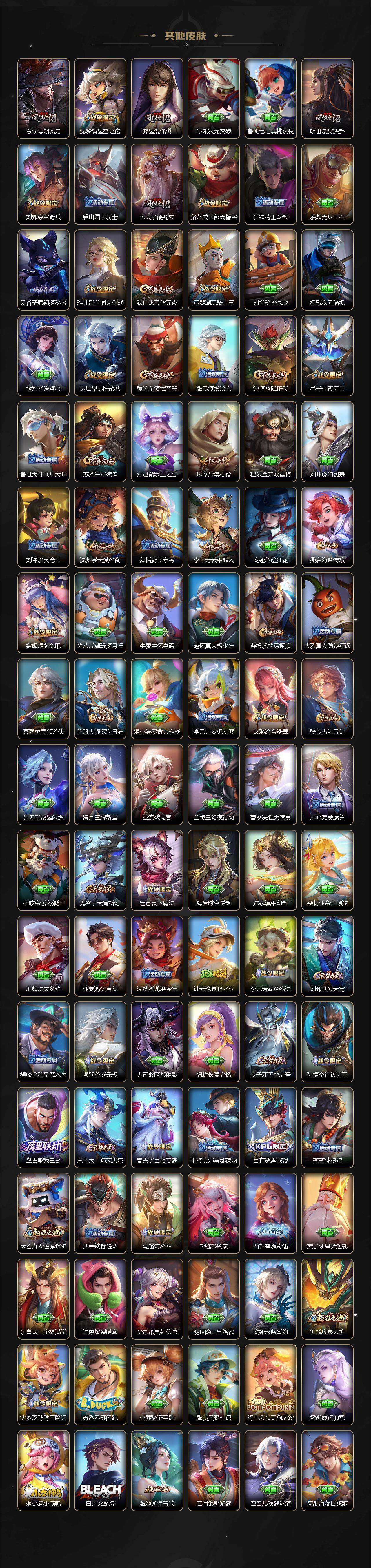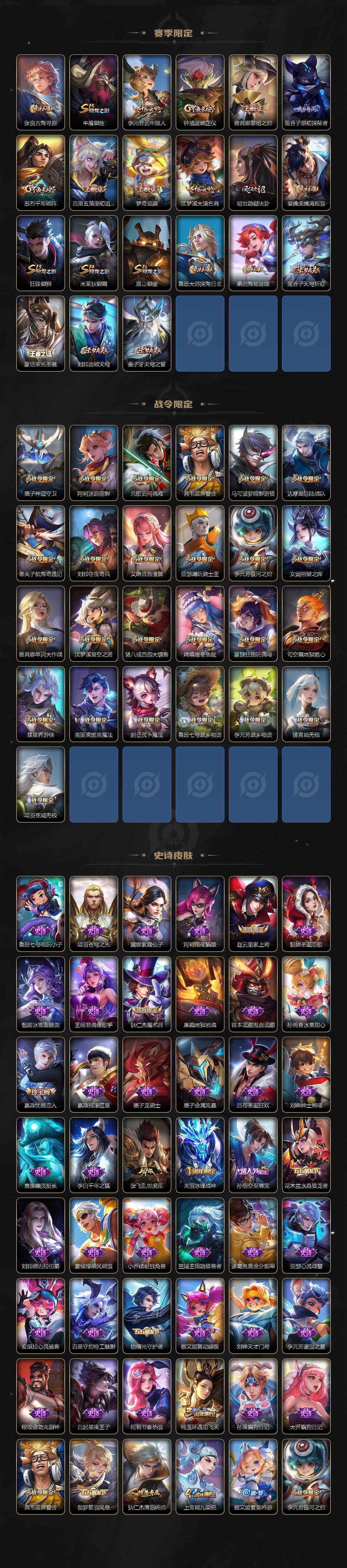 【限定皮肤】:姜子牙天穹之誓,狄仁杰阴阳师,赵云皇家上将,墨子神迹守卫,嬴政优雅恋人,高渐离死亡摇滚,高渐离玩趣恶龙,阿轲迷踪丽影,元歌云间偶戏,元歌无心,夏侯惇朔风刀,典韦穷奇,典韦蓝屏警告,马可波罗暗影游猎,狄仁杰魔术师,狄仁杰万华元夜,达摩星际陆战队,达摩沙漠行僧,项羽海滩派对,老夫子醍醐杖,老夫子航海奇遇记,关羽冰锋战神,程咬金演武夺筹,刘邦夺宝奇兵,亚瑟潮玩骑士王,孙悟空至尊宝,牛魔御旌,李元芳银河之约,李元芳云中旅人,钟馗驱傩正仪,杨玉环遇见飞天,女娲朔望之晖,雅典娜单词大作战,雅典娜黎明之约,蔡文姬繁星吟游,太乙真人华丽摇滚,鬼谷子原初探秘者,鬼谷子五谷丰年,苏烈千军破阵,百里玄策原初追逐者,弈星混沌棋,梦奇顽趣,沈梦溪星空之诺,沈梦溪大漠名商,明世隐疑决卦,裴擒虎李小龙,裴擒虎擒涛扼浪,狂铁御狮,米莱狄御霄,云中君纤云弄巧,盾山御銮,猪八戒西部大镖客,上官婉儿梁祝,嫦娥拒霜思,嫦娥暖冬兔眠,蒙犽狂想玩偶喵,鲁班大师探海日志,桑启海盐诗旅,暃星界游侠,艾琳流音漫舞,司空震地狱燃心,阿古朵江河有灵,张良古海寻踪,蒙犽百解令,蒙恬荣光圣徽,高渐离燃音魔法,妲己灵卜魔法,鬼谷子天穹祈灯,伽罗琥珀纪元,姬小满妄想食味,沈梦溪龙舞盛年,鲁班七号蔬乡物语,李元芳蔬乡物语,刘邦剑破天穹,程咬金群星魔术团,镜青焰无极,项羽苍威无极