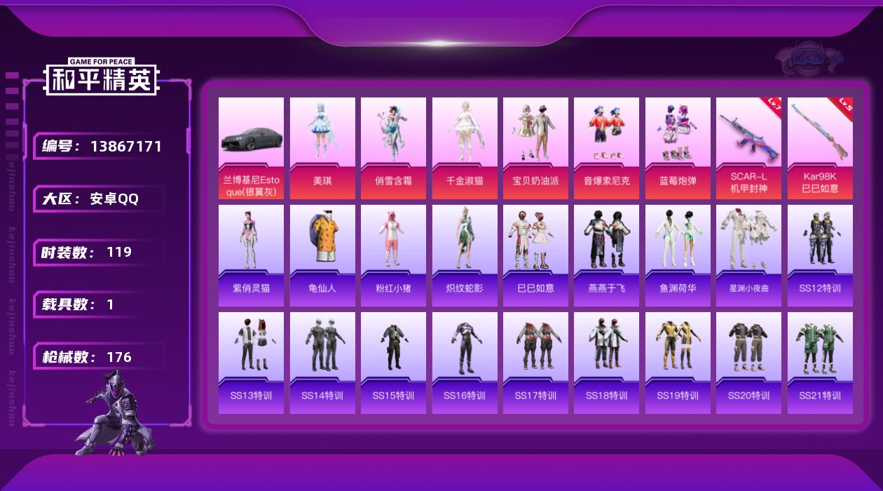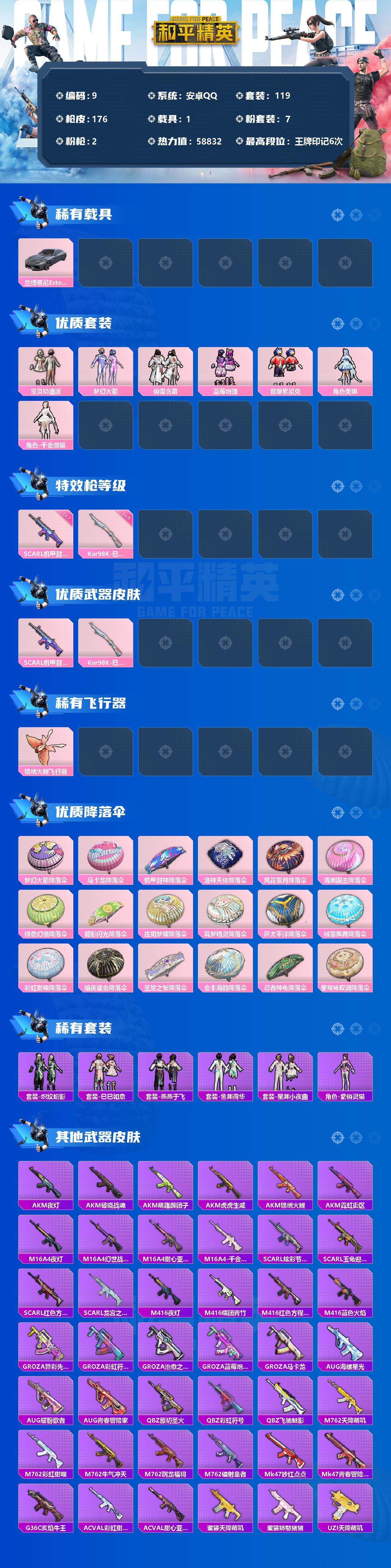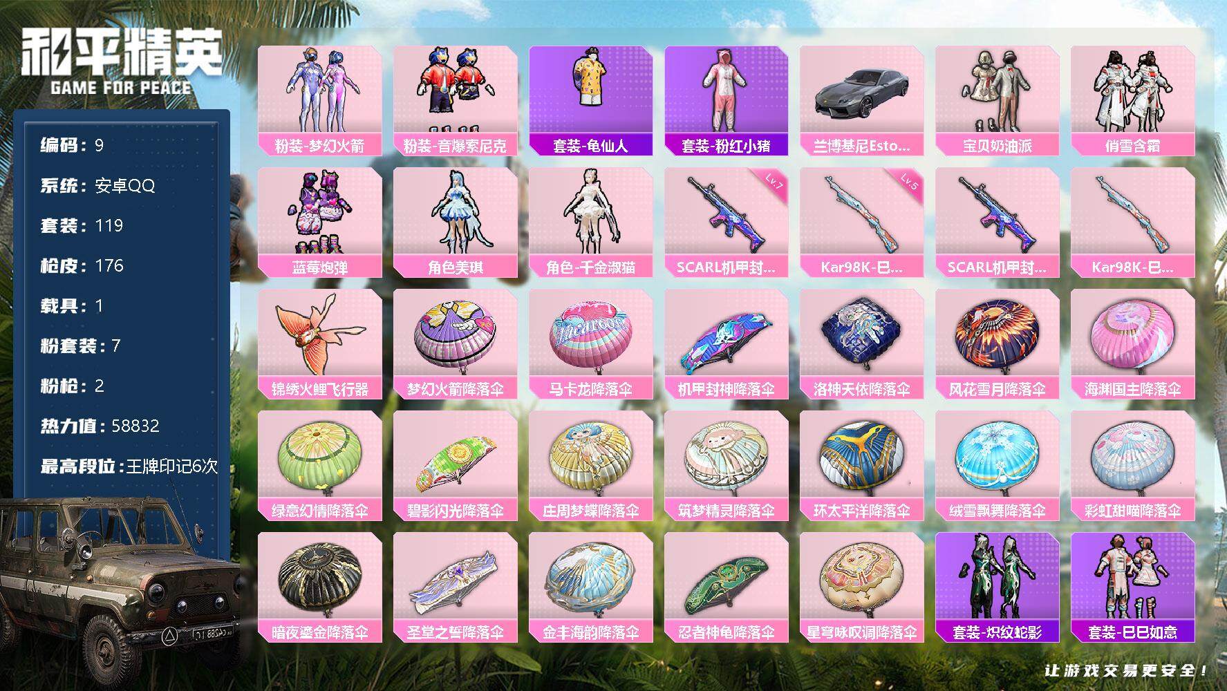 [13867171]安卓 手Q-7粉装-2特效枪-1载具-1粉色飞行器-58832热力值-6王牌印记-119套装-176枪皮 【热门品类】:粉装-梦幻火箭,粉装-音爆索尼克,套装-龟仙人,套装-粉红小猪 【粉色载具】:兰博基尼Estoque(银翼灰) 【粉色套装】:粉装-宝贝奶油派,粉装-梦幻火箭,粉装-俏雪含霜,粉装-蓝莓炮弹,粉装-音爆索尼克,角色-美琪,角色-千金淑猫 【粉色枪皮等级】:SCAR-L-机甲封神(七级),Kar98K-巳巳如意(五级) 【粉色枪皮】:SCAR-L-机甲封神,Kar98K-巳巳如意 【粉色飞行器】:锦绣火鲤飞行器 【粉色降落伞】:梦幻火箭降落伞,马卡龙降落伞,机甲封神降落伞,洛神天依降落伞,风花雪月降落伞,海渊国主降落伞,绿意幻情降落伞,碧影闪光降落伞,庄周梦蝶降落伞,筑梦精灵降落伞,环太平洋降落伞,绒雪飘舞降落伞,彩虹甜喵降落伞,暗夜鎏金降落伞,圣堂之誓降落伞,金丰海韵降落伞,忍者神龟降落伞,星穹咏叹调降落伞 【稀有套装】:套装-龟仙人,套装-炽纹蛇影,套装-巳巳如意,套装-燕燕于飞,套装-鱼渊荷华,套装-星渊小夜曲,角色-紫俏灵猫 【稀有枪皮】:AKM-夜灯,AKM-破晓战魂,AKM-萌趣颜团子,AKM-虎虎生威,AKM-锦绣火鲤,AKM-霓虹街区,M16A4-夜灯,M16A4-幻世战舞者,M16A4-甜心亚梦,M16A4-千金淑猫,SCAR-L-炫彩节奏,SCAR-L-玉兔迎春,SCAR-L-红色方程式,SCAR-L-龙宫之主,M416-夜灯,M416-糯团青竹,M416-红色方程式,M416-蓝色火焰,GROZA-异彩先驱,GROZA-彩虹符号,GROZA-治愈之星,GROZA-蓝莓炮弹,GROZA-马卡龙,AUG-海螺星光,AUG-耀粉歌者,AUG-青春冒险家,QBZ-原初圣火,QBZ-彩虹符号,QBZ-飞驰魅影,M762-天降萌叽,M762-彩虹甜喵,M762-牛气冲天,M762-瑞龙福将,M762-镭射皇者,Mk47-妙红点点,Mk47-青春冒险家,G36C-炙焰牛王,AC-VAL-彩虹甜喵,AC-VAL-甜心亚梦,蜜獾-天降萌叽,蜜獾-娇憨猪猪,UZI-天降萌叽,UZI-娇憨猪猪,UZI-炫彩节奏,UZI-红色方程式,UMP45-仲夏莫吉托,UMP45-夜灯,UMP45-生命誓言,Vector-焰鹰斗篷,Vector-夜灯,Vecto