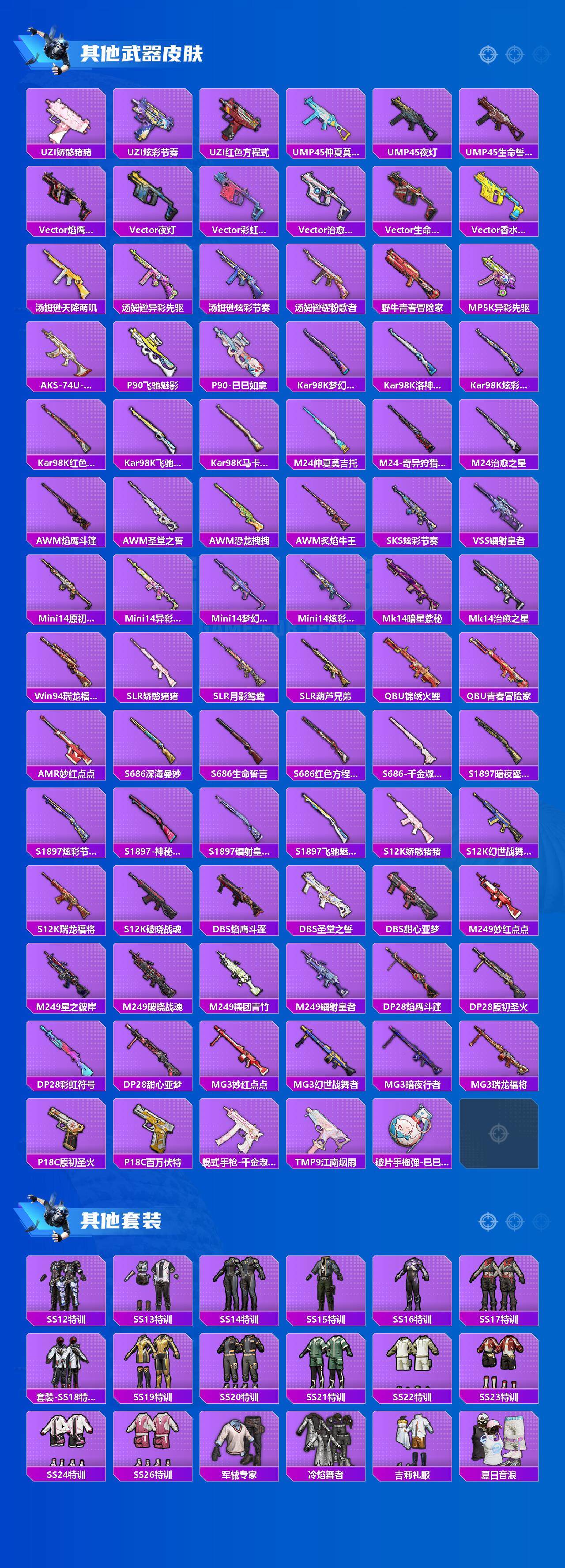 【稀有枪皮】:AKM-夜灯,AKM-破晓战魂,AKM-萌趣颜团子,AKM-虎虎生威,AKM-锦绣火鲤,AKM-霓虹街区,M16A4-夜灯,M16A4-幻世战舞者,M16A4-甜心亚梦,M16A4-千金淑猫,SCAR-L-炫彩节奏,SCAR-L-玉兔迎春,SCAR-L-红色方程式,SCAR-L-龙宫之主,M416-夜灯,M416-糯团青竹,M416-红色方程式,M416-蓝色火焰,GROZA-异彩先驱,GROZA-彩虹符号,GROZA-治愈之星,GROZA-蓝莓炮弹,GROZA-马卡龙,AUG-海螺星光,AUG-耀粉歌者,AUG-青春冒险家,QBZ-原初圣火,QBZ-彩虹符号,QBZ-飞驰魅影,M762-天降萌叽,M762-彩虹甜喵,M762-牛气冲天,M762-瑞龙福将,M762-镭射皇者,Mk47-妙红点点,Mk47-青春冒险家,G36C-炙焰牛王,AC-VAL-彩虹甜喵,AC-VAL-甜心亚梦,蜜獾-天降萌叽,蜜獾-娇憨猪猪,UZI-天降萌叽,UZI-娇憨猪猪,UZI-炫彩节奏,UZI-红色方程式,UMP45-仲夏莫吉托,UMP45-夜灯,UMP45-生命誓言,Vector-焰鹰斗篷,Vector-夜灯,Vecto