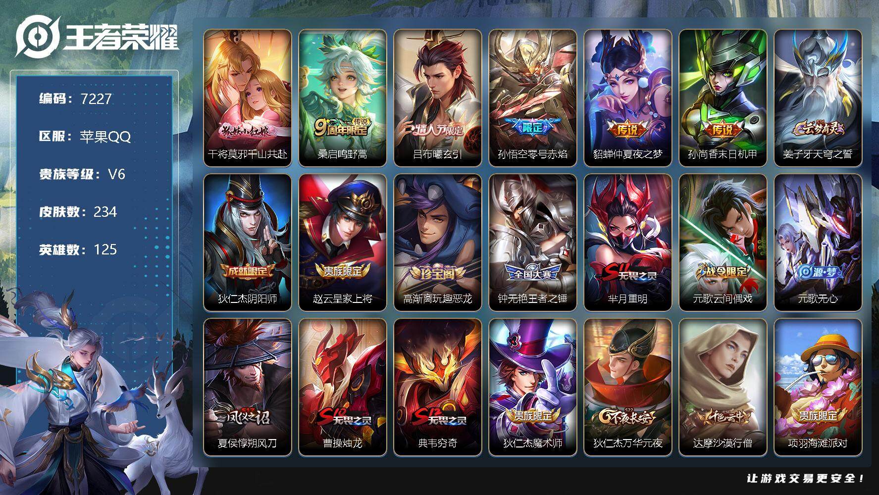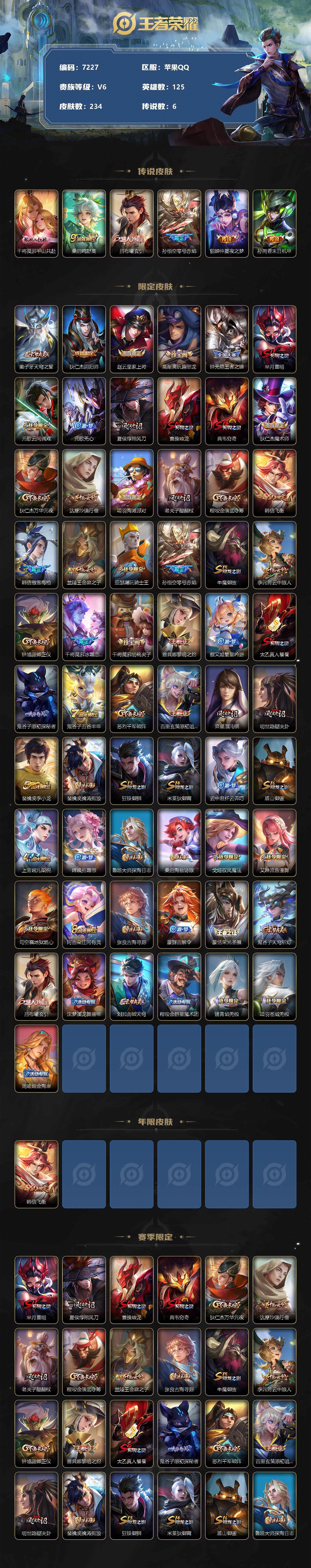 [13867240]苹果Q-V6-永恒钻石III段位-125英雄-234皮肤-0典藏-0珍品无双-0无双-0珍品传说-6传说-59史诗