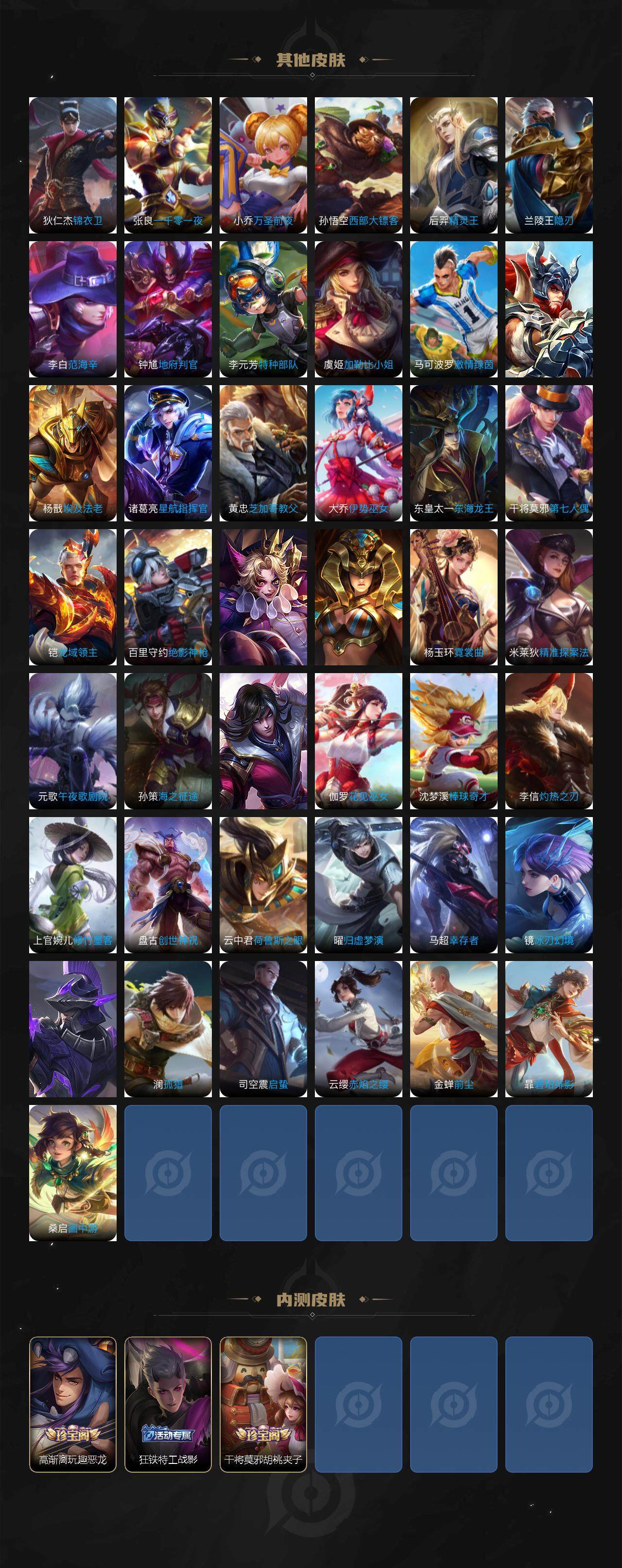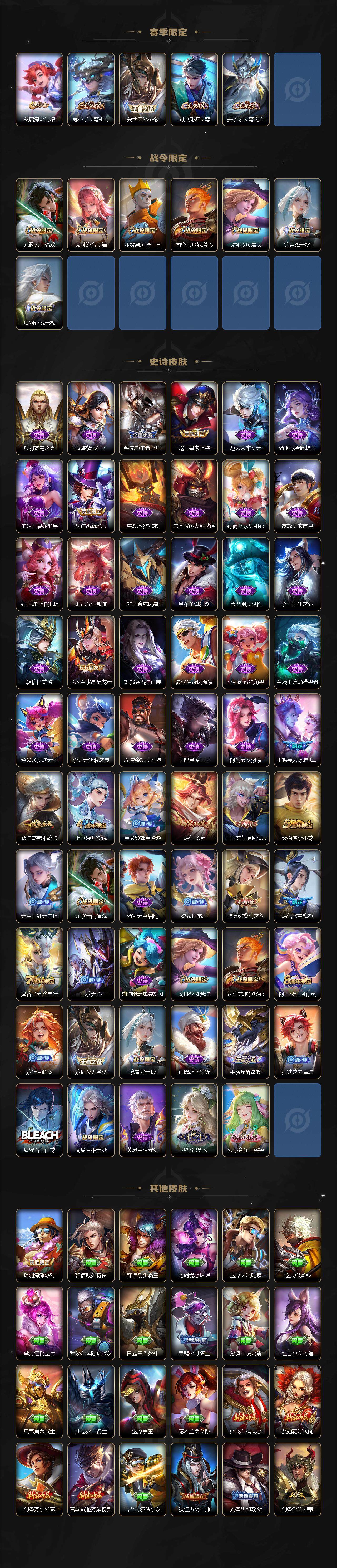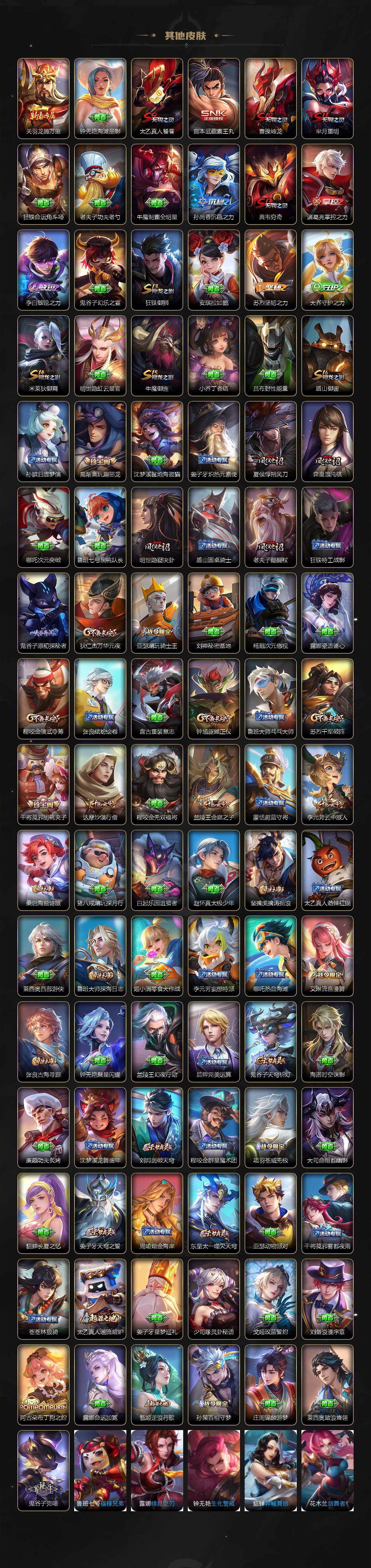 【赛季限定】:芈月重明,夏侯惇朔风刀,曹操烛龙,典韦穷奇,狄仁杰万华元夜,达摩沙漠行僧,老夫子醍醐杖,程咬金演武夺筹,兰陵王金庭之子,张良古海寻踪,牛魔御旌,李元芳云中旅人,钟馗驱傩正仪,雅典娜黎明之约,太乙真人饕餮,鬼谷子原初探秘者,苏烈千军破阵,百里玄策原初追逐者,弈星混沌棋,明世隐疑决卦,裴擒虎擒涛扼浪,狂铁御狮,米莱狄御霄,盾山御銮,鲁班大师探海日志,桑启海盐诗旅,鬼谷子天穹祈灯,蒙恬荣光圣徽,刘邦剑破天穹,姜子牙天穹之誓