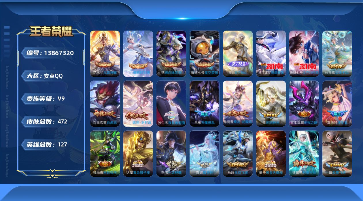 [13867320]多国标 百段发育路 安卓Q-V9-最强王者段位-127英雄-466皮肤-3典藏-0珍品无双-1无双-2珍品传说-35传说-147史诗 【英雄全皮】:鲁班七号全皮,刘禅全皮,阿轲全皮,狄仁杰全皮,达摩全皮,刘邦全皮,孙权全皮,苍全皮,鬼谷子全皮,黄忠全皮,苏烈全皮,猪八戒全皮,蒙犽全皮,蒙恬全皮,戈娅全皮,空空儿全皮,影全皮 【荣耀典藏】:鲁班七号星空梦想,花木兰九霄神辉,铠银白咏叹调 【无双皮肤】:李白碎月剑心 【珍品传说】:马可波罗怪盗基德,鲁班七号江户川柯南 【传说皮肤】:公孙离云诺千山,虞姬愿照岁时盈,云缨幻光神枪,桑启鸣野蒿,墨子黄金天蝎座,孙尚香乘龙问璇玑,露娜霜月吟,狄仁杰夜礼服假面,鲁班七号时之奇旅,公孙离记忆之芯,夏洛特浮生妄,项羽无限倾心,吕布怒海麟威,李白诗剑行,狄仁杰神器狴犴令,马超无双飞将,孙策挚爱之约,鲁班七号寅虎瑞焰,赵云淬星耀世,李元芳飞鸢探春,诸葛亮时雨天司,镜炽阳神光,虞姬启明星使,曜云鹰飞将,李信一念神魔,张良黄金白羊座,干将莫邪久胜战神,虞姬云霓雀翎,达摩黄金狮子座,百里玄策白虎志,后羿黄金射手座,孙尚香末日机甲,宫本武藏地狱之眼,吕布天魔缭乱,狄仁杰超时空战士 【限定皮肤】:蒙犽顽岩魄,蔡文姬夏日便利店,大乔绒语心约,虞姬夏日便利店,姜子牙天穹之誓,杨戬破阵退雄兵,狄仁杰阴阳师,赵云皇家上将,赵云引擎之心,墨子神迹守卫,嬴政优雅恋人,鲁班七号狮舞东方,鲁班七号乒乒小将,鲁班七号寅虎瑞焰,鲁班七号时之奇旅,庄周云端筑梦师,庄周高山流水,高渐离死亡摇滚,高渐离玩趣恶龙,阿轲迷踪丽影,钟无艳王者之锤,钟无艳超时空战士,孙膑寅虎展翼,扁鹊奇幻香踪,芈月白晶晶,芈月幻夜卜梦,吕布天魔缭乱,吕布御风骁将,周瑜赤莲之焰,元歌云间偶戏,元歌无心,夏侯惇朔风刀,甄姬游园惊梦,甄姬落雪兰心,曹操天狼征服者,典韦蓝屏警告,马可波罗暗影游猎,马可波罗山海玄木吟,狄仁杰魔术师,狄仁杰万华元夜,狄仁杰神器狴犴令,达摩星际陆战队,达摩沙漠行僧,项羽海滩派对,项羽无限倾心,老夫子圣诞老人,老夫子醍醐杖,老夫子航海奇遇记,关羽冰锋战神,关羽百相守梦,安琪拉魔法小厨娘,程咬金演武夺筹,刘邦夺宝奇兵,韩信逐梦之影,韩信傲雪梅枪,王昭君午后时光,兰陵王驯魔猎人,兰陵王金庭之子,花木兰默契交锋,亚瑟潮玩骑士王,孙悟空美猴王,孙悟空至尊宝,孙悟空大圣娶亲,孙悟空孙行者