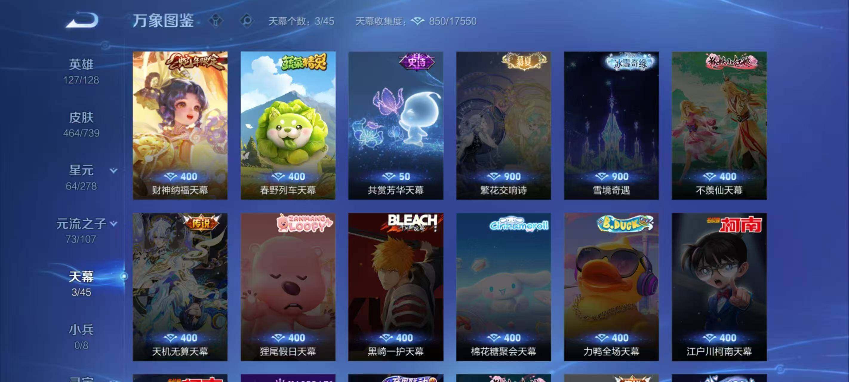 【英雄全皮】:鲁班七号全皮,刘禅全皮,阿轲全皮,狄仁杰全皮,达摩全皮,刘邦全皮,孙权全皮,苍全皮,鬼谷子全皮,黄忠全皮,苏烈全皮,猪八戒全皮,蒙犽全皮,蒙恬全皮,戈娅全皮,空空儿全皮,影全皮