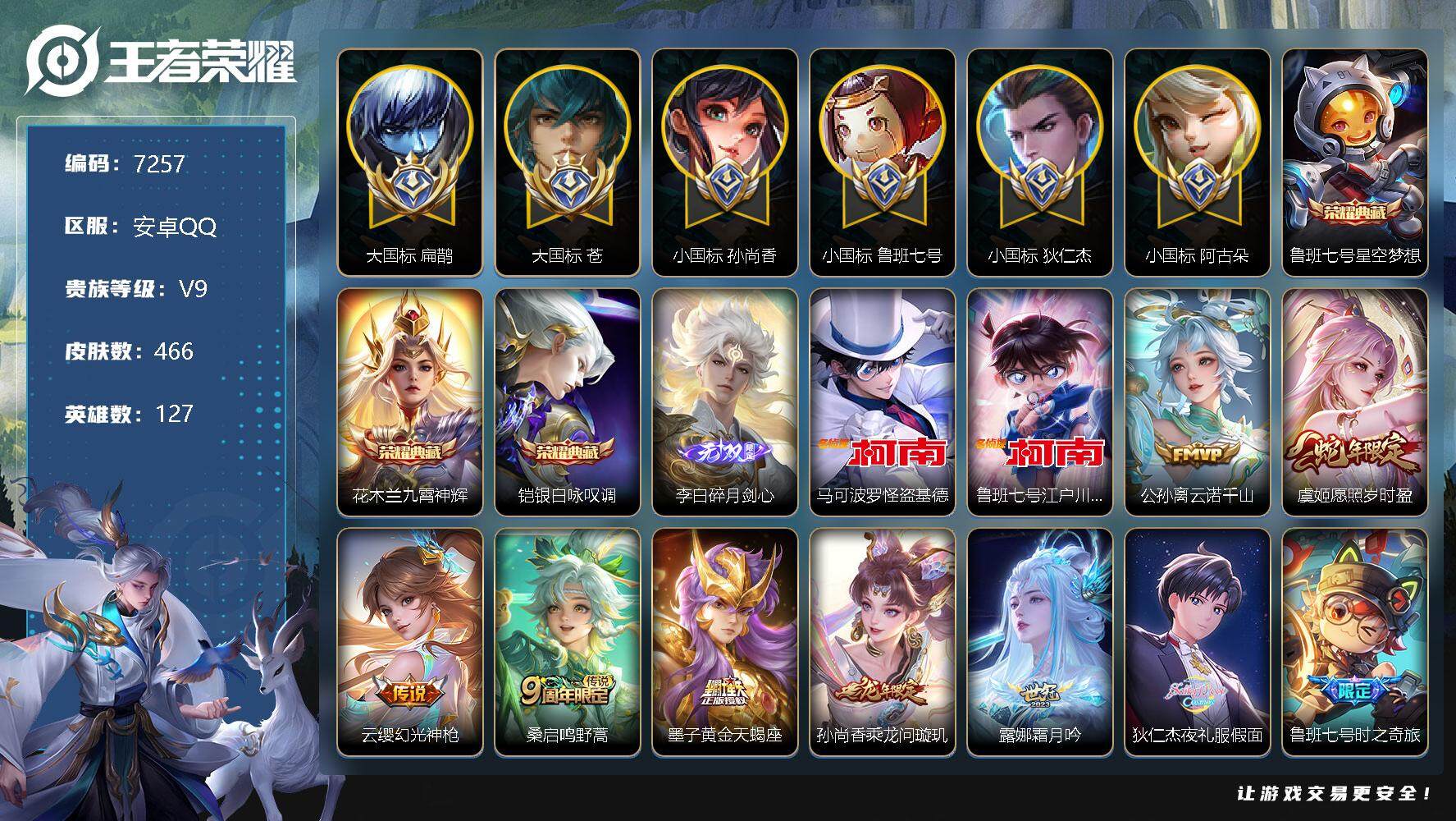 [13867320]多国标 百段发育路 安卓Q-V9-最强王者段位-127英雄-466皮肤-3典藏-0珍品无双-1无双-2珍品传说-35传说-147史诗