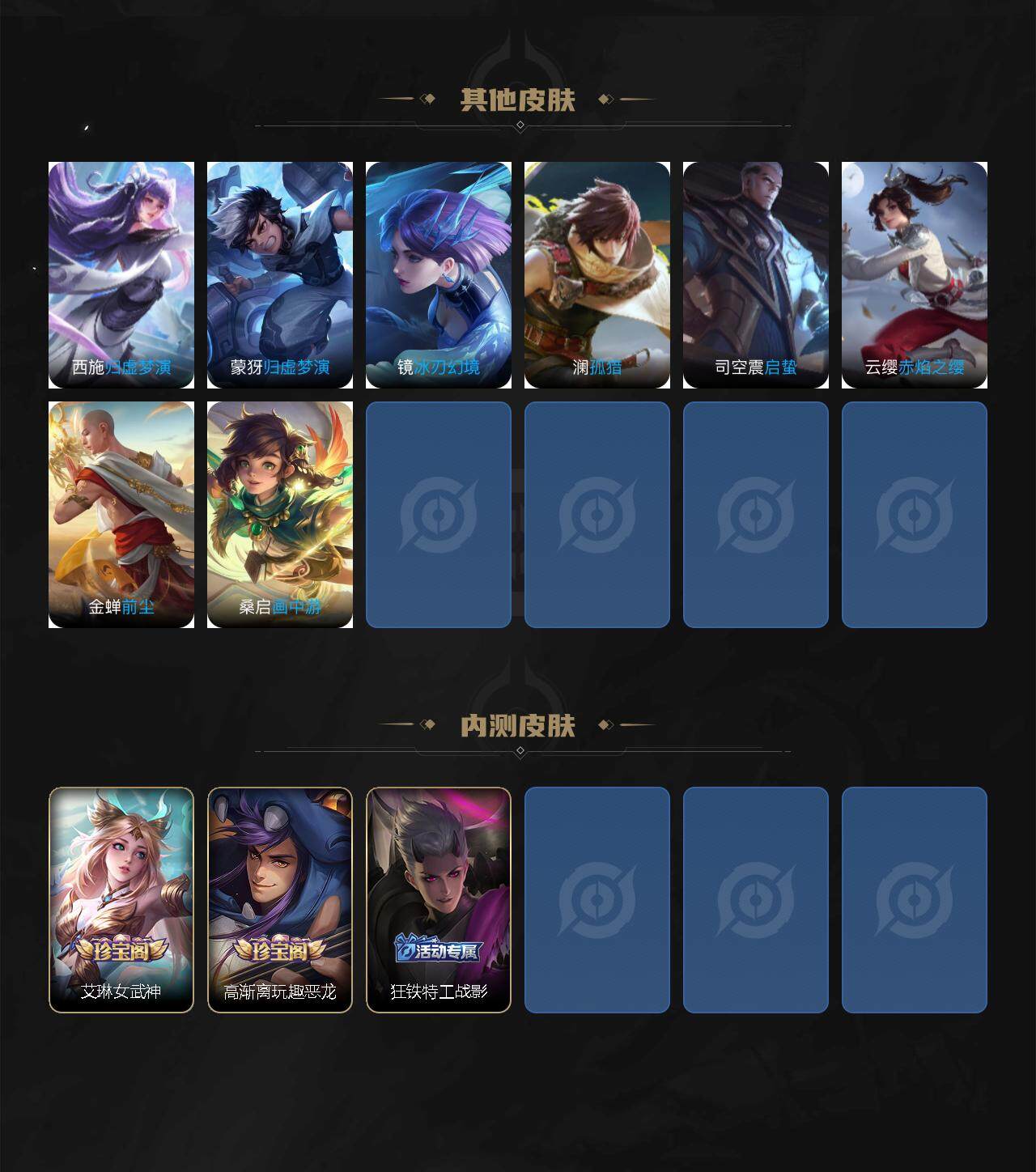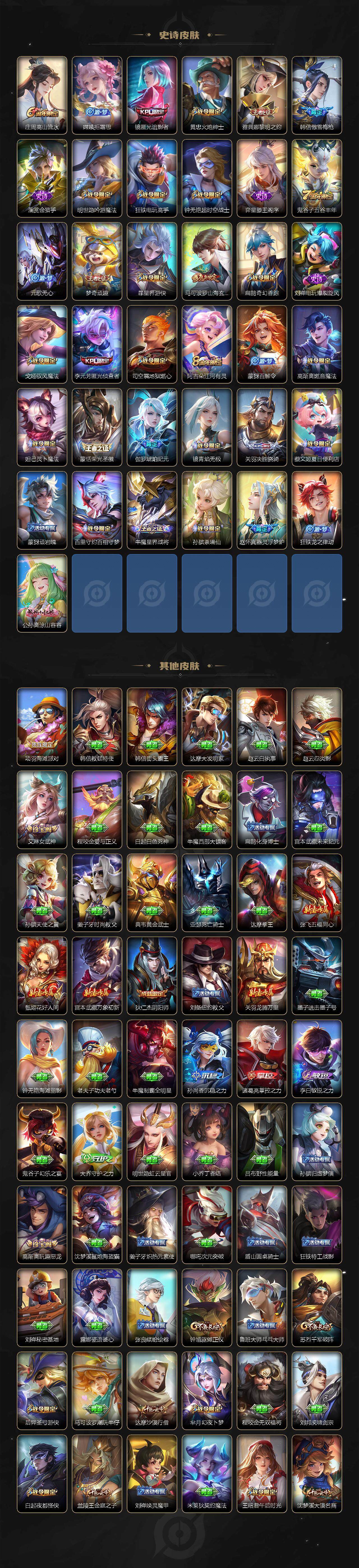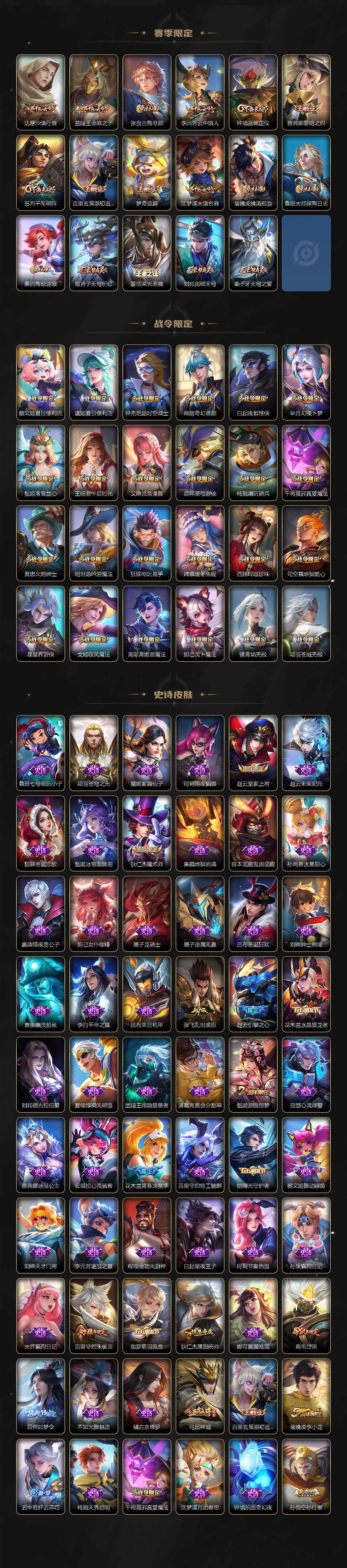 【限定皮肤】:蒙犽顽岩魄,蔡文姬夏日便利店,大乔绒语心约,虞姬夏日便利店,姜子牙天穹之誓,杨戬破阵退雄兵,狄仁杰阴阳师,赵云皇家上将,赵云引擎之心,孙尚香异界灵契,庄周高山流水,高渐离玩趣恶龙,钟无艳超时空战士,扁鹊奇幻香踪,白起夜都怪侠,芈月幻夜卜梦,元歌无心,甄姬游园惊梦,甄姬落雪兰心,典韦岱宗,马可波罗深海之息,马可波罗山海玄木吟,狄仁杰魔术师,达摩沙漠行僧,项羽海滩派对,韩信傲雪梅枪,王昭君午后时光,兰陵王金庭之子,花木兰青春决赛季,孙悟空孙行者,后羿如梦令,后羿圣弓游侠,李元芳匿光侦查者,李元芳云中旅人,钟馗驱傩正仪,杨戬潮玩骑兵,干将莫邪真爱魔法,雅典娜黎明之约,鬼谷子五谷丰年,大乔时之奇旅,黄忠火炮绅士,苏烈千军破阵,百里玄策原初追逐者,百里守约朱雀志,梦奇顽趣,沈梦溪大漠名商,明世隐吟游魔法,裴擒虎李小龙,裴擒虎擒涛扼浪,狂铁电玩高手,云中君纤云弄巧,嫦娥拒霜思,嫦娥暖冬兔眠,西施玲珑珍味,鲁班大师探海日志,镜匿光追影者,桑启海盐诗旅,暃星界游侠,戈娅驭风魔法,艾琳女武神,艾琳流音漫舞,司空震地狱燃心,阿古朵江河有灵,张良古海寻踪,蒙犽百解令,蒙恬荣光圣徽,高渐离燃音魔法,妲己灵卜魔法,鬼谷子天穹祈灯,伽罗琥珀纪元,沈梦溪龙舞盛年,刘邦剑破天穹,程咬金群星魔术团,关羽决胜骁骑,镜青焰无极,项羽苍威无极,周瑜熔金海岸