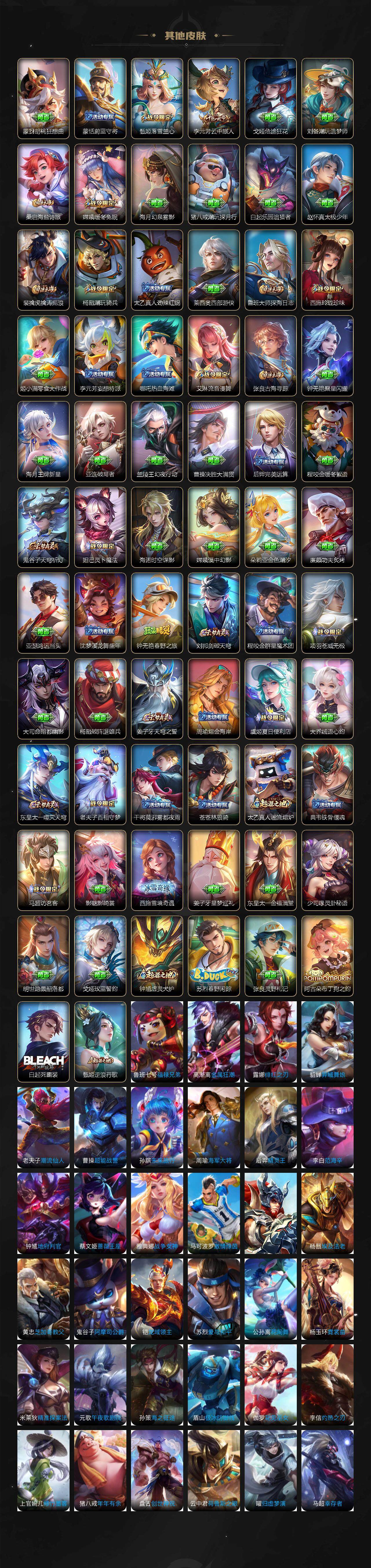 娜可露露晚萤,伽罗箭羽风息,李元芳逐浪之夏,不知火舞魅语,大乔猫狗日记,孙策猫狗日记,阿轲节奏热浪,露娜紫霞仙子,诸葛亮黄金分割率,项羽苍穹之光,阿轲暗夜猫娘,雅典娜冰冠公主,吕布末日机甲,鲁班七号电玩小子,橘右京修罗,墨子龙骑士,刘禅绅士熊喵,刘禅天才门将,白起星夜王子,安琪拉心灵骇客,程咬金功夫厨神,刘邦德古拉伯爵,兰陵王暗隐猎兽者,曹操幽灵船长,宫本武藏鬼剑武藏,亚瑟心灵战警,钟馗乐园奇幻夜,杨戬天秀·启明,蔡文姬舞动绿茵,廉颇地狱岩魂,夏侯惇乘风破浪,花木兰水晶猎龙者,铠曙光守护者,墨子金属风暴,百里玄策原初追逐者,吕布圣诞狂欢,貂蝉圣诞恋歌,百里守约特工魅影,嬴政暗夜贵公子,嫦娥拒霜思,雅典娜黎明之约,李白千年之狐,澜赏金猎手,弈星滕王阁序,刘禅电玩·爆裂旋风,李元芳匿光侦查者,蒙犽百解令,高渐离燃音魔法,伽罗琥珀纪元,关羽决胜骁骑,赵怀真器灵·浮梦炉
