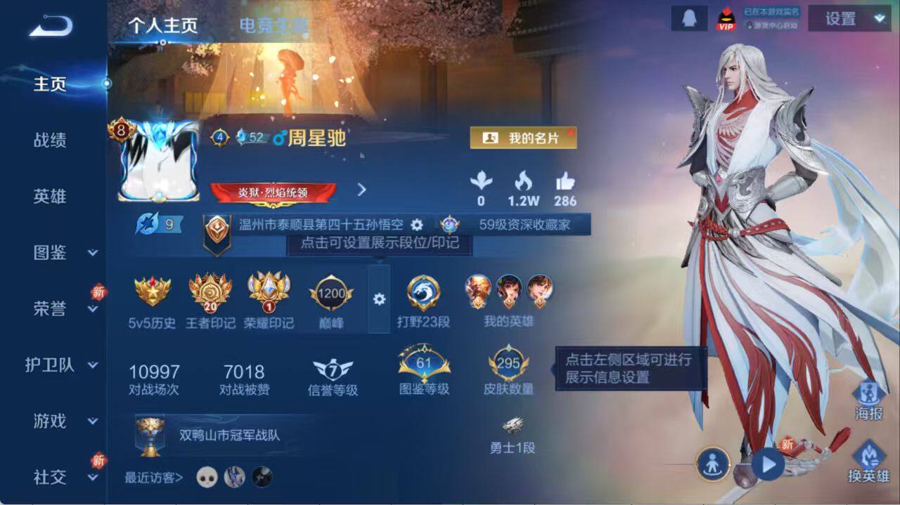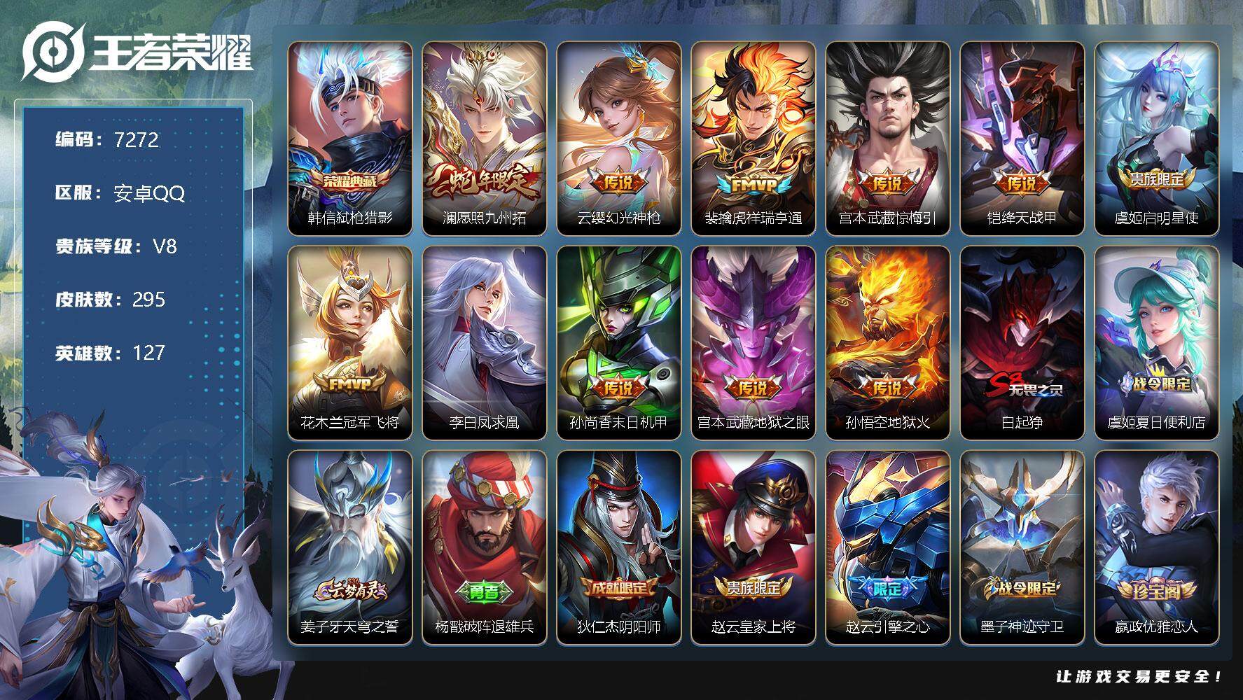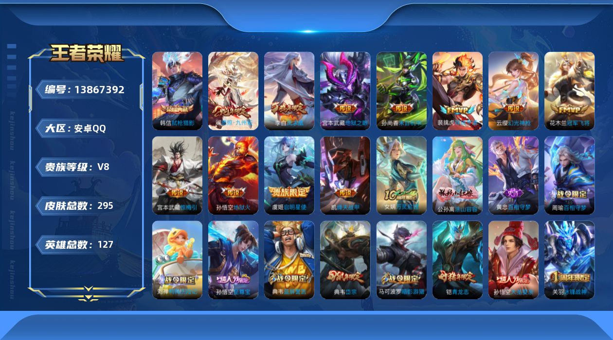 [13867392]安卓Q-V8-最强王者段位-127英雄-295皮肤-1典藏-0珍品无双-0无双-0珍品传说-11传说-77史诗