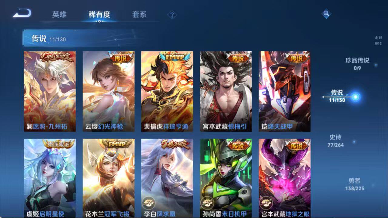 【传说皮肤】:澜愿照九州拓,云缨幻光神枪,裴擒虎祥瑞亨通,宫本武藏惊梅引,铠绛天战甲,虞姬启明星使,花木兰冠军飞将,李白凤求凰,孙尚香末日机甲,宫本武藏地狱之眼,孙悟空地狱火