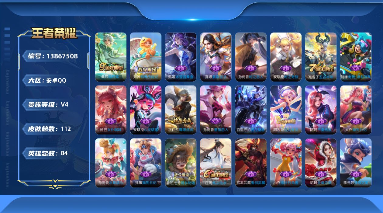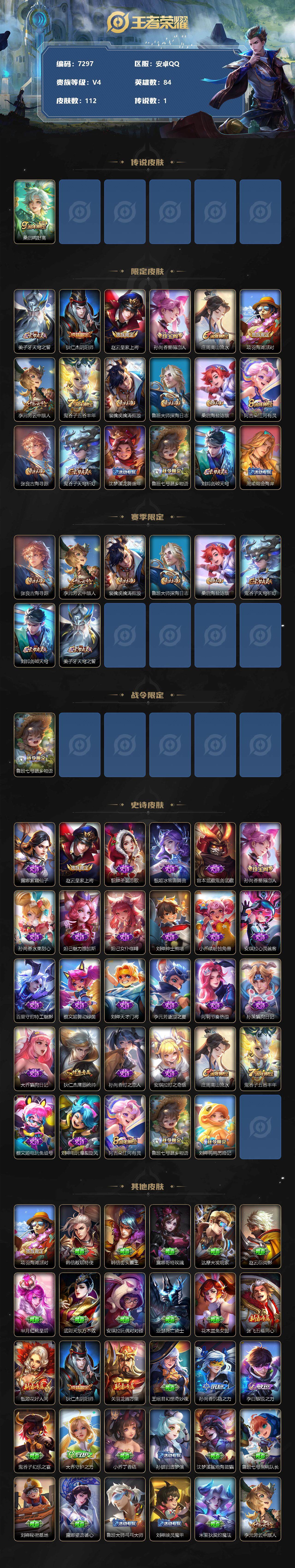 [13867508]安卓Q-V4-荣耀黄金I段位-84英雄-112皮肤-0典藏-0珍品无双-0无双-0珍品传说-1传说-29史诗