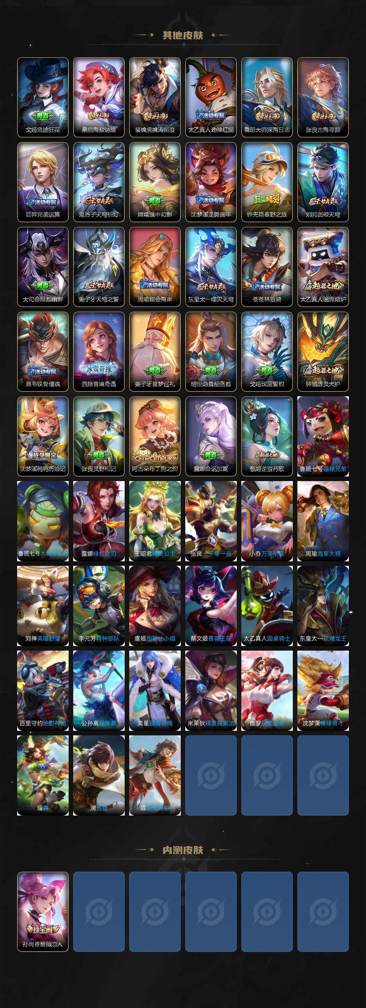 【其他皮肤】:项羽海滩派对,韩信教廷特使,韩信街头霸王,露娜哥特玫瑰,达摩大发明家,赵云忍炎影,芈月红桃皇后,武则天东方不败,安琪拉玩偶对对碰,亚瑟死亡骑士,花木兰兔女郎,张飞五福同心,甄姬花好人间,狄仁杰阴阳师,关羽龙腾万里,王昭君幻想奇妙夜,孙尚香沉稳之力,李白敏锐之力,鬼谷子幻乐之宴,大乔守护之力,小乔丁香结,孙膑归虚梦演,沈梦溪鲨炮海盗猫,鲁班七号黑桃队长,刘禅秘密基地,露娜瓷语鉴心,鲁班大师乓乓大师,刘禅唤灵魔甲,米莱狄契约魔法,李元芳云中旅人,戈娅危途狂花,桑启海盐诗旅,裴擒虎擒涛扼浪,太乙真人劲辣红锅,鲁班大师探海日志,张良古海寻踪,后羿完美运算,鬼谷子天穹祈灯,嫦娥漠中幻影,沈梦溪龙舞盛年,钟无艳春野之旅,刘邦剑破天穹,大司命暗都幽影,姜子牙天穹之誓,周瑜熔金海岸,东皇太一噬灭天穹,苍苍林狼骑,太乙真人谧流熔炉,典韦铁骨偃魂,西施雪境奇遇,姜子牙星梦巡礼,明世隐景韶洛都,戈娅玫蓝誓约,钟馗虚灵犬护,沈梦溪鸭鸭历险记,张良灵野札记,阿古朵布丁狗之约,露娜命运加冕,甄姬逆浪荇歌,艾琳鹤