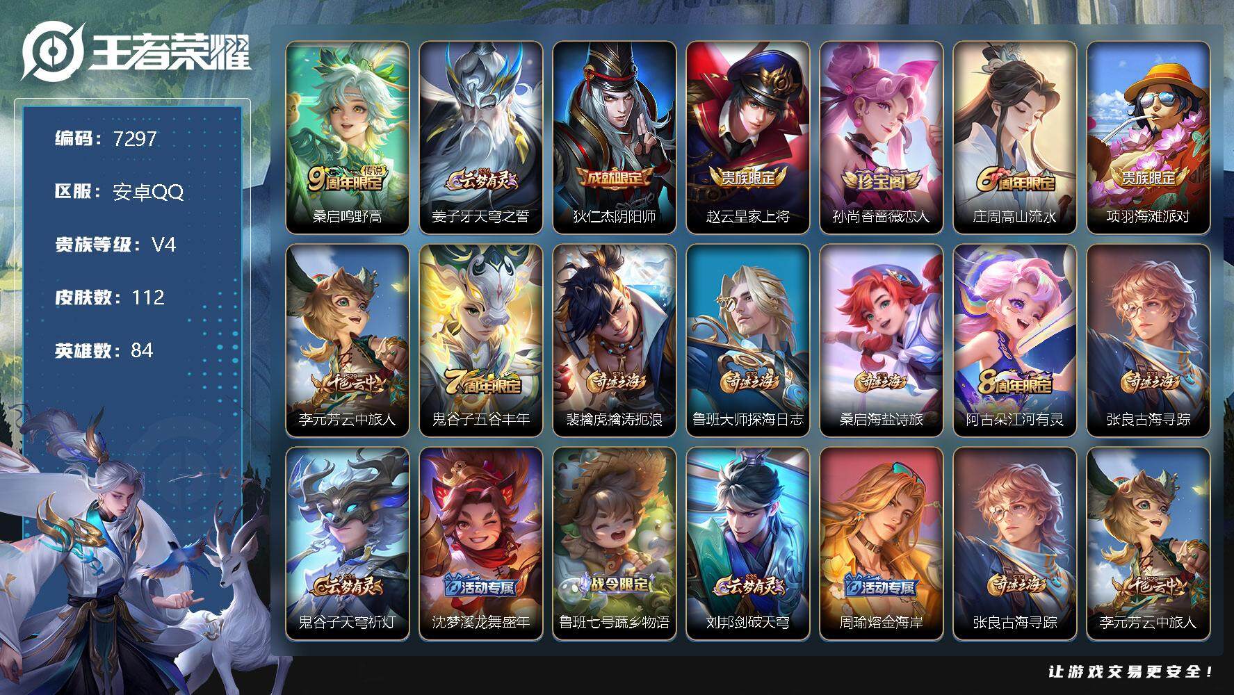 [13867508]安卓Q-V4-荣耀黄金I段位-84英雄-112皮肤-0典藏-0珍品无双-0无双-0珍品传说-1传说-29史诗 【英雄全皮】:刘禅全皮 【传说皮肤】:桑启鸣野蒿 【限定皮肤】:姜子牙天穹之誓,狄仁杰阴阳师,赵云皇家上将,孙尚香蔷薇恋人,庄周高山流水,项羽海滩派对,李元芳云中旅人,鬼谷子五谷丰年,裴擒虎擒涛扼浪,鲁班大师探海日志,桑启海盐诗旅,阿古朵江河有灵,张良古海寻踪,鬼谷子天穹祈灯,沈梦溪龙舞盛年,鲁班七号蔬乡物语,刘邦剑破天穹,周瑜熔金海岸 【赛季限定】:张良古海寻踪,李元芳云中旅人,裴擒虎擒涛扼浪,鲁班大师探海日志,桑启海盐诗旅,鬼谷子天穹祈灯,刘邦剑破天穹,姜子牙天穹之誓 【战令限定】:鲁班七号蔬乡物语 【史诗皮肤】:露娜紫霞仙子,赵云皇家上将,貂蝉圣诞恋歌,甄姬冰雪圆舞曲,宫本武藏鬼剑武藏,孙尚香蔷薇恋人,孙尚香水果甜心,妲己魅力维加斯,妲己女仆咖啡,刘禅绅士熊喵,小乔缤纷独角兽,安琪拉心灵骇客,百里守约特工魅影,蔡文姬舞动绿茵,刘禅天才门将,李元芳逐浪之夏,阿轲节奏热浪,孙策猫狗日记,大乔猫狗日记,狄仁杰鹰眼统帅,孙尚香时之恋人,安琪拉时之奇旅,庄周高山流水,鬼谷子五谷丰年,蔡文姬电玩兔顽号,刘禅电玩爆裂旋风,阿古朵江河有灵,鲁班七号蔬乡物语,刘禅鸭鸭历险记 【其他皮肤】:项羽海滩派对,韩信教廷特使,韩信街头霸王,露娜哥特玫瑰,达摩大发明家,赵云忍炎影,芈月红桃皇后,武则天东方不败,安琪拉玩偶对对碰,亚瑟死亡骑士,花木兰兔女郎,张飞五福同心,甄姬花好人间,狄仁杰阴阳师,关羽龙腾万里,王昭君幻想奇妙夜,孙尚香沉稳之力,李白敏锐之力,鬼谷子幻乐之宴,大乔守护之力,小乔丁香结,孙膑归虚梦演,沈梦溪鲨炮海盗猫,鲁班七号黑桃队长,刘禅秘密基地,露娜瓷语鉴心,鲁班大师乓乓大师,刘禅唤灵魔甲,米莱狄契约魔法,李元芳云中旅人,戈娅危途狂花,桑启海盐诗旅,裴擒虎擒涛扼浪,太乙真人劲辣红锅,鲁班大师探海日志,张良古海寻踪,后羿完美运算,鬼谷子天穹祈灯,嫦娥漠中幻影,沈梦溪龙舞盛年,钟无艳春野之旅,刘邦剑破天穹,大司命暗都幽影,姜子牙天穹之誓,周瑜熔金海岸,东皇太一噬灭天穹,苍苍林狼骑,太乙真人谧流熔炉,典韦铁骨偃魂,西施雪境奇遇,姜子牙星梦巡礼,明世隐景韶洛都,戈娅玫蓝誓约,钟馗虚灵犬护,沈梦溪鸭鸭历险记,张良灵野札记,阿古朵布丁狗之约,露娜命运加冕,甄姬逆浪荇歌,艾琳鹤
