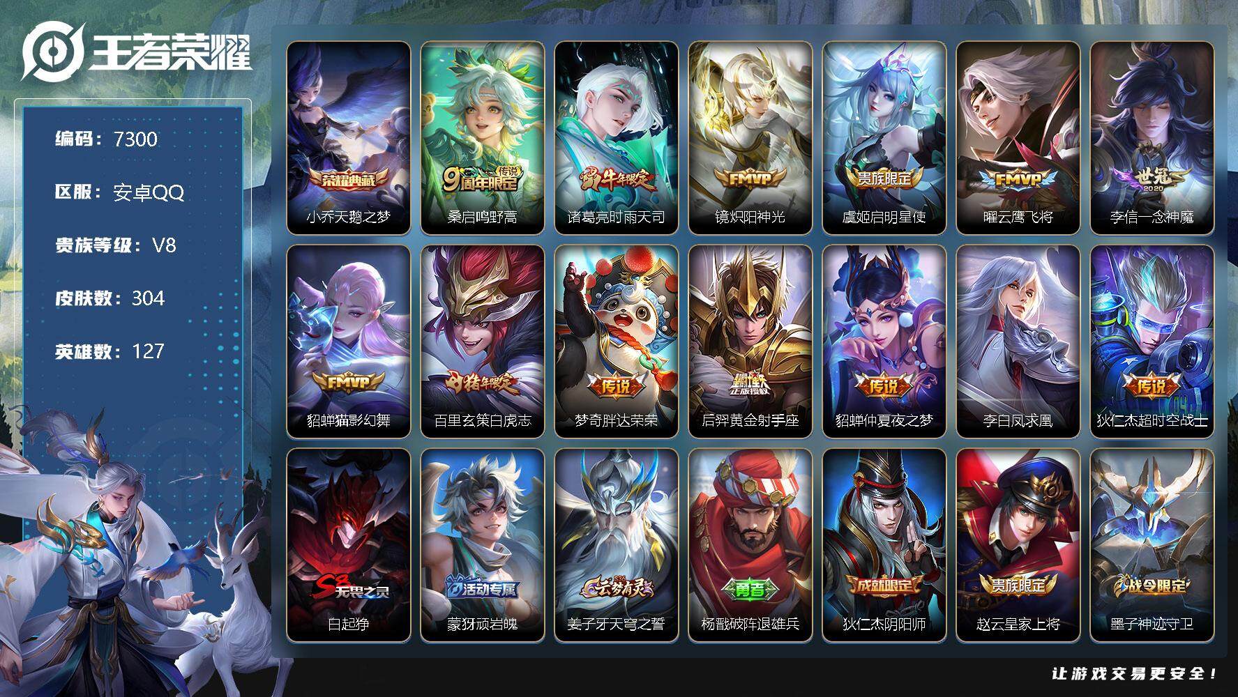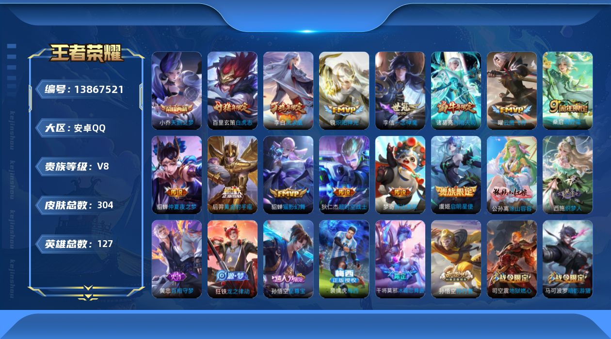 [13867521]安卓Q-V8-至尊星耀III段位-127英雄-304皮肤-1典藏-0珍品无双-0无双-0珍品传说-14传说-93史诗