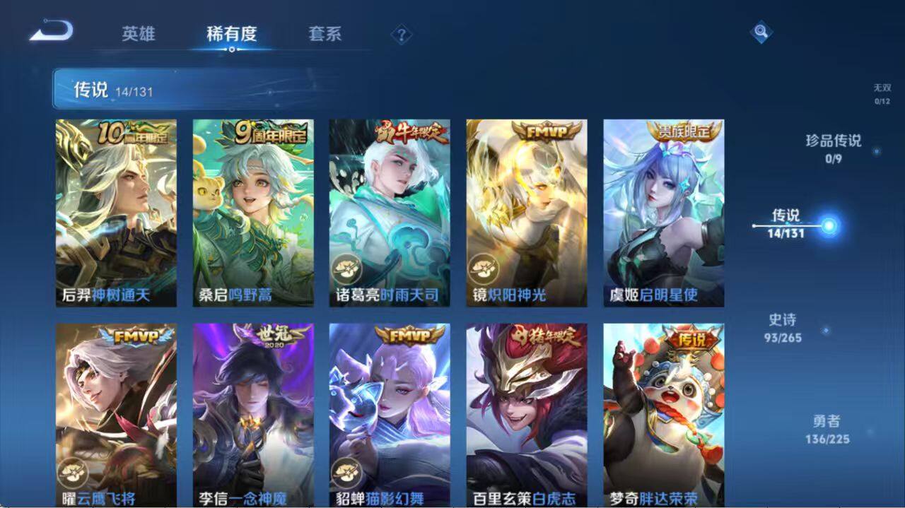 【传说皮肤】:后羿神树通天,桑启鸣野蒿,诸葛亮时雨天司,镜炽阳神光,虞姬启明星使,曜云鹰飞将,李信一念神魔,貂蝉猫影幻舞,百里玄策白虎志,梦奇胖达荣荣,后羿黄金射手座,貂蝉仲夏夜之梦,李白凤求凰,狄仁杰超时空战士