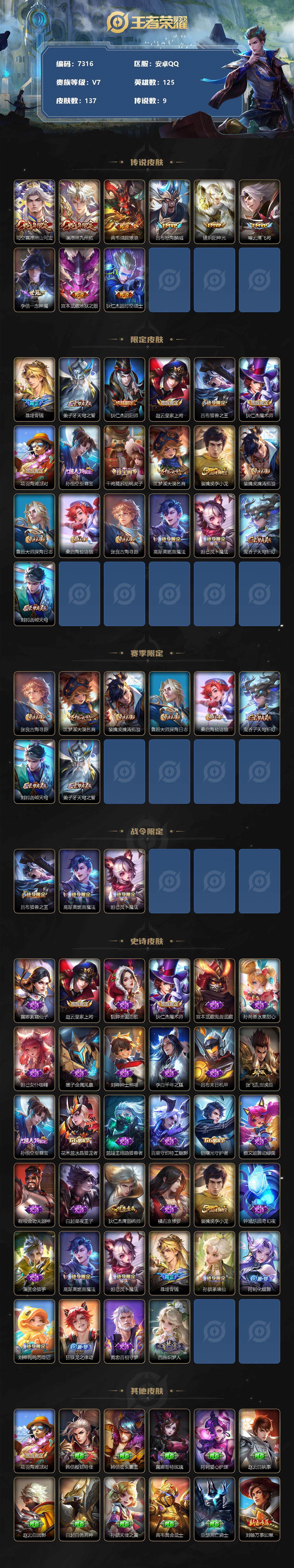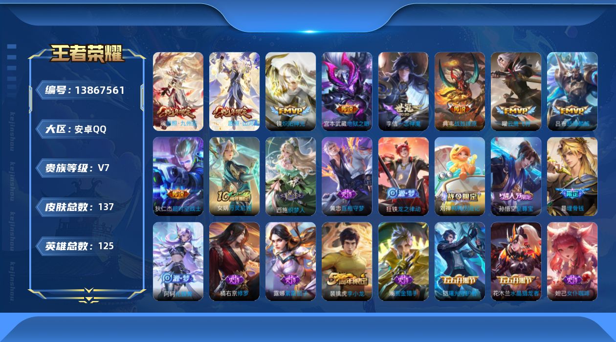 [13867561]安卓Q-V7-至尊星耀III段位-125英雄-137皮肤-0典藏-0珍品无双-0无双-0珍品传说-9传说-34史诗
