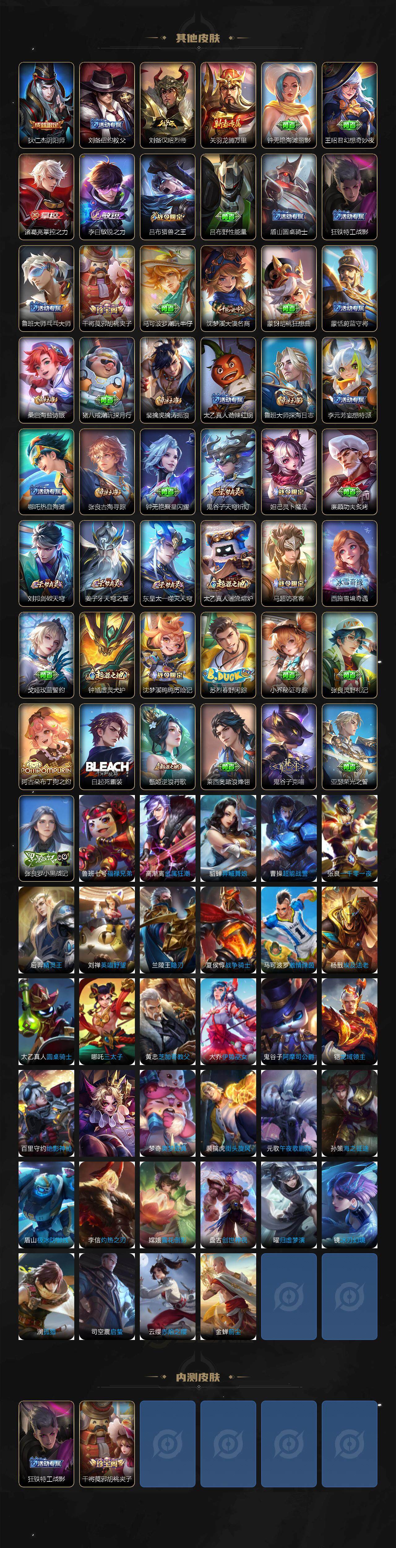 【其他皮肤】:项羽海滩派对,韩信教廷特使,韩信街头霸王,露娜哥特玫瑰,阿轲爱心护理,赵云白执事,赵云忍炎影,白起白色死神,孙膑天使之翼,典韦黄金武士,亚瑟死亡骑士,刘备万事如意,狄仁杰阴阳师,刘备纽约教父,刘备汉昭烈帝,关羽龙腾万里,钟无艳海滩丽影,王昭君幻想奇妙夜,诸葛亮掌控之力,李白敏锐之力,吕布猎兽之王,吕布野性能量,盾山圆桌骑士,狂铁特工战影,鲁班大师乓乓大师,干将莫邪胡桃夹子,马可波罗潮玩牛仔,沈梦溪大漠名商,蒙犽胡桃狂想曲,蒙恬蔚蓝守将,桑启海盐诗旅,猪八戒潮玩探月行,裴擒虎擒涛扼浪,太乙真人劲辣红锅,鲁班大师探海日志,李元芳妄想特派,哪吒热血海滩,张良古海寻踪,钟无艳聚星闪耀,鬼谷子天穹祈灯,妲己灵卜魔法,廉颇功夫炙烤,刘邦剑破天穹,姜子牙天穹之誓,东皇太一噬灭天穹,太乙真人谧流熔炉,马超访茗客,西施