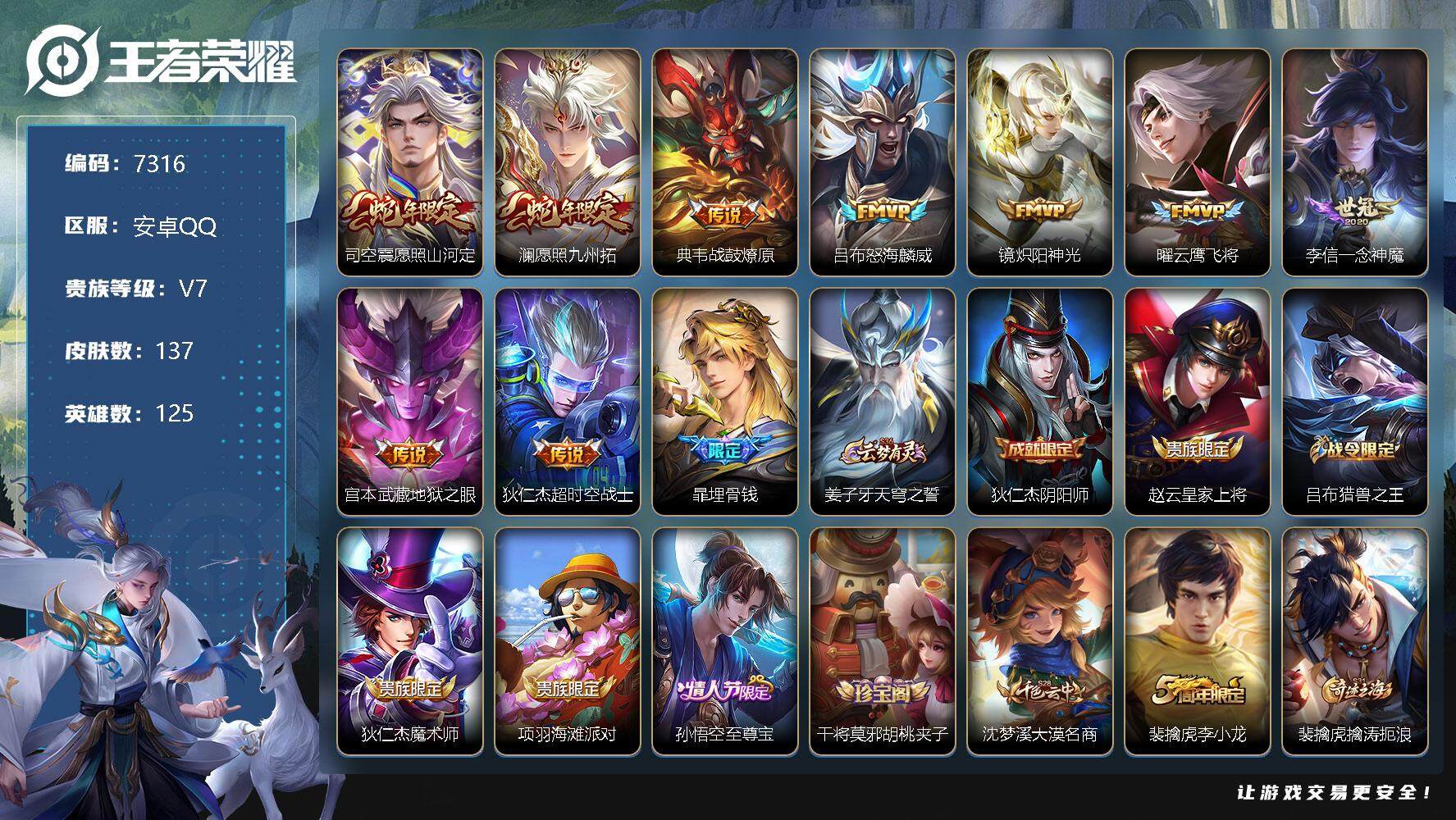 - [13879595]可二次,【店主推荐捡漏号!可直接换绑】安卓Q-V7-最强王者段位-125英雄-259皮肤-1典藏-0珍品无双-1无双-1珍品传说-8传说-84史诗 【英雄全皮】:钟馗全皮 【荣耀典藏】:花木兰九霄神辉 【无双皮肤】:铠神罪 【珍品传说】:宫本武藏黑崎一护 【传说皮肤】:后羿神树通天,澜愿照九州拓,云缨幻光神枪,桑启鸣野蒿,马超无双飞将,诸葛亮时雨天司,达摩黄金狮子座,宫本武藏地狱之眼 【限定皮肤】:白起狰,姜子牙天穹之誓,狄仁杰阴阳师,赵云皇家上将,嬴政白昼王子,鲁班七号狮舞东方,庄周高山流水,钟无艳王者之锤,钟无艳超时空战士,芈月重明,芈月白晶晶,吕布猎兽之王,周瑜赤莲之焰,元歌无心,夏侯惇朔风刀,甄姬落雪兰心,典韦穷奇,典韦蓝屏警告,马可波罗逐梦之星,马可波罗暗影游猎,狄仁杰魔术师,狄仁杰万华元夜,达摩沙漠行僧,项羽海滩派对,老夫子醍醐杖,程咬金演武夺筹,露娜一生所爱,韩信飞衡,兰陵王驯魔猎人,兰陵王金庭之子,亚瑟潮玩骑士王,孙悟空至尊宝,孙悟空大圣娶亲,孙悟空孙行者,牛魔御旌,李元芳云中旅人,钟馗神迹守卫,钟馗驱傩正仪,杨玉环遇见飞天,女娲朔望之晖,干将莫邪冰霜恋舞曲,干将莫邪胡桃夹子,雅典娜单词大作战,雅典娜黎明之约,太乙真人饕餮,鬼谷子原初探秘者,鬼谷子五谷丰年,诸葛亮时雨天司,百里玄策原初追逐者,弈星混沌棋,梦奇顽趣,沈梦溪大漠名商,明世隐疑决卦,裴擒虎李小龙,裴擒虎擒涛扼浪,狂铁御狮,米莱狄御霄,米莱狄胡桃异想国,云中君纤云弄巧,盾山御銮,上官婉儿梁祝,嫦娥暖冬兔眠,蒙犽狂想玩偶喵,鲁班大师探海日志,桑启海盐诗旅,暃星界游侠,艾琳女武神,阿古朵江河有灵,张良古海寻踪,蒙恬荣光圣徽,鬼谷子天穹祈灯,刘邦剑破天穹,项羽苍威无极 【年限皮肤】:诸葛亮时雨天司,韩信飞衡 【赛季限定】:白起狰,芈月重明,夏侯惇朔风刀,典韦穷奇,狄仁杰万华元夜,达摩沙漠行僧,老夫子醍醐杖,程咬金演武夺筹,兰陵王金庭之子,张良古海寻踪,牛魔御旌,李元芳云中旅人,钟馗驱傩正仪,雅典娜黎明之约,太乙真人饕餮,鬼谷子原初探秘者,百里玄策原初追逐者,弈星混沌棋,梦奇顽趣,沈梦溪大漠名商,明世隐疑决卦,裴擒虎擒涛扼浪,狂铁御狮,米莱狄御霄,盾山御銮,鲁班大师探海日志,桑启海盐诗旅,鬼谷子天穹祈灯,蒙恬荣光圣徽,刘邦剑破天穹,姜子牙天穹之誓 【战令限定】:嬴政白昼王子,鲁班七号狮舞东方,钟无