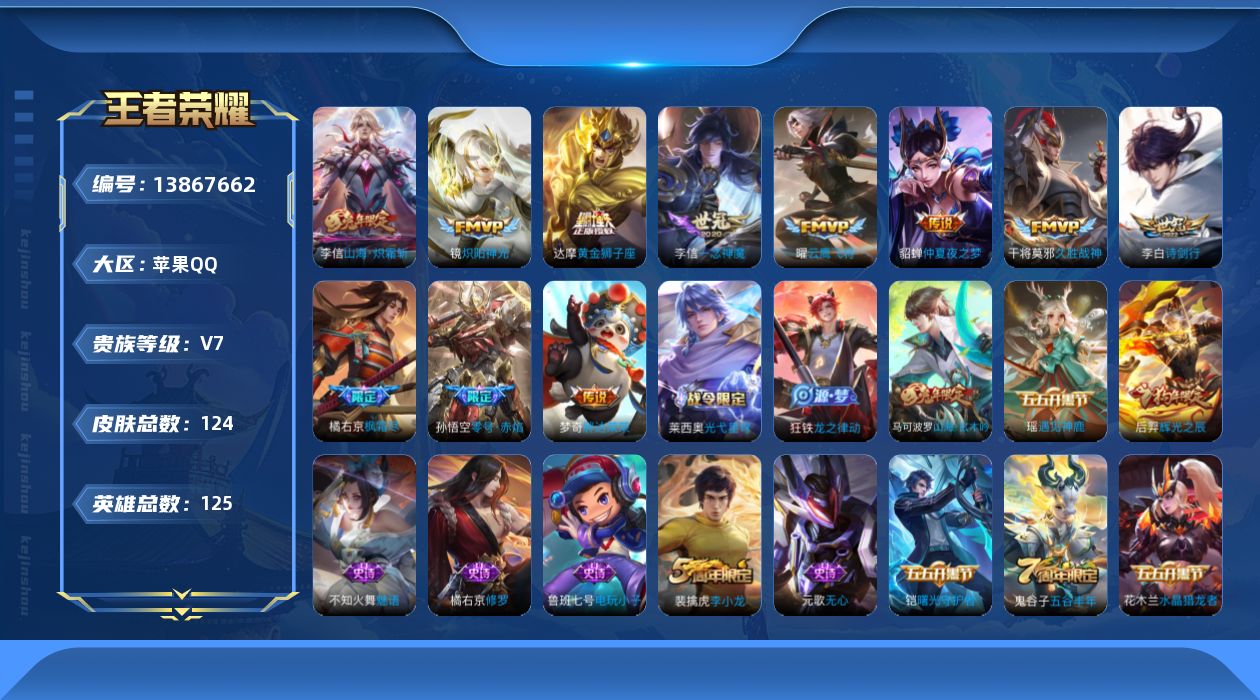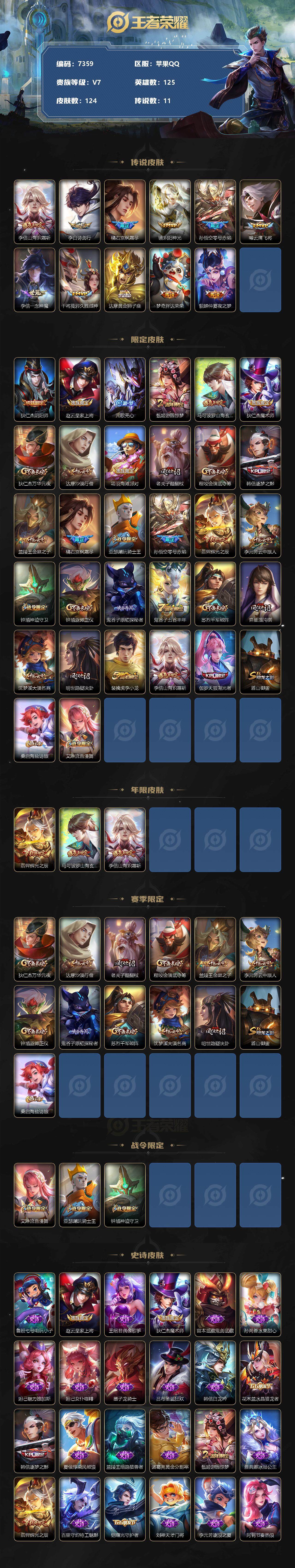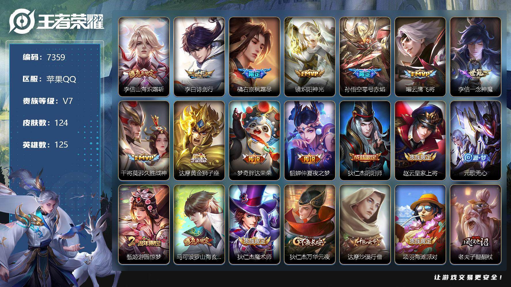 [13867662]苹果Q-V7-至尊星耀III段位-125英雄-124皮肤-0典藏-0珍品无双-0无双-0珍品传说-11传说-38史诗