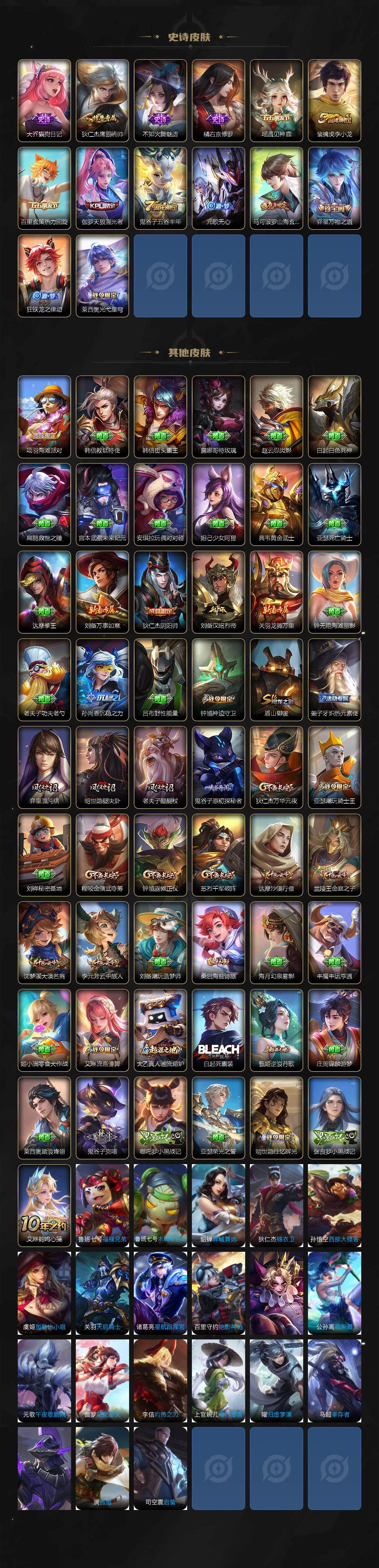 【史诗皮肤】:鲁班七号电玩小子,赵云皇家上将,王昭君偶像歌手,狄仁杰魔术师,宫本武藏鬼剑武藏,孙尚香水果甜心,妲己魅力维加斯,妲己女仆咖啡,墨子龙骑士,吕布圣诞狂欢,韩信白龙吟,花木兰水晶猎龙者,韩信逐梦之影,夏侯惇乘风破浪,兰陵王暗隐猎兽者,诸葛亮黄金分割率,甄姬游园惊梦,雅典娜冰冠公主,后羿辉光之辰,百里守约特工魅影,铠曙光守护者,刘禅天才门将,李元芳逐浪之夏,阿轲节奏热浪,大乔猫狗日记,狄仁杰鹰眼统帅,不知火舞魅语,橘右京修罗,瑶遇见神鹿,裴擒虎李小龙,百里玄策热力回旋,伽罗天狼溯光者,鬼谷子五谷丰年,元歌无心,马可波罗山海玄木吟,弈星万物之道,狂铁龙之律动,莱西奥光弋星穹