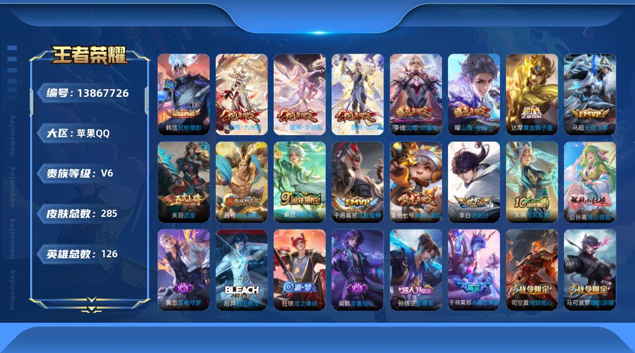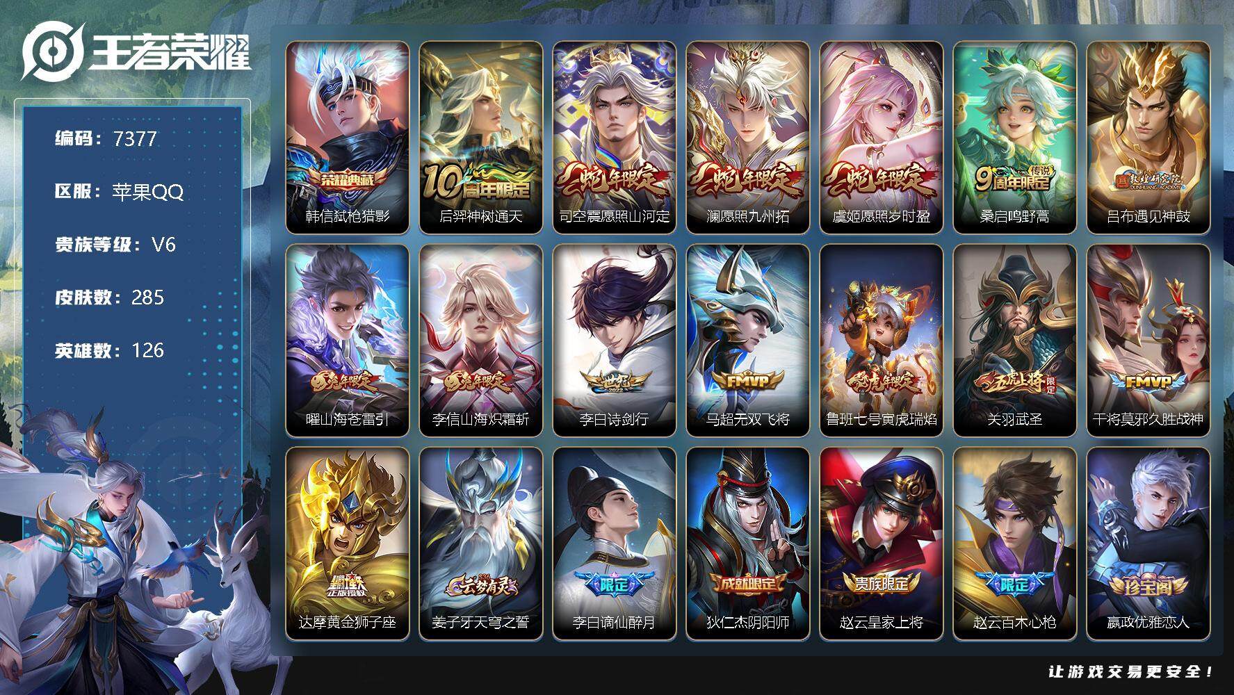 [13867726]苹果Q-V6-最强王者段位-126英雄-285皮肤-1典藏-0珍品无双-0无双-0珍品传说-14传说-81史诗