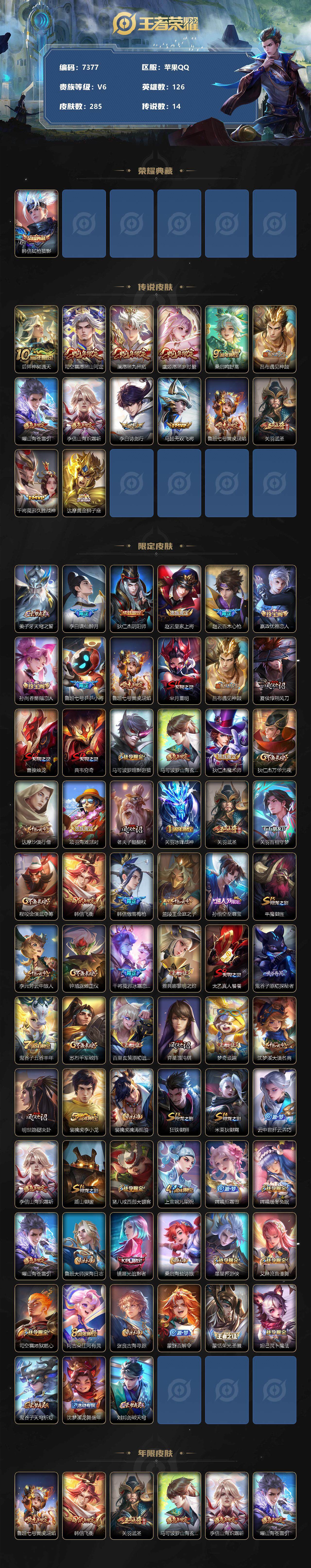 - [12175609]V7 3传说 125英雄 249皮肤 可修改实名 优质装备:黄金狮子座,一念神魔,零号·赤焰,涂山容容 珍宝阁皮:女武神,玩趣恶龙 限定皮:神威(电光马子),高山流水,五谷丰年,天狼运算者,梁祝,李小龙,朱雀志(守约年限),孙行者,大圣娶亲,山海·玄木吟(马可年限) 史诗皮:琥珀纪元伽罗,石田雨龙,百相守梦-周瑜,百相守梦-黄忠,蒙犽顽岩魄,苍穹之光,白龙吟,黄金分割率,特工魅影,千年之狐,永昼,冰冠公主,江河有灵,百解令(蒙犽),蒙恬荣光圣徽,魅语,末日机甲-吕布,猫狗日记-孙策,猫狗日记-大乔,乱世虎臣,节奏热浪,修罗,女仆咖啡,摇滚巨星,水果甜心,天才门将,星夜王子,时之奇旅-安琪拉,功夫厨神,德古拉伯爵,暗隐猎兽者,幽灵船长,鬼剑武藏,心灵战警,舞动绿茵,地狱岩魂,纤云弄巧,繁星吟游(呼啦呼啦),拒霜思,缤纷独角兽,乘风破浪,逐浪之夏,水晶猎龙者,曙光守护者,箭羽风息,金属风暴,原初追逐者,圣诞恋歌,鹰眼统帅,王者之锤,暗夜贵公子,魅力维加斯,黎明之约,无心