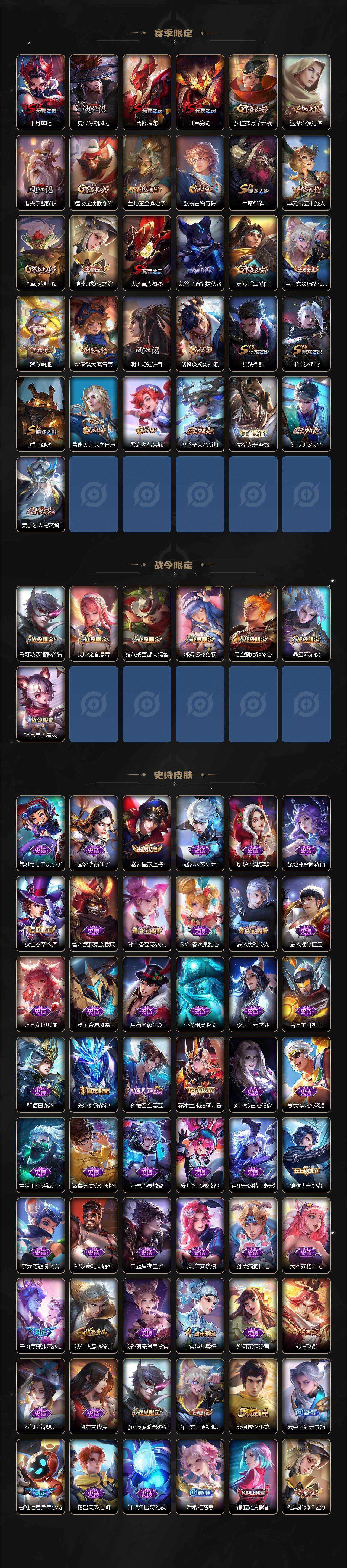 【赛季限定】:芈月重明,夏侯惇朔风刀,曹操烛龙,典韦穷奇,狄仁杰万华元夜,达摩沙漠行僧,老夫子醍醐杖,程咬金演武夺筹,兰陵王金庭之子,张良古海寻踪,牛魔御旌,李元芳云中旅人,钟馗驱傩正仪,雅典娜黎明之约,太乙真人饕餮,鬼谷子原初探秘者,苏烈千军破阵,百里玄策原初追逐者,弈星混沌棋,梦奇顽趣,沈梦溪大漠名商,明世隐疑决卦,裴擒虎擒涛扼浪,狂铁御狮,米莱狄御霄,盾山御銮,鲁班大师探海日志,桑启海盐诗旅,鬼谷子天穹祈灯,蒙恬荣光圣徽,刘邦剑破天穹,姜子牙天穹之誓