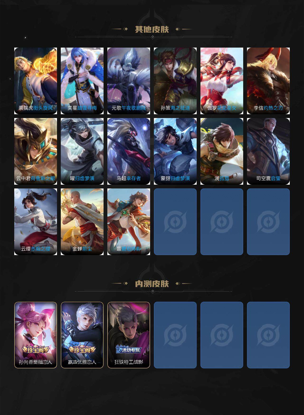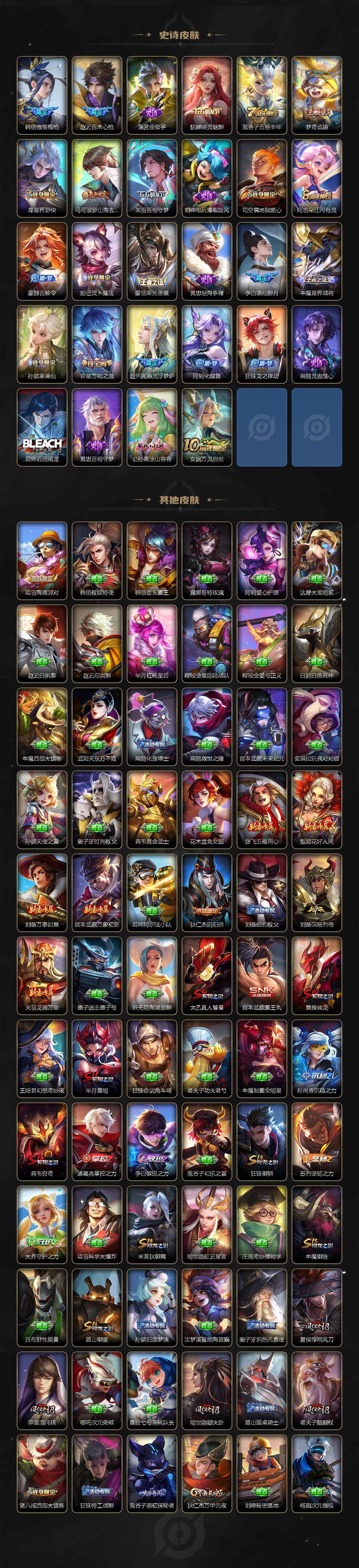 【限定皮肤】:姜子牙天穹之誓,李白谪仙醉月,狄仁杰阴阳师,赵云皇家上将,赵云百木心枪,嬴政优雅恋人,孙尚香蔷薇恋人,鲁班七号乒乒小将,鲁班七号寅虎瑞焰,芈月重明,吕布遇见神鼓,夏侯惇朔风刀,曹操烛龙,典韦穷奇,马可波罗暗影游猎,马可波罗山海玄木吟,狄仁杰魔术师,狄仁杰万华元夜,达摩沙漠行僧,项羽海滩派对,老夫子醍醐杖,关羽冰锋战神,关羽武圣,关羽百相守梦,程咬金演武夺筹,韩信飞衡,韩信傲雪梅枪,兰陵王金庭之子,孙悟空至尊宝,牛魔御旌,李元芳云中旅人,钟馗驱傩正仪,干将莫邪冰霜恋舞曲,雅典娜黎明之约,太乙真人饕餮,鬼谷子原初探秘者,鬼谷子五谷丰年,苏烈千军破阵,百里玄策原初追逐者,弈星混沌棋,梦奇顽趣,沈梦溪大漠名商,明世隐疑决卦,裴擒虎李小龙,裴擒虎擒涛扼浪,狂铁御狮,米莱狄御霄,云中君纤云弄巧,李信山海炽霜斩,盾山御銮,猪八戒西部大镖客,上官婉儿梁祝,嫦娥拒霜思,嫦娥暖冬兔眠,曜山海苍雷引,鲁班大师探海日志,镜匿光追影者,桑启海盐诗旅,暃星界游侠,艾琳流音漫舞,司空震地狱燃心,阿古朵江河有灵,张良古海寻踪,蒙犽百解令,蒙恬荣光圣徽,妲己灵卜魔法,鬼谷子天穹祈灯,沈梦溪龙舞盛年,刘邦剑破天穹