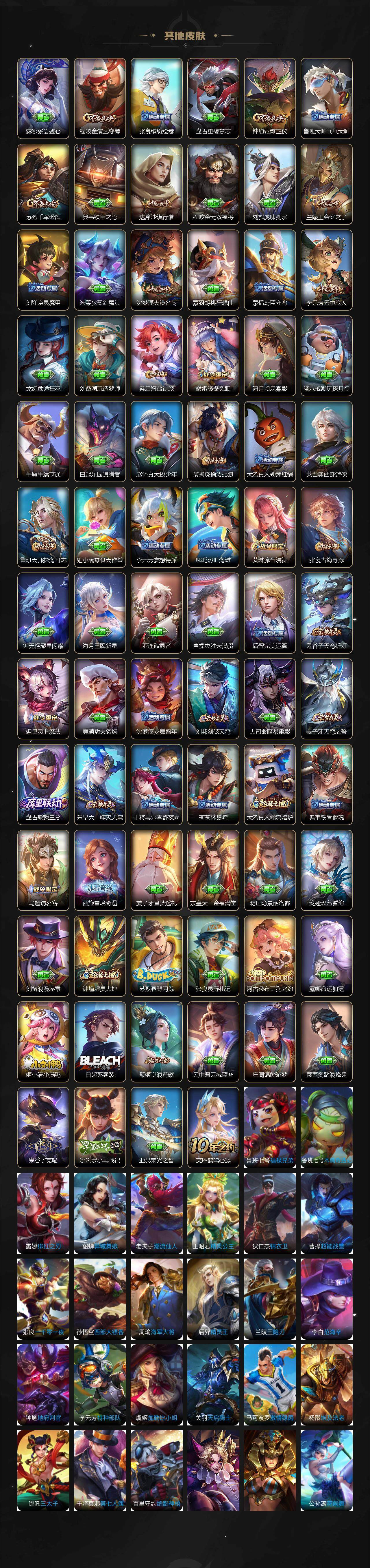 娜可露露晚萤,李元芳逐浪之夏,不知火舞魅语,公孙离无限星赏官,大乔猫狗日记,孙策猫狗日记,阿轲节奏热浪,露娜紫霞仙子,诸葛亮黄金分割率,韩信白龙吟,吕布末日机甲,鲁班七号电玩小子,橘右京修罗,嬴政摇滚巨星,白起星夜王子,安琪拉心灵骇客,程咬金功夫厨神,刘邦德古拉伯爵,兰陵王暗隐猎兽者,曹操幽灵船长,宫本武藏鬼剑武藏,亚瑟心灵战警,钟馗乐园奇幻夜,杨戬天秀·启明,夏侯惇乘风破浪,花木兰水晶猎龙者,铠曙光守护者,墨子金属风暴,百里玄策原初追逐者,吕布圣诞狂欢,貂蝉圣诞恋歌,百里守约特工魅影,嫦娥拒霜思,雅典娜黎明之约,李白千年之狐,澜赏金猎手,貂蝉唤灵魅影,关羽百相守梦,刘禅电玩·爆裂旋风,蒙犽百解令,李白谪仙醉月,赵怀真器灵·浮梦炉