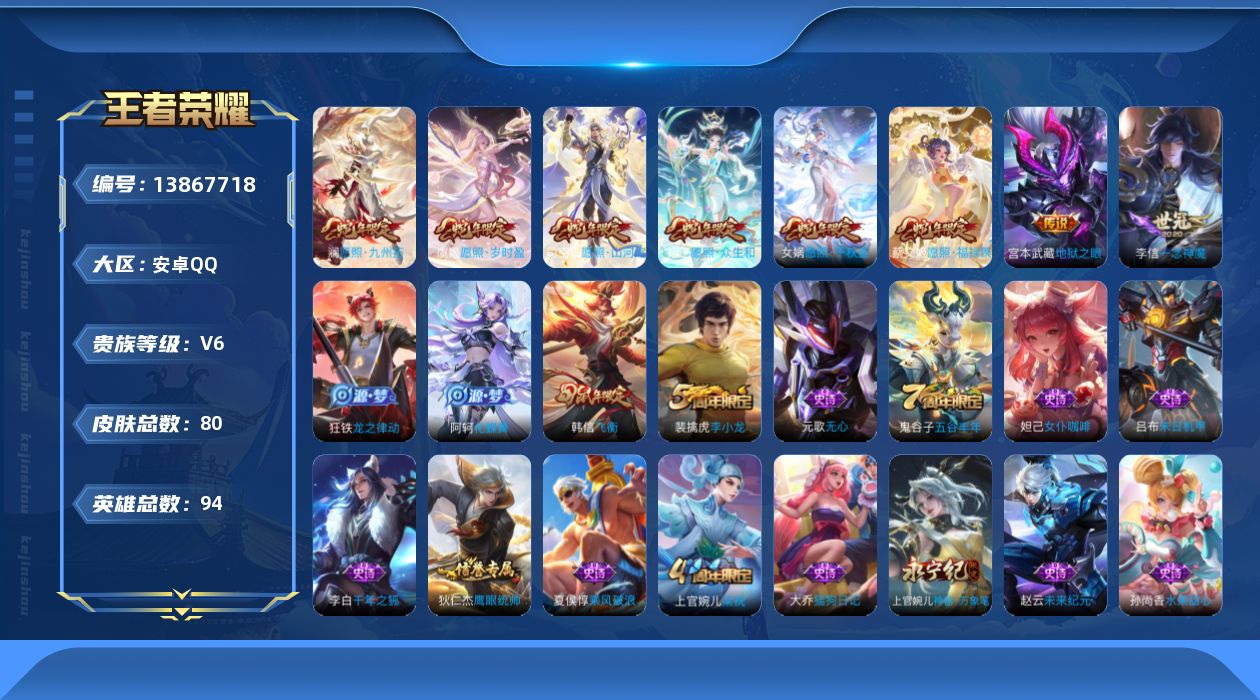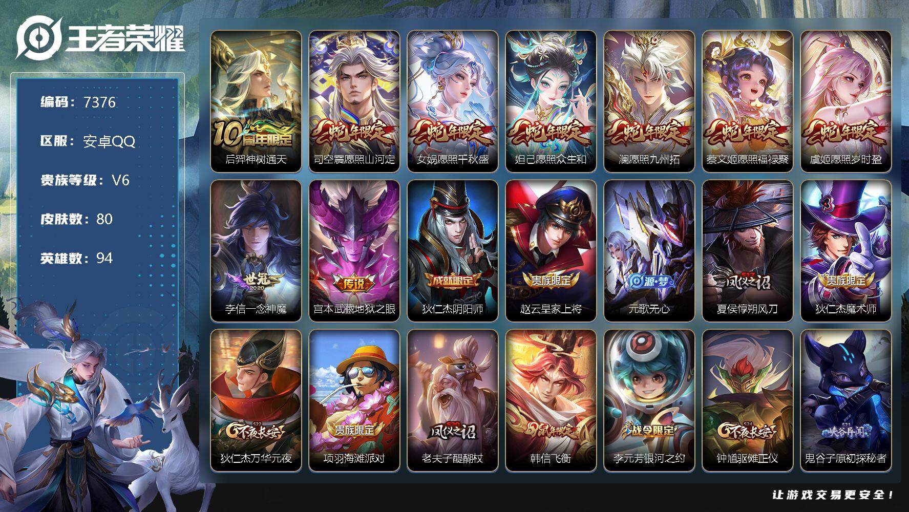 [13867718]安卓Q-V6-尊贵铂金I段位-94英雄-80皮肤-0典藏-0珍品无双-0无双-0珍品传说-9传说-22史诗