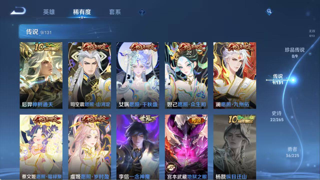 【传说皮肤】:后羿神树通天,司空震愿照山河定,女娲愿照千秋盛,妲己愿照众生和,澜愿照九州拓,蔡文姬愿照福禄聚,虞姬愿照岁时盈,李信一念神魔,宫本武藏地狱之眼