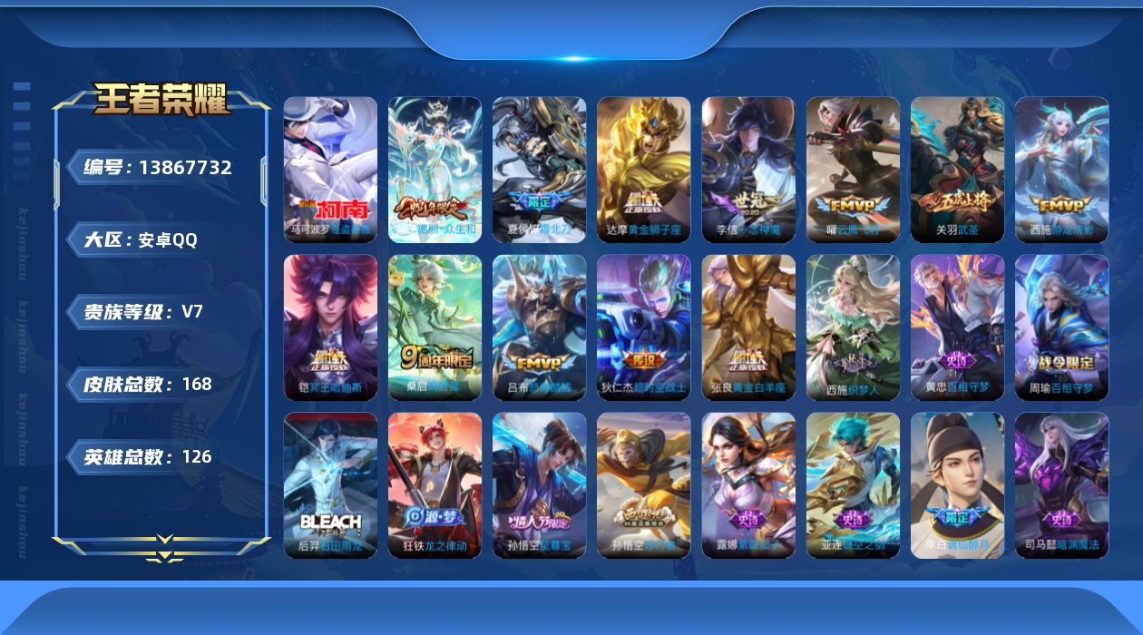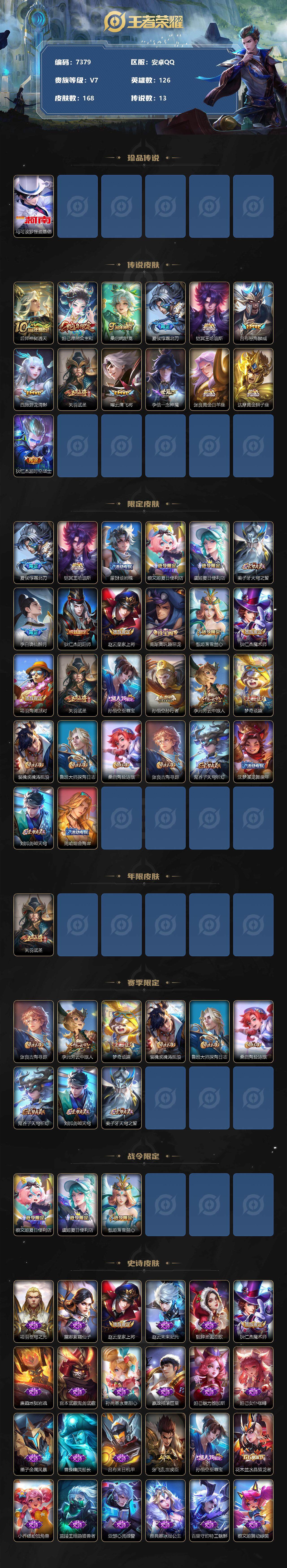 [13867732]安卓Q-V7-最强王者段位-126英雄-168皮肤-0典藏-0珍品无双-0无双-1珍品传说-13传说-48史诗