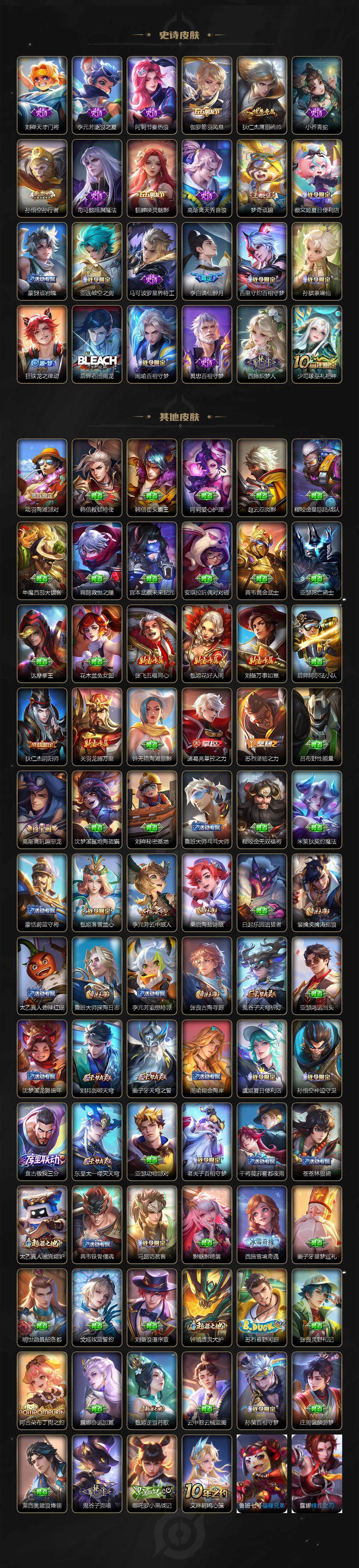 【史诗皮肤】:项羽苍穹之光,露娜紫霞仙子,赵云皇家上将,赵云未来纪元,貂蝉圣诞恋歌,狄仁杰魔术师,廉颇地狱岩魂,宫本武藏鬼剑武藏,孙尚香水果甜心,嬴政摇滚巨星,妲己魅力维加斯,妲己女仆咖啡,墨子金属风暴,曹操幽灵船长,吕布末日机甲,张飞乱世虎臣,孙悟空至尊宝,花木兰水晶猎龙者,小乔缤纷独角兽,兰陵王暗隐猎兽者,亚瑟心灵战警,雅典娜冰冠公主,百里守约特工魅影,蔡文姬舞动绿茵,刘禅天才门将,李元芳逐浪之夏,阿轲节奏热浪,伽罗箭羽风息,狄仁杰鹰眼统帅,小乔青蛇,孙悟空孙行者,司马懿暗渊魔法,貂蝉唤灵魅影,高渐离天秀音浪,梦奇顽趣,蔡文姬夏日便利店,蒙犽顽岩魄,亚连破空之剑,马可波罗星界特工,李白谪仙醉月,百里守约百相守梦,孙膑茶境仙,狂铁龙之律动,后羿石田雨龙,周瑜百相守梦,黄忠百相守梦,西施织梦人,少司缘巫礼祀神
