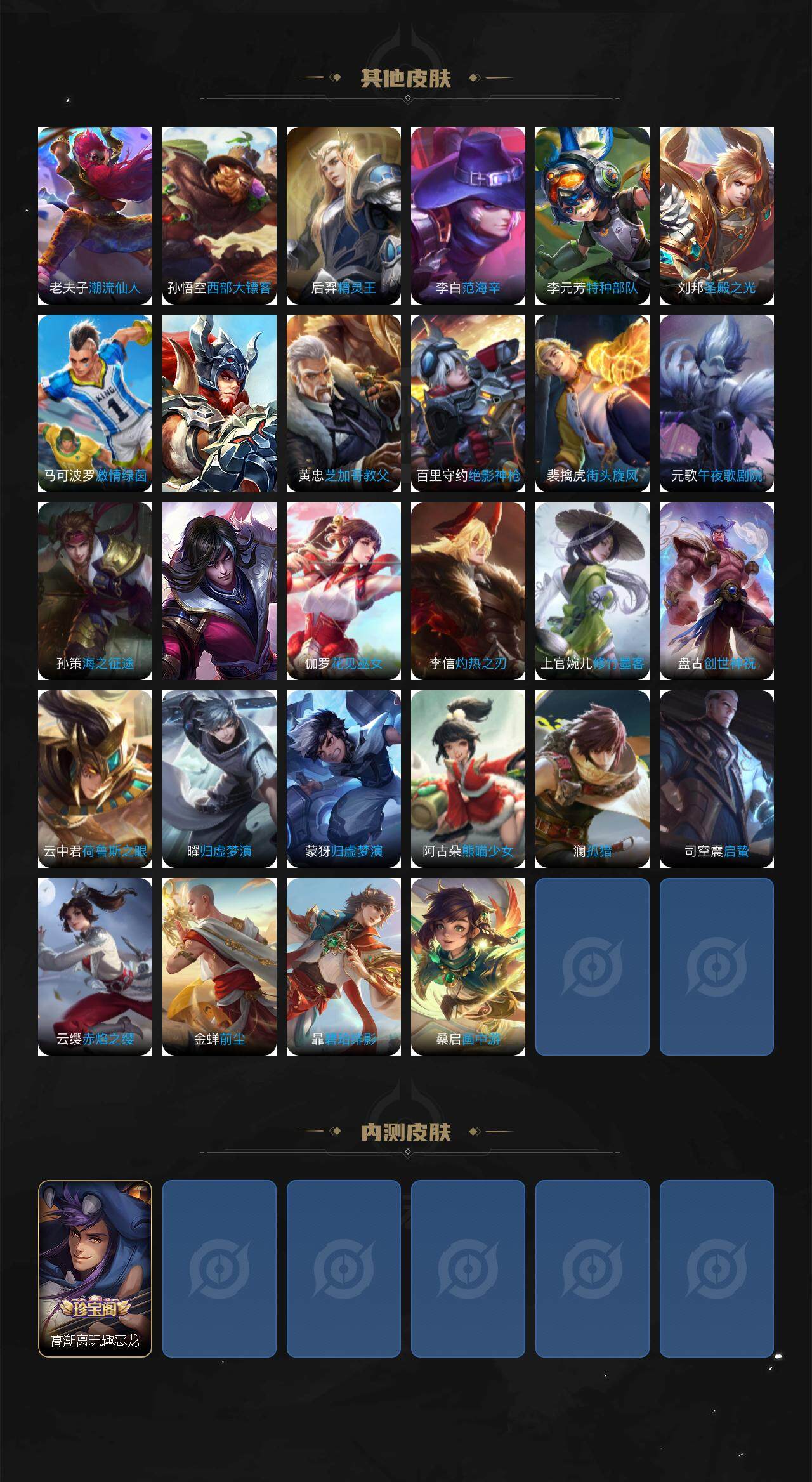 【传说皮肤】:后羿神树通天,妲己愿照众生和,桑启鸣野蒿,夏侯惇霜北刀,铠冥王哈迪斯,吕布怒海麟威,西施游龙清影,关羽武圣,曜云鹰飞将,李信一念神魔,张良黄金白羊座,达摩黄金狮子座,狄仁杰超时空战士