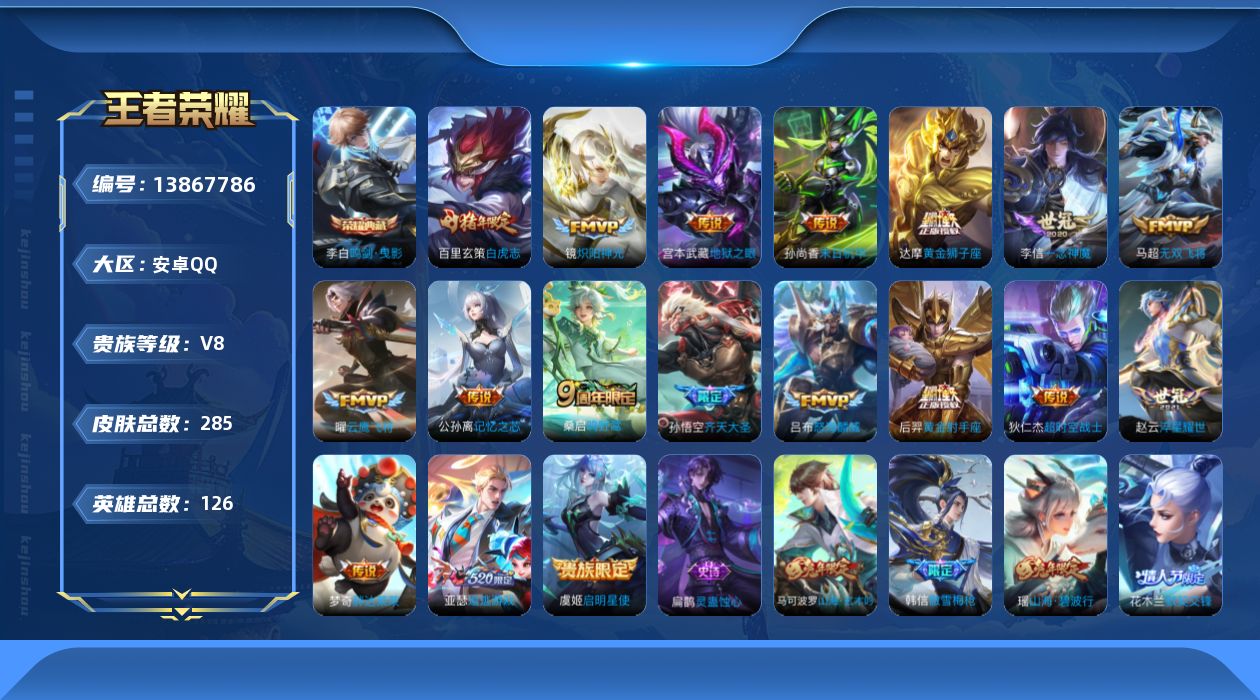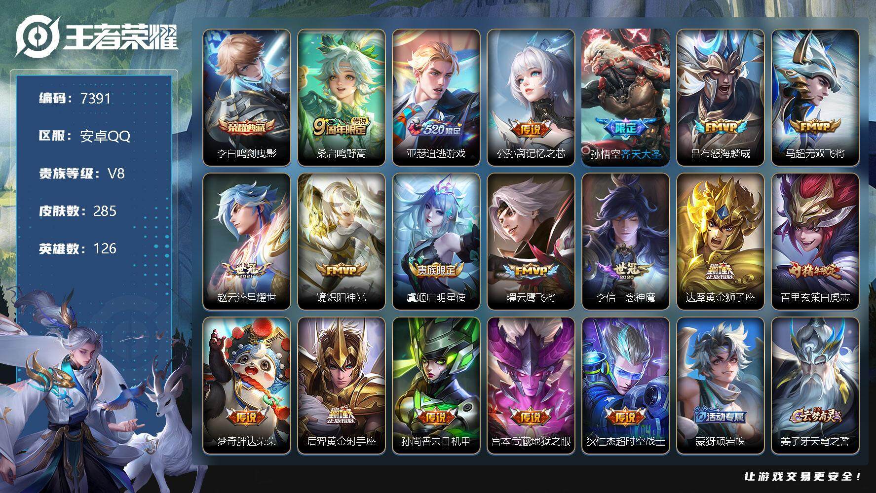 - [11540263]【商品标题】:安卓Q-V7-最强王者段位-124英雄-208皮肤-1典藏-0珍品无双-0无双-0珍品传说-3传说-54史诗 【荣耀典藏】:李白鸣剑曳影 【传说皮肤】:桑启鸣野蒿,孙尚香末日机甲,狄仁杰超时空战士 【限定皮肤】:姜子牙天穹之誓,狄仁杰阴阳师,赵云皇家上将,嬴政白昼王子,鲁班七号狮舞东方,高渐离玩趣恶龙,芈月重明,吕布猎兽之王,周瑜赤莲之焰,元歌无心,夏侯惇朔风刀,甄姬游园惊梦,曹操烛龙,典韦穷奇,马可波罗暗影游猎,狄仁杰魔术师,狄仁杰万华元夜,达摩沙漠行僧,项羽海滩派对,老夫子醍醐杖,程咬金演武夺筹,兰陵王金庭之子,牛魔御旌,李元芳银河之约,李元芳云中旅人,钟馗神迹守卫,钟馗驱傩正仪,杨玉环遇见飞天,雅典娜单词大作战,雅典娜黎明之约,蔡文姬繁星吟游,太乙真人饕餮,鬼谷子原初探秘者,苏烈千军破阵,百里玄策原初追逐者,弈星混沌棋,沈梦溪星空之诺,沈梦溪大漠名商,明世隐疑决卦,裴擒虎李小龙,裴擒虎擒涛扼浪,狂铁御狮,米莱狄御霄,盾山御銮,猪八戒西部大镖客,上官婉儿梁祝,蒙犽狂想玩偶喵,鲁班大师探海日志,桑启海盐诗旅,艾琳女武神,阿古朵江河有灵,张良古海寻踪,高渐离燃音魔法,妲己灵卜魔法,鬼谷子天穹祈灯,沈梦溪龙舞盛年,刘邦剑破天穹 【赛季限定】:芈月重明,夏侯惇朔风刀,曹操烛龙,典韦穷奇,狄仁杰万华元夜,达摩沙漠行僧,老夫子醍醐杖,程咬金演武夺筹,兰陵王金庭之子,张良古海寻踪,牛魔御旌,李元芳云中旅人,钟馗驱傩正仪,雅典娜黎明之约,太乙真人饕餮,鬼谷子原初探秘者,苏烈千军破阵,百里玄策原初追逐者,弈星混沌棋,沈梦溪大漠名商,明世隐疑决卦,裴擒虎擒涛扼浪,狂铁御狮,米莱狄御霄,盾山御銮,鲁班大师探海日志,桑启海盐诗旅,鬼谷子天穹祈灯,刘邦剑破天穹,姜子牙天穹之誓 【战令限定】:嬴政白昼王子,鲁班七号狮舞东方,吕布猎兽之王,周瑜赤莲之焰,马可波罗暗影游猎,李元芳银河之约,钟馗神迹守卫,雅典娜单词大作战,沈梦溪星空之诺,猪八戒西部大镖客,蒙犽狂想玩偶喵,高渐离燃音魔法,妲己灵卜魔法 【史诗皮肤】:鲁班七号电玩小子,露娜紫霞仙子,阿轲暗夜猫娘,赵云皇家上将,赵云未来纪元,貂蝉圣诞恋歌,甄姬冰雪圆舞曲,狄仁杰魔术师,宫本武藏鬼剑武藏,孙尚香水果甜心,妲己魅力维加斯,妲己女仆咖啡,墨子金属风暴,吕布圣诞狂欢,曹操幽灵船长,李白千年之狐,花木兰水晶猎龙者,刘邦德古拉伯爵