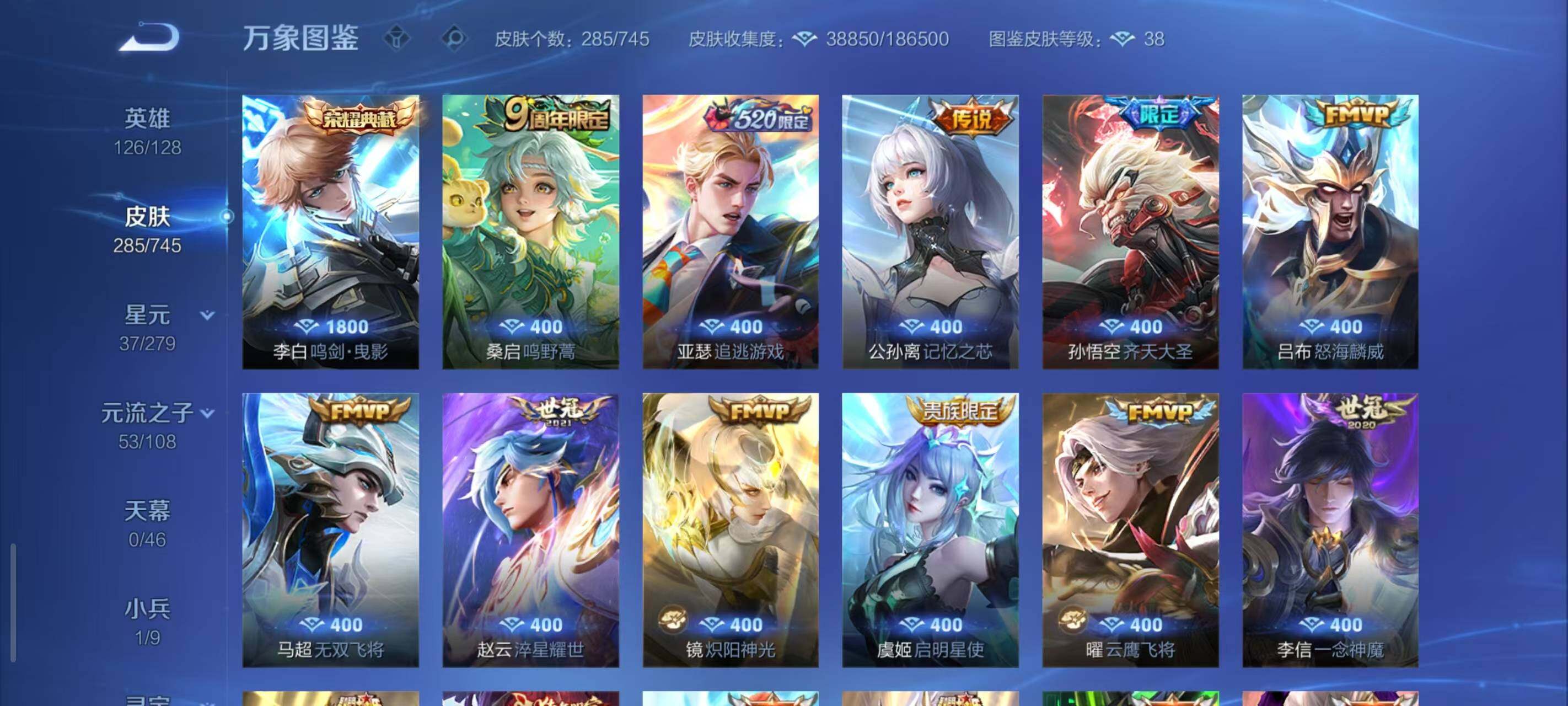 【限定皮肤】:蒙犽顽岩魄,姜子牙天穹之誓,狄仁杰阴阳师,赵云皇家上将,嬴政优雅恋人,庄周云端筑梦师,庄周高山流水,高渐离死亡摇滚,高渐离玩趣恶龙,甄姬游园惊梦,马可波罗山海玄木吟,狄仁杰魔术师,狄仁杰万华元夜,达摩沙漠行僧,项羽海滩派对,老夫子醍醐杖,程咬金演武夺筹,韩信傲雪梅枪,兰陵王金庭之子,花木兰默契交锋,亚瑟追逃游戏,孙悟空齐天大圣,后羿如梦令,后羿圣弓游侠,张飞虎魄,李元芳云中旅人,虞姬启明星使,钟馗驱傩正仪,干将莫邪真爱魔法,雅典娜黎明之约,蔡文姬繁星吟游,鬼谷子原初探秘者,鬼谷子五谷丰年,苏烈千军破阵,百里玄策白虎志,百里玄策原初追逐者,弈星混沌棋,梦奇顽趣,沈梦溪大漠名商,明世隐疑决卦,裴擒虎李小龙,裴擒虎擒涛扼浪,瑶山海碧波行,云中君纤云弄巧,猪八戒猪悟能,嫦娥拒霜思,西施玲珑珍味,鲁班大师探海日志,桑启海盐诗旅,金蝉唐三藏,戈娅驭风魔法,艾琳女武神,阿古朵江河有灵,张良古海寻踪,蒙犽百解令,蒙恬荣光圣徽,高渐离燃音魔法,妲己灵卜魔法,鬼谷子天穹祈灯,伽罗琥珀纪元,沈梦溪龙舞盛年,刘邦剑破天穹,程咬金群星魔术团,刘备异域游侠,周瑜熔金海岸