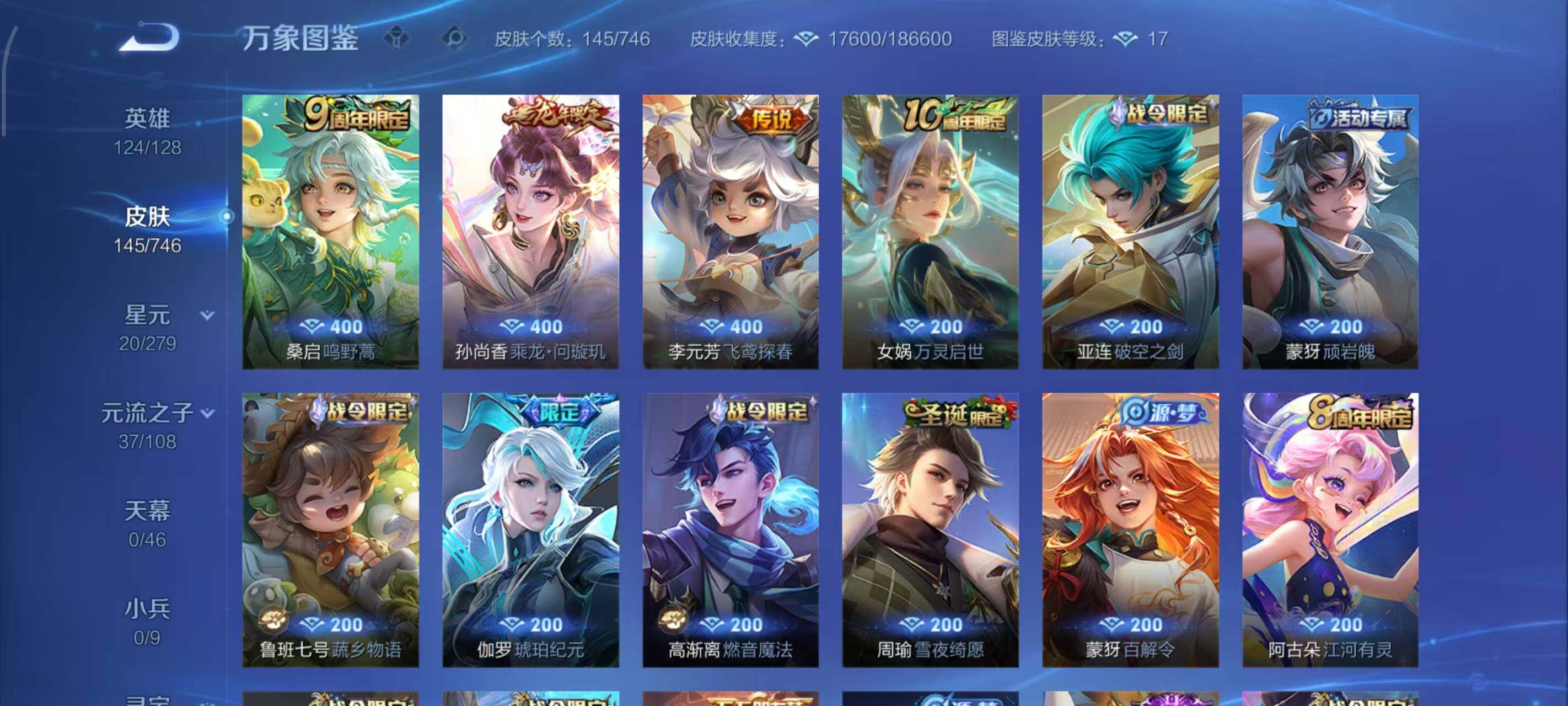 【限定皮肤】:蒙犽顽岩魄,姜子牙天穹之誓,狄仁杰阴阳师,赵云皇家上将,墨子神迹守卫,孙尚香蔷薇恋人,典韦蓝屏警告,达摩星际陆战队,项羽海滩派对,李元芳银河之约,干将莫邪真爱魔法,云中君纤云弄巧,上官婉儿梁祝,嫦娥拒霜思,鲁班大师探海日志,暃星界游侠,艾琳流音漫舞,司空震地狱燃心,阿古朵江河有灵,张良古海寻踪,蒙犽百解令,高渐离燃音魔法,妲己灵卜魔法,鬼谷子天穹祈灯,伽罗琥珀纪元,孙尚香乘龙问璇玑,沈梦溪龙舞盛年,鲁班七号蔬乡物语,李元芳蔬乡物语,刘邦剑破天穹,程咬金群星魔术团,周瑜熔金海岸