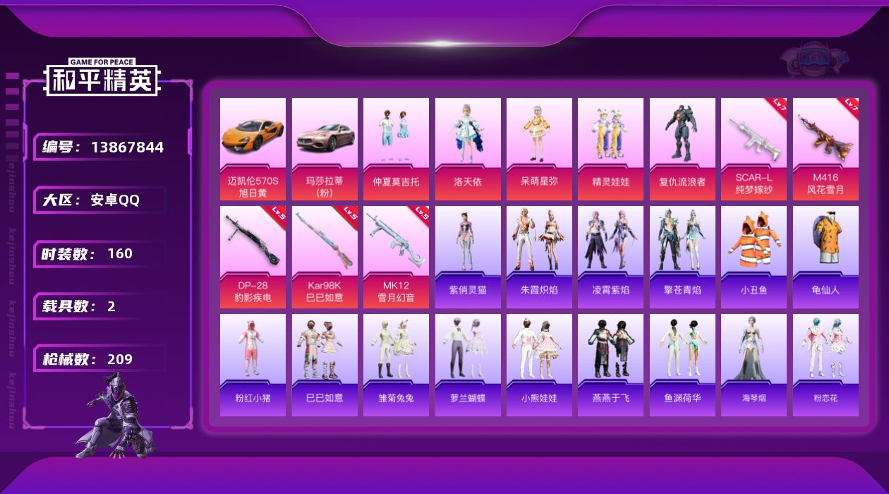 [13867844]安卓 手Q-5粉装-6特效枪-2载具-1粉色飞行器-69103热力值-11王牌印记-160套装-209枪皮