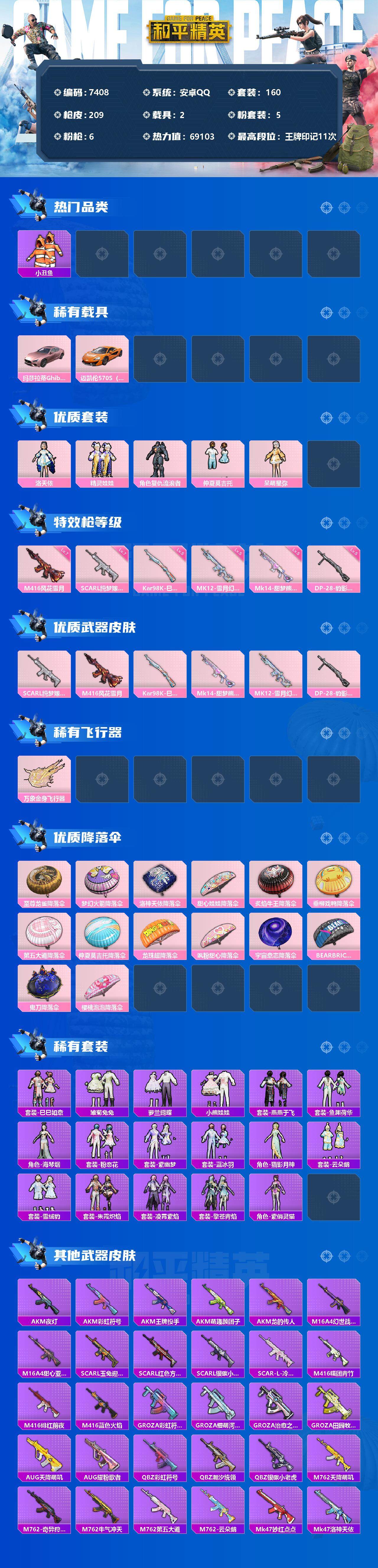 [13867844]安卓 手Q-5粉装-6特效枪-2载具-1粉色飞行器-69103热力值-11王牌印记-160套装-209枪皮 【热门品类】:套装-小丑鱼,套装-龟仙人,套装-粉红小猪 【粉色载具】:玛莎拉蒂Ghibli(粉),迈凯伦570S(旭日黄) 【粉色套装】:角色-洛天依,粉装-精灵娃娃,角色-复仇流浪者,粉装-仲夏莫吉托,角色-呆萌星弥 【粉色枪皮等级】:SCAR-L-纯梦嫁纱(七级),M416-风花雪月(七级),Kar98K-巳巳如意(五级),Mk14-甜梦熊击(五级),MK12-雪月幻音(五级),DP-28-豹影疾电(五级) 【粉色枪皮】:SCAR-L-纯梦嫁纱,M416-风花雪月,Kar98K-巳巳如意,Mk14-甜梦熊击,MK12-雪月幻音,DP-28-豹影疾电 【粉色飞行器】:万象金身飞行器 【粉色降落伞】:至尊龙雀降落伞,梦幻火箭降落伞,洛神天依降落伞,甜心娃娃降落伞,炙焰牛王降落伞,垂柳戏鸭降落伞,第五大道降落伞,仲夏莫吉托降落伞,龙珠超降落伞,飒粉甜心降落伞,宇宙意志降落伞,BEARBRICK降落伞,鬼刀降落伞,樱桃泡泡降落伞 【稀有套装】:套装-龟仙人,套装-巳巳如意,套装-雏菊兔兔,套装-萝兰蝴蝶,套装-小熊娃娃,套装-燕燕于飞,套装-鱼渊荷华,角色-海琴烟,套装-粉恋花,套装-紫幽梦,套装-蓝冰羽,角色-猎影月神,套装-云朵鹅,套装-雪绒豹,套装-朱霞炽焰,套装-凌霄紫焰,套装-擎苍青焰,角色-紫俏灵猫 【稀有枪皮】:AKM-夜灯,AKM-彩虹符号,AKM-王牌投手,AKM-萌趣颜团子,AKM-龙的传人,M16A4-幻世战舞者,M16A4-甜心亚梦,SCAR-L-玉兔迎春,SCAR-L-红色方程式,SCAR-L-银碳小老虎,SCAR-L-冷漠罗丽,M416-糯团青竹,M416-绯红前夜,M416-蓝色火焰,GROZA-彩虹符号,GROZA-懵萌河马,GROZA-治愈之星,GROZA-田园牧歌,AUG-天降萌叽,AUG-耀粉歌者,QBZ-彩虹符号,QBZ-潮汐统领,QBZ-银碳小老虎,M762-天降萌叽,M762-奇异狩猎者,M762-牛气冲天,M762-第五大道,M762-云朵鹅,Mk47-妙红点点,Mk47-洛神天依,Mk47-炫光之旅,G36C-懵萌河马,G36C-暗夜玫瑰,AC-VAL-天降萌叽,AC-VAL-甜心亚梦,蜜獾-天降萌叽,蜜獾-娇憨